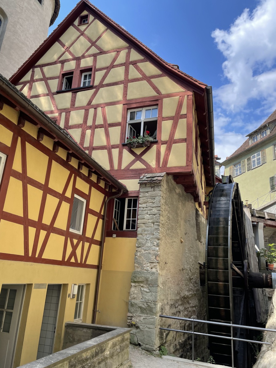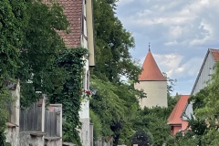 Obwohl wir jetzt schon fast drei Wochen unterwegs sind, vergeht die Zeit immer viel zu schnell. Da wir nicht an einem Tag über Stunden zurück fahren wollen, haben wir 2 Stopps geplant. Als erstes fahren wir nach Dinkelsbühl zum Wohnmobilstellplatz „Auf dem Parkplatz P 2a in Dinkelsbühl“ 49°3´49´´N/10°19´37´´E und bekommen auch einen guten Platz. Wir sind hier sehr Stadt nah und sind schon in 10 Minuten in der Stadt. Dinkelsbühl ist eine Stadt im Landkreis Ansbach in Mittelfranken und liegt an der romantischen Straße. Dinkelsbühl hat die schönste Altstadt Deutschlands und das kann ich nur bestätigen. Das Europäische Kulturdenkmal Dinkelsbühl umfasst die Altstadt mit insgesamt 780 Häusern. Wir sind gespannt. Wir betreten die Stadt durch ein Stadttor von 4 Stadttoren und sind richtig begeistert von dieser malerischen Altstadt. Diese tollen Häuser, hier könnte man sofort einen Film drehen. Wir gehen weiter und sehen, das die schönsten Gebäude rund um den Marktplatz stehen. Hier steht das Rathaus mit dem wunderschönen Löwenbrunnen und im Rathaus ist das Museum über die Geschichte der Stadt. Außerdem das rote Wörnitz Tor mit dem nachträglich aufgesetzten Glockenturm. Gleich um der Ecke gibt es den Weinmarkt mit imposanten Giebelhäusern. Wir besichtigen die Stadtpfarrkirche St. Georg und der Innenraum ist unbedingt sehenswert. Durch die mächtigen Säulen fühlen wir uns wie in einer anderen Zeit. Neben der Kirche steht die Statue vom Priester, Dichter und Schriftsteller Christoph von Schmid, ein erfolgreicher Jugendautor. Nur wenige Meter vom Marktplatz entfernt steht auch die Stauferstele der Stadt. Hier sind die Meilensteine der Stadt sowie die entsprechenden Kaiser und Personen verewigt. Wir gehen weiter und werden auf dem ganzen Weg von so schönen Fachwerkhäusern begleitet. So viele Häuser haben die sogenannten Nasenschilder, die traditionellen Werbeschilder. Eins schöner als das andere. Selbst die Straßenschilder und Geschäftsnamen sind in altdeutscher Schrift. Das gibt dem Stadtkern eine besondere Note. Außerdem sehen den riesigen Kornspeicher, der Herzelhof und das Kinderzech Zeughaus. Rechts und links befinden sich immer wieder kleine mittelalterliche Gassen. Am Seringer Tor mit dem bunten Dach beginnt die Seringer Straße und wir haben das Gefühl die Zeit wäre hier stehen geblieben. Nachdem wir die Altstadt von allen Seiten besichtigt haben, gehen wir auch ein Stück an der historischen Stadtmauer entlang. Die Stadtmauer ist ca. 3,5 Kilometer lang und zählt 16 Türme. Wir bewundern einen Vorbau eines Turms, der wie eine Miniburg aussieht und den Dreigangsturm, Henkersturm und Bäuerlinsturm. Der letzte davon ist eine der schönsten Sehenswürdigkeiten Dinkelsbühl. Der Bäuerlinsturm mit dem prächtigen Fachwerk ist schließlich nicht zufällig das Wahrzeichen von Dinkelsbühl. Außerdem sehenswert ist die alte Stadtmühle am Nördlinger Tor, die gleichzeitig als kleine Festung diente. Wir haben alle Sehenswürdigkeiten und Highlights der Stadt gesehen und können nur sagen, das sich ein Besuch in diesem mittelalterlichen Flair absolut lohnt. Zum Schluss machen wir noch einen Abstecher in den Stadtpark und bewundern den hübsch angelegten Garten mit den Rosen in allen Farben. Alle Pflanzen sind beschriftet und erklärt. Toll. Am Abend sitzen wir noch lange draußen und tauschen uns noch mal über die Schönheit dieser Stadt aus.