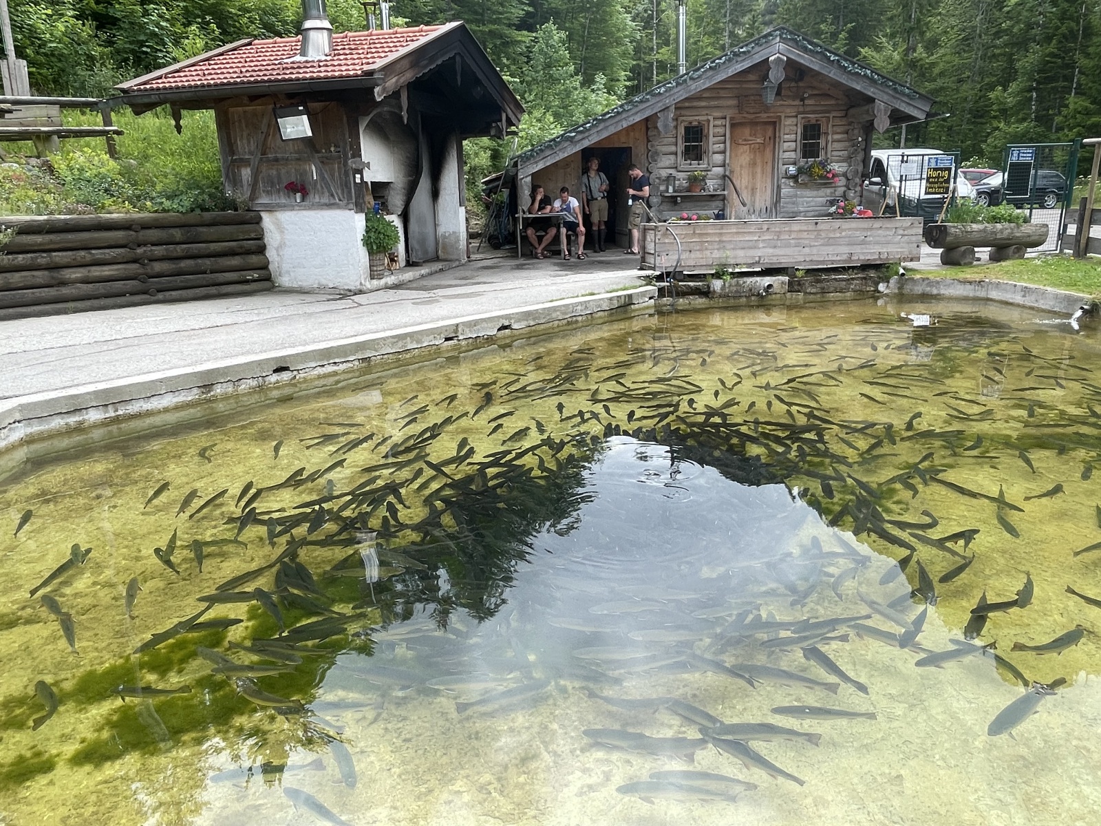 Nach einem netten letzten Abend in Dietramzell sind wir jetzt auf den Weg zur Herzoglichen Fischzucht Wildbad-Kreuth. Ich hatte von dieser Fischzucht in einer Zeitschrift gelesen und da wir gerne geräucherte Forelle essen, kam die Fischzucht Wildbad-Kreuth schnell mit auf unseren Plan. Schnell sind wir da und parken auf einem großen Parkplatz, der auch als Stellplatz ausgezeichnet ist. Von hier überqueren wir einen Fluss und gehen etwa 20 Minuten durch einen Wald bis wir auch schon die ersten Fischbecken sehen. Dann kommen immer mehr Becken und wir lesen, das die Fische in den Becken nach Alter aufgeteilt sind. Es gibt ein kleines Restaurant, einen Räucherofen und ein Verkaufskiosk. Alles nett angelegt inmitten der ganzen Fischbecken. Wir erfahren, das sich die Fischzucht in den vergangenen von einer reinen Fischzucht zu einer kleinen gastronomischen Sehenswürdigkeit am Tegernsee entwickelt hat. Die Kreuther Fischzucht gibt es seit Mitte des 19. Jahrhunderts und wir staunen, was hier los ist. Wanderer, Radfahrer und auch Einheimische lassen sich hier den Fisch schmecken. Es gibt geräucherten Saibling, geräucherte Forelle, geräucherte Lachsforelle und Lachsforelle nach Graved Art. Alle Fischarten aus der eigener Zucht. Im Fischverkauf werden auch Fischsemmeln zum Mitnehmen oder Verzehr vor Ort angeboten. Man erzählt uns, das der europäische Hochadel zur damaligen Zeit in Wildbad Kreuth gastierte. Um die adeligen Gäste mit frischen Forellen zu bewirten, ließen die bayerischen Könige Fischteiche anlegen. Daher der wahrscheinlich der Name. Die Aufnahme vom Besuch in unserem Plan war eine sehr gute Entscheidung. Der Fisch, den wir hier vor Ort gegessen haben war einfach super und die Umgebung sehr nett. Einfach köstlich… Wir entscheiden uns dazu, auch noch Fisch für unser Abendessen mit zu nehmen. Wer Lust hat, kann noch einen Spaziergang nach Siebenhütten unternehmen. Siebenhütten ist ein ideales Ausflugsziel. Gut und bequem erreichbar liegt die Almwirtschaft an der Hofbauernweißach. Auf dem Weg zur Alm finden sich zahlreiche schöne Ruheplätze, die auf einen Sprung ins kühle Nass oder eine kleine Pause im Schatten einladen. Der Name stammt noch aus Zeiten, in denen die sieben Almhütten tatsächlich von sieben Bauern aus Kreuth/Pförn betrieben wurden. Geblieben sind nur noch drei Hütten, von welchen zwei als Lager und eine als urige Brotzeitstation genutzt werden.