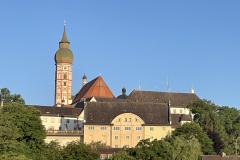 Da wir zum Starnberger See und Ammersee wollen, entscheiden wir uns für den Wohnmobilstellplatz „Kloster Andechs“ 47°58´30´´N/11°11´10´´E. Der Stellplatz liegt zentral zwischen den beiden Seen und wir sind schnell mit dem Fahrrad da. Wir bekommen einen Platz mit Blick auf das Kloster Andechs. Da wir mit unserem Platzticket einen Gutschein für ein Getränk vom Bräustüberl bekommen haben, machen wir uns jetzt auf dem zum Kloster, um nach der Besichtigung den Gutschein einzulösen. Das Kloster Andechs ist ein Benediktinerkloster in der oberbayrischen Gemeinde Andechs. Die Benediktinermönche auf dem „Heiligen Berg Bayerns“ betreuen eine der ältesten Wallfahrten in Bayern. Größter Wirtschaftsbetrieb der Abtei ist die Klosterbrauerei Andechs. Sie ist heute in Deutschland die größte von nur noch wenigen authentischen Klosterbrauereien. Gebraut und abgefüllt wird nur vor Ort in Andechs. Das Bräustüberl des Klosters ist dank seiner Küche und des Bieres aus der Klosterbrauerei ein Magnet für Touristen und Einheimische. Nachdem wir den kleinen Berg erklommen haben, sehen wir uns die Wallfahrtskirche an. Ganz schön beeindruckend. Die Wallfahrtskirche ist ein reines Rokokojuwel. Auch die Seitenkapellen, vor allem die Schmerzhafte Kapelle und die Heilige Kapelle sind sehr interessant. Die Räumlichkeiten des Klosters – wie z. B. die Zellen der Mönche, den Speisesaal, den Kreuzgang und die Bibliothek – können wir nicht besichtigen. Ich wollte noch auf den 600 Meter hohen Turm, aber leider war der Turm geschlossen. Ich hätte sicherlich einen tollen Ausblick von oben gehabt. Wir entdecken noch ein Modellnachbau draußen im Klosterhof. Es gibt auch einen kleinen Klosterladen. Als wir weiter gehen kommen wir an der alten Klosterapotheke vorbei. Noch ein paar Schritte und wir haben auch von hier einen tollen Ausblick. Jetzt haben wir Durst und begeben uns zum Bräustüberl. Hier ist es ganz schön voll, aber wir ergattern noch einen Platz. Das Bräustüberl pflegt seine jahrhundertealte Tradition als Pilgergaststätte. Hier darf jeder seine eigene Brotzeit mitbringen, aber es gibt auch leckere kalte und warme Gerichte. Es gibt eine eigene Klostermetzgerei. Alle Wurstwaren sowie Weißwürste, Regensburger, Wiener, Debreziner, Leberkäse und geräucherte Leberwurst, die für die Mönche und die Gäste in Braustuben und Klostergasthof hergestellt werden, kommen aus der Klostermetzgerei und werden ohne Geschmacksverstärker produziert. Wir holen und Klosterbier und Klosterbierradler und genießen das Andechser Trinkgefühl. Hier lässt es sich aushalten. Wir erfahren, das die Tradition der Pilgergaststätte der klösterliche Tagesrythmus die Schankzeiten bestimmt. Der Ausschank endet zum Nachtgebet der Mönche. Wir dürfen aber noch eine Stunde sitzen bleiben und unsere Getränke genießen. Wir machen uns auf den Weg zurück und wählen den Weg vorbei an den Hochbeeten des Andechser Kräutergartens. Dieser befindet sich im Skulpturenpark des Klosters und wurde als Lehrgarten für Besucher angelegt. Eigentlich wollten wir auch die Klosterbrauerei besichtigen, aber dafür hätten wir uns früher anmelden müssen. Aber wir dürfen uns das Gelände auch so mal ansehen. Die Klosterbiere werden im traditionellen Mehrfach-Maischverfahren ausschließlich in Andechs gebraut. Ich bin kein Biertrinker, aber dieses Bier ist wirklich lecker.