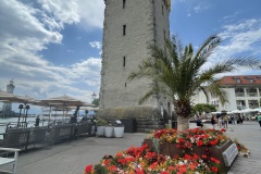 Bevor wir den Bodensee verlassen, fahren wir noch nach Lindau. Lindau ist eine Mittelstadt in Bayern am Bodensee. Der historische Stadtkern mit der Maximilianstraße im Zentrum liegt auf einer Insel im östlichen Teil des Bodensees. Die Insel ist durch eine Straßenbrücke und den Lindauer Eisenbahndamm mit den Stadtteilen auf dem Festland verbunden. Wahrzeichen der Stadt sind ein Leuchtturm und eine 6 Meter hohe Löwenfigur am Stadthafen.Wir finden schnell einen Parkplatz in der Nähe vom Eisenbahndamm. Von hier aus gibt es einen guten Ausgeschilderten Weg zum Stadthafen und und nach 20 Minuten sind wir auch schon. Wir kommen direkt am Bahnhof an und gehen zuerst zum Hafen. Hier sehen wir auch schon die Schiffe, die unter anderem von Bregenz, Rorschach und Friedrichshafen hier anlegen. Wir spazieren weiter und sehen entlang der Hafenmauer Bilder der Stadtgeschichte. Diese schauen wir uns an und lesen uns zum Teil die interessante Berichte durch. Dann machen wir uns auf den Weg zum Löwen. Je dichter wir kommen, je mehr wird und bewusst, das 6 Meter ganz schön hoch sind. Der Löwe sitzt auf seinen Vorderpranken gestützt auf einem dreistufigen Podest und blickt zum Schweizer Ufer. Gegenüber sehen wir den 33 Meter hohen Leuchtturm. Wer Lust hat, kann die 139 Stufen hinauf steigen und wird mit einen super Rundumblick belohnt. Wir gehen einmal um den Löwen herum und haben von allen Seiten einen tollen Blick auf den Bodensee, den Österreicher und Schweizer Alpen oder auf die Stadt Lindau. Wir gehen langsam wieder zurück und beobachten das Treiben hier am Hafen. Hin und wieder sehen wir ein Zeppelin am Himmel. Hier an der Seepromenade entdecken wir den 20 Meter hohen Mangturm. Der Mangturm ist ein quadratischer Steinbau und wurde ursprünglich als Teil der mittelalterlichen Stadtbefestigung errichtet und war früher nur über eine Zugbrücke erreichbar. Das Dach ist mit sehr markanten glasierten Ziegeln gedeckt, die herrlich in der Sonne glitzern. Dann gehen wir durch eine Gase und kommen direkt am 600 Jahre alten Rathaus raus. Durch seine farbenfrohe Fassade fällt dieses eindrucksvolle Gebäude sofort auf. Die Fassade erzählt unter anderem von der Geschichte als Maximilian I. 1496 zum Reichstag in den holzgetäfelten Ratssaal ein berief. Von da aus gehen wir zur Maximilianstraße, eine 230 Meter lange Promenade von der aus hin und wieder kleine verwinkelte Gassen abgehen. Es viele Patrizierhäuser mit Giebelkränen und Dachgauben. Die kunstvollen Wand- und Deckenbemalungen erzählen die oftmals facettenreichen Geschichten ihrer ehemaligen Bewohner. Am Ende der Straße gehen wir wieder am Damm entlang zurück zum Parkplatz und fahren nach Wangen zum Wohnmobilstellplatz „Wangen im Allgäu“ 47°40´46´´N/9°49´57´´E. Hier werden wir übernachten und morgen weiterfahren.