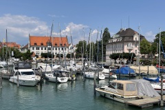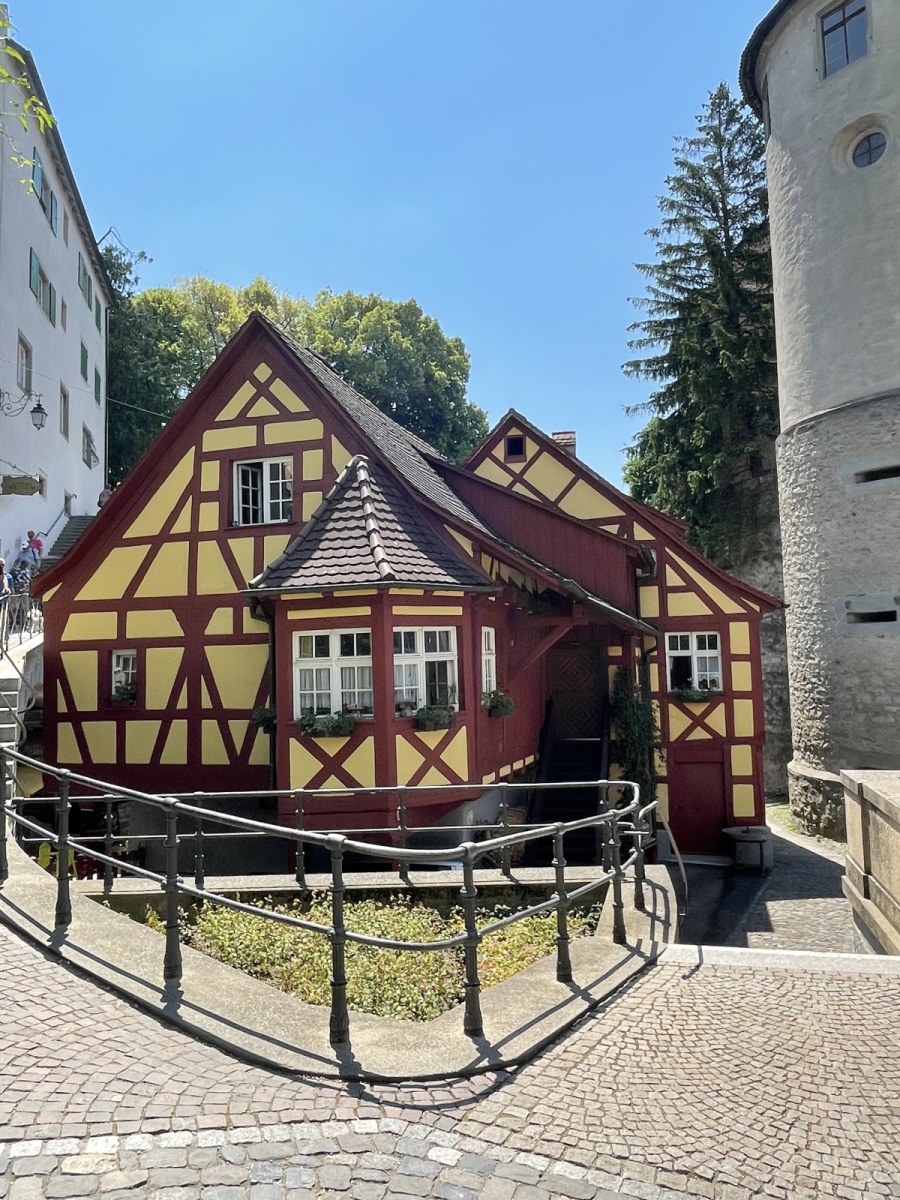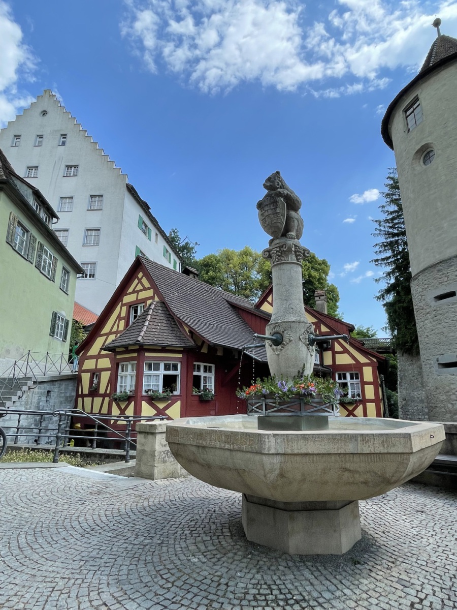 Meersburg ist herrlich gelegen und hat viele romantische Winkel. Hier können wir Museen ansehen, Stadtgeschichte kennen lernen und Luftfahrgeschichte erleben. Wir haben vom Boot aus einen super Blick auf Meersburg und freuen uns schon auf den Stadtrundgang. Zurück auf dem Land gehen wir die Seepromenade entlang bis zum Gredhaus. Von hier aus haben wir einen tollen Blick auf die Magische Säule am Hafen. Die sehen wir und genau an, denn diese Säule zeigt satirische Portraits bekannter Persönlichkeiten von Meersburg. An der Uferpromenade sehen wir den Reithof/Staatsweingut und das Droste-Hülshoff-Gymnasium. Zwei sehr schöne Gebäude. Wir gehen hier die Stufen hoch und haben von oben einen Ausblick über den Bodensee. Weiter geht es zum Fürstenhäusle, ein kleines rotes Haus oben auf den dem Weinberghang, zum Alten und zum Neuen Schloss mit Schlosskirche und dann zur Burg Meersburg. Die sehen wir uns genauer an. Die Burg sieht nicht nur von außen beeindruckend aus. Sie ist es auch von innen. Dicke Wände, alte Holzdielen, alte Möbel und Waffen geben eine ritterliche Atmosphäre. Nach der tollen Burgbesichtigung schlendern wir weiter durch die Altstadt, entdecken unter anderem noch das Zeppelinmuseum, das Rathaus, das Unterstadttor, den Schnabelgiere-Brunnen, ein riesiges Mühlrad der Schlossmühle und kommen am Ende am Obertor wieder raus. Unterwegs sehen wir uralte Gebäude und so schöne Fachwerkhäuser mit bunten bepflanzten Blumenkästen. Besonders sehenswert ist die Steigstraße, die Winzergasse und die Kirchstraße. Langsam schlendern wir wieder zurück zum Platz.
