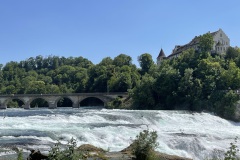 Es geht weiter denn wir wollen noch zum Rheinfall. Er gehört zu den drei größten Wasserfällen in Europa und befindet sich in der Schweiz auf dem Gebiet der Gemeinden Neuhausen am Rheinfall im Kanton Schaffhausen rechts und Laufen-Uhwiesen im Kanton Zürich links, rund vier Kilometer westlich unterhalb der Stadt Schaffhausen. Er hat eine Höhe von 23 Meter und eine Breite von 150 Meter. Vom Schlösschen Wörth kann man mit Ausflugsbooten dicht an den Rheinfall heranfahren. Vom Parkplatz aus gehen wir runter zum Rhein und gehen bis zum Wasserfall am Rhein entlang. Hier haben wir den ganzen Weg entlang eine Panoramasicht auf den Rheinfall. Von hier aus haben wir außerdem einen guten Blick auf das Schloss Laufen, das auf der anderen Seite liegt. Wir gehen hoch bis zum Mühlenradhaus mit der alten Wassermühle und von da zu einer Aussichtsplattform. Hier sehen wir die Rheinbrücke und den Wasserfall von oben. Das ist schon ein grandioses Schauspiel wie die gewaltigen Wassermassen über über die Felsen hinunter stürzt. Wir waren schon zwei mal hier, aber man sich den Rheinfall immer wieder ansehen.