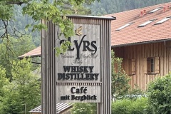 Des weiteren entdecken wir die Slyrs Whisky Destillerie. Wir halten an und sehen uns die Brennerei an. Da es schon spät ist, können wir sie nicht mehr besichtigen. Wir erfahren, das die Whisky Brennerei zu den bekanntesten deutschen Whiskybrennereien gehört. Der erste Whisky floss bereits 1999 aus den Brennblasen der Traditionsbrennerei Lantenhammer, aber seit 2007 ist der Slyrs Whisky in der eigenen, neu errichteten Slyrs Brennerei in Neuhaus zuhause. Uns werden zwei riesige Malzbehälter mit einem Fassungsvermögen von jeweils rund 30 Tonnen gezeigt, die hier im Freien vor der Slyrs Brennerei aufgestellt sind. Von diesen Silos aus wandert das Malz, das fertig angeliefert wird, in die Mühle. Es wird über Buchenholz geräuchert. Aus dem erhaltenen Schrot wird im Maischebottich (ebenfalls aus Edelstahl) mit 70 Grad heißem Wasser der Zucker ausgewaschen, der bei der anschließenden Gärung in Alkohol umgewandelt wird. Als Wasserquelle nutzt Slyrs die in der Nähe befindliche Bannwaldquelle, die mit Gebirgswasser gespeist wird. Das ist natürlich sehr nett, das man uns eine kleine Einführung gibt.