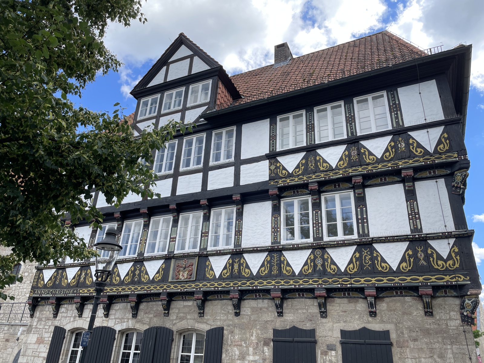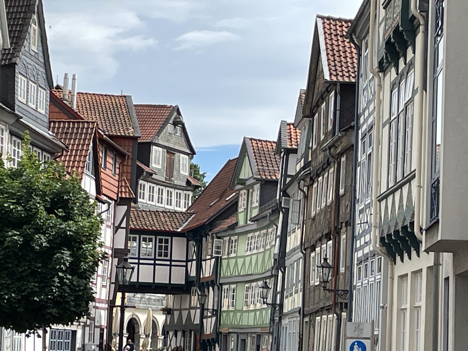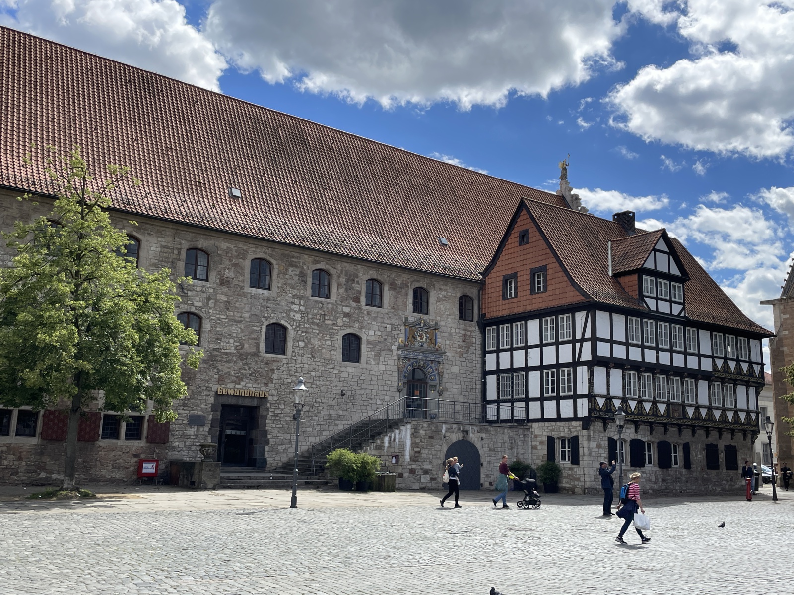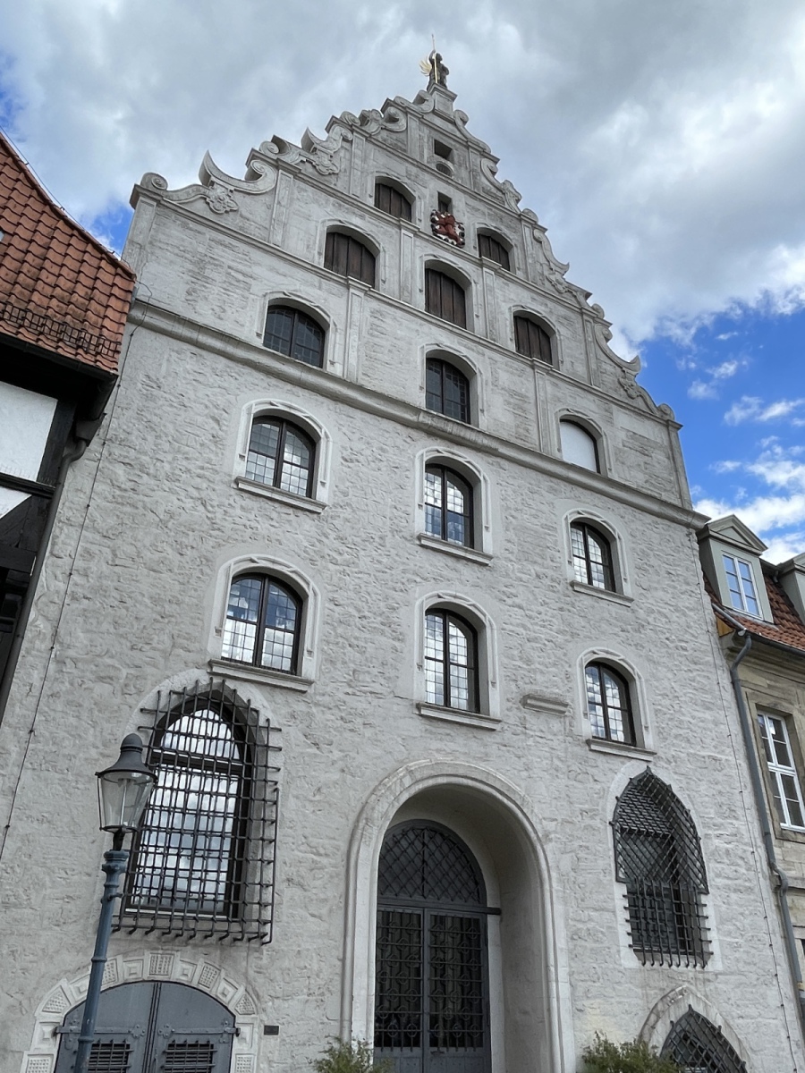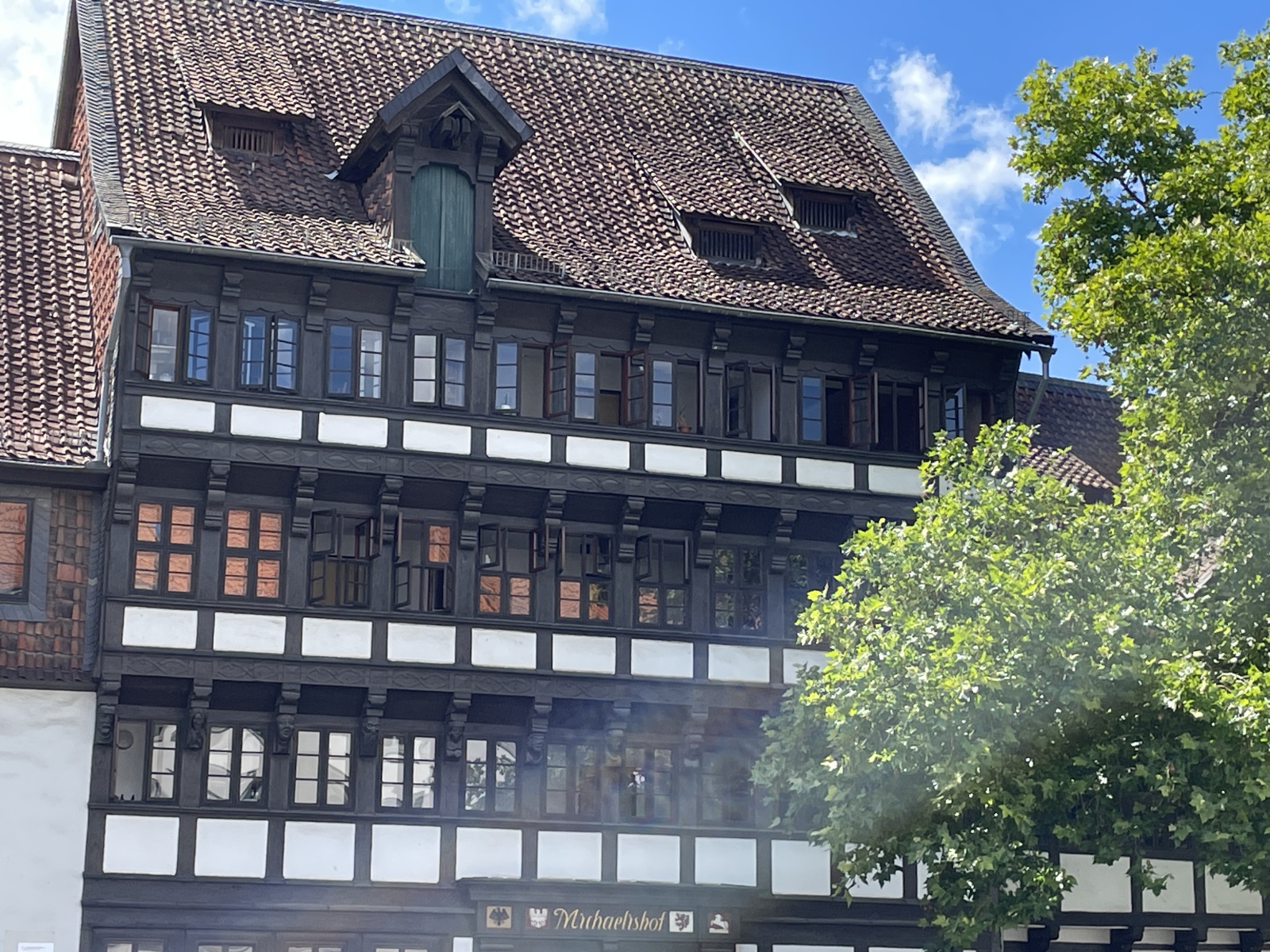 Weiter geht es zum Michaelisviertel. Zentrum des historischen Teil ist die Michaeliskirche. Hier in der Altstadt sehen wir sehr viele verschiedene wertvolle Gebäude und meistens Fachwerkhäuser. Immer wieder erkennen wir tolle Schnitzereien an den Balken und aufwendige Fassaden. So schöne Häuser reihen sich dicht an dicht in den Straßen. Ein besonderes Haus ist das Prediger-Witwenhaus. Ein Mauerrest weist auf die alte Befestigung der Stadt hin. Dann dürfen wir durch eine offene Tür in eine alte Turnhalle schauen. So kenne ich die Turnhallen noch aus meiner Schulzeit.
