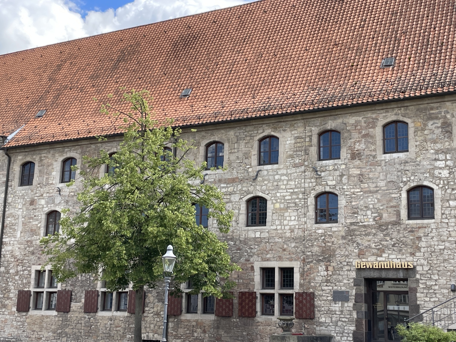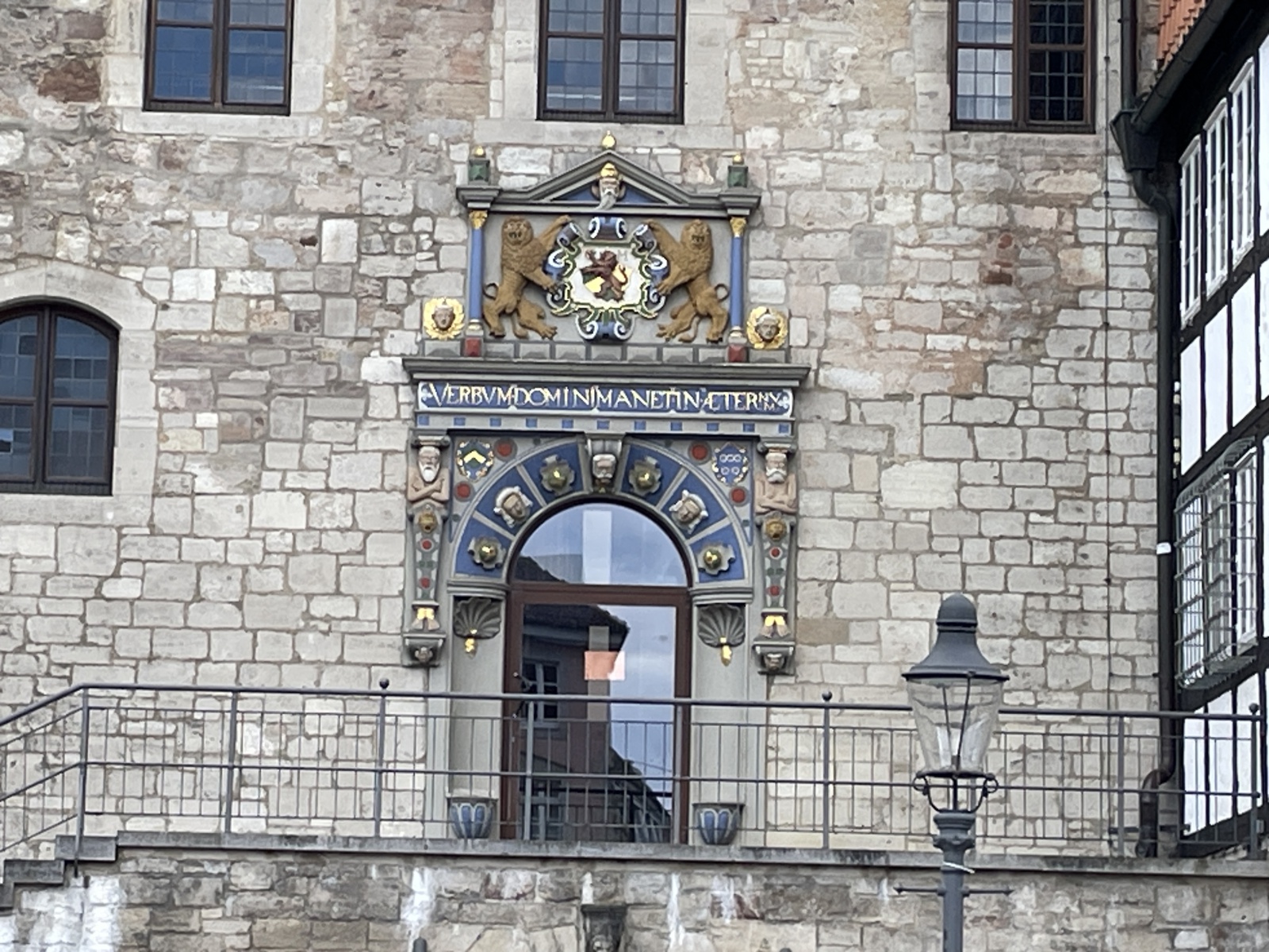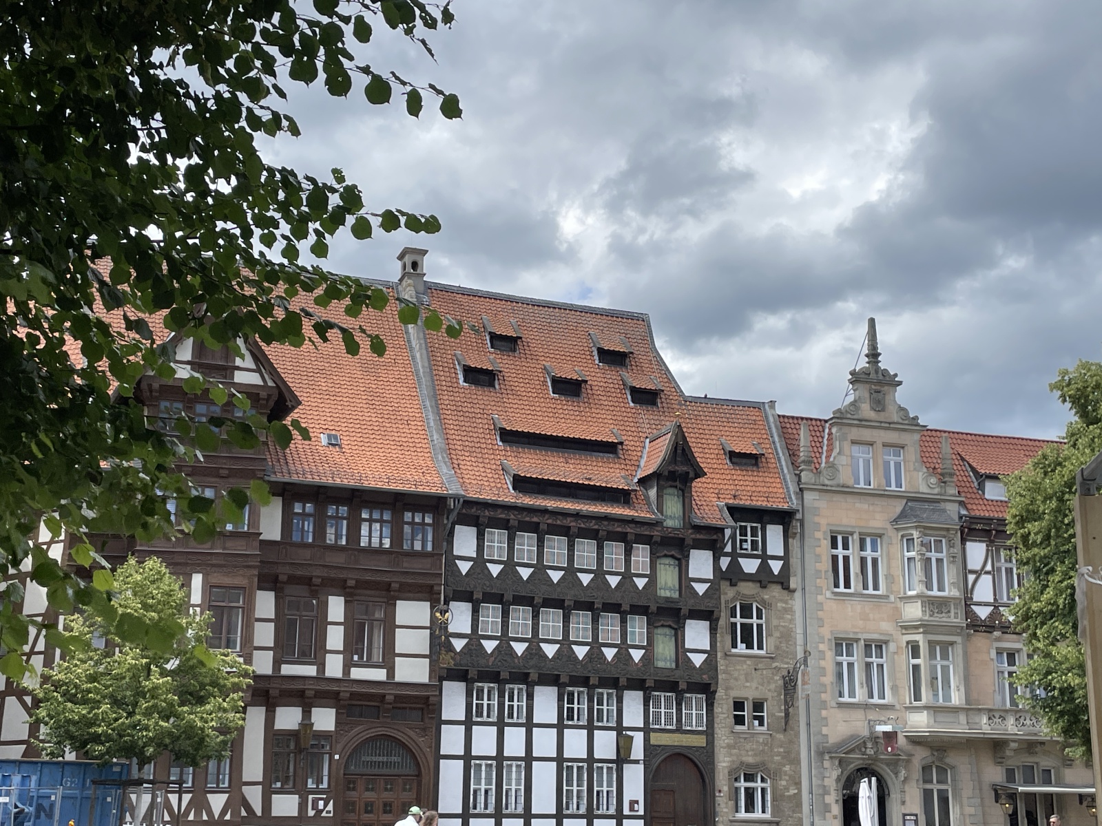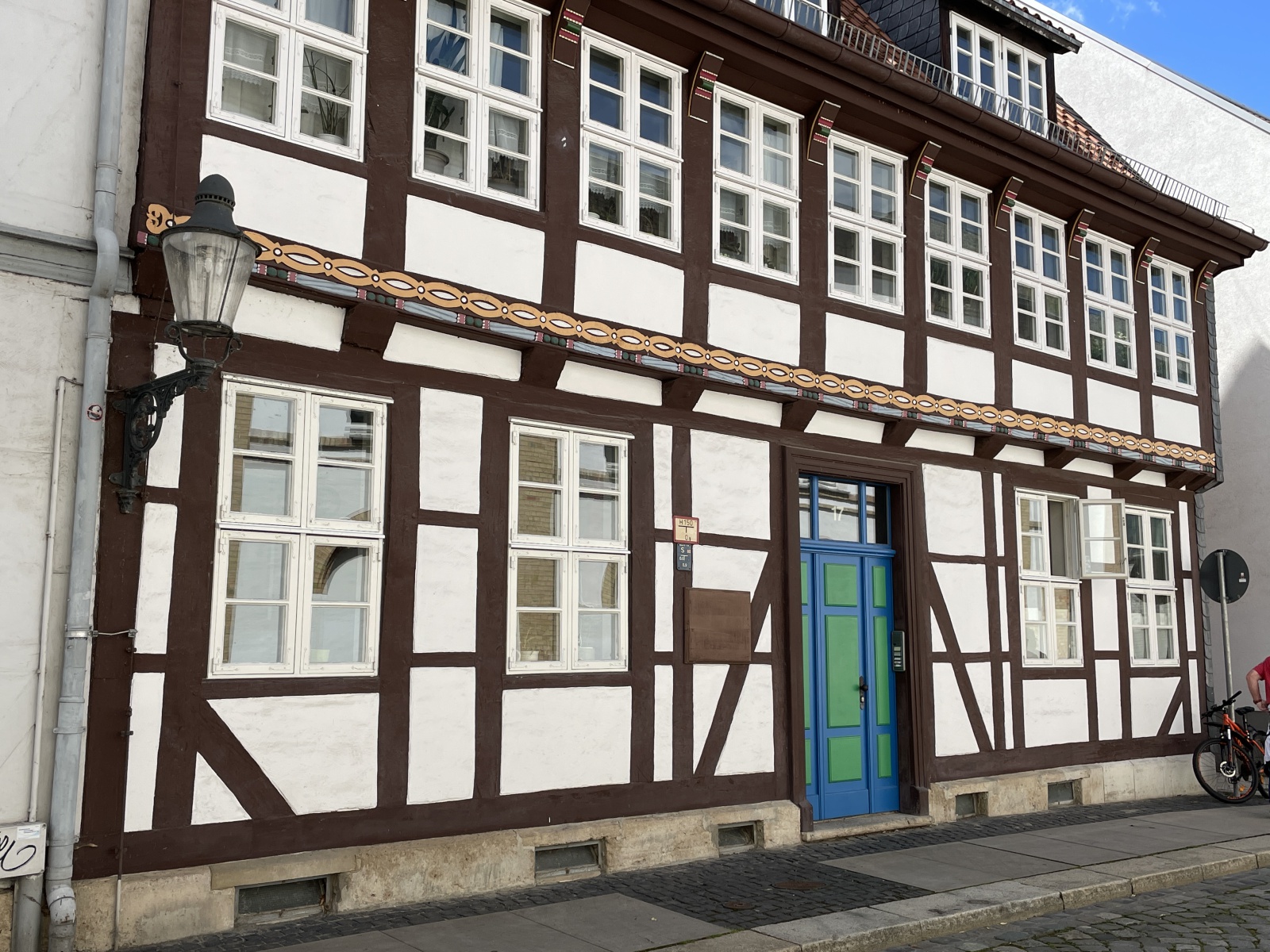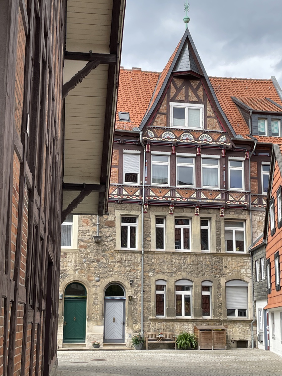 Weiter geht es zum Michaelisviertel. Zentrum des historischen Teil ist die Michaeliskirche. Hier in der Altstadt sehen wir sehr viele verschiedene wertvolle Gebäude und meistens Fachwerkhäuser. Immer wieder erkennen wir tolle Schnitzereien an den Balken und aufwendige Fassaden. So schöne Häuser reihen sich dicht an dicht in den Straßen. Ein besonderes Haus ist das Prediger-Witwenhaus. Ein Mauerrest weist auf die alte Befestigung der Stadt hin. Dann dürfen wir durch eine offene Tür in eine alte Turnhalle schauen. So kenne ich die Turnhallen noch aus meiner Schulzeit.