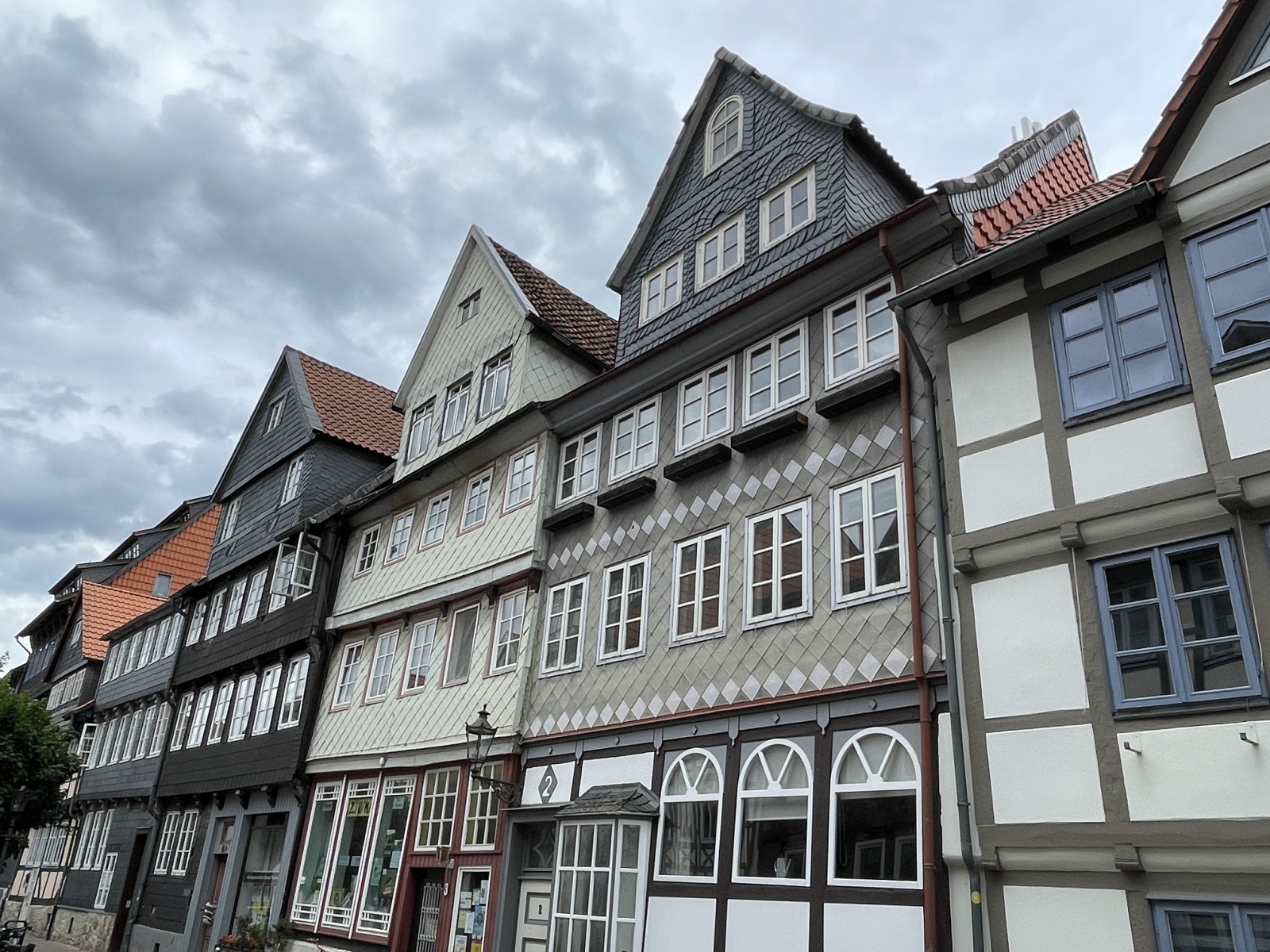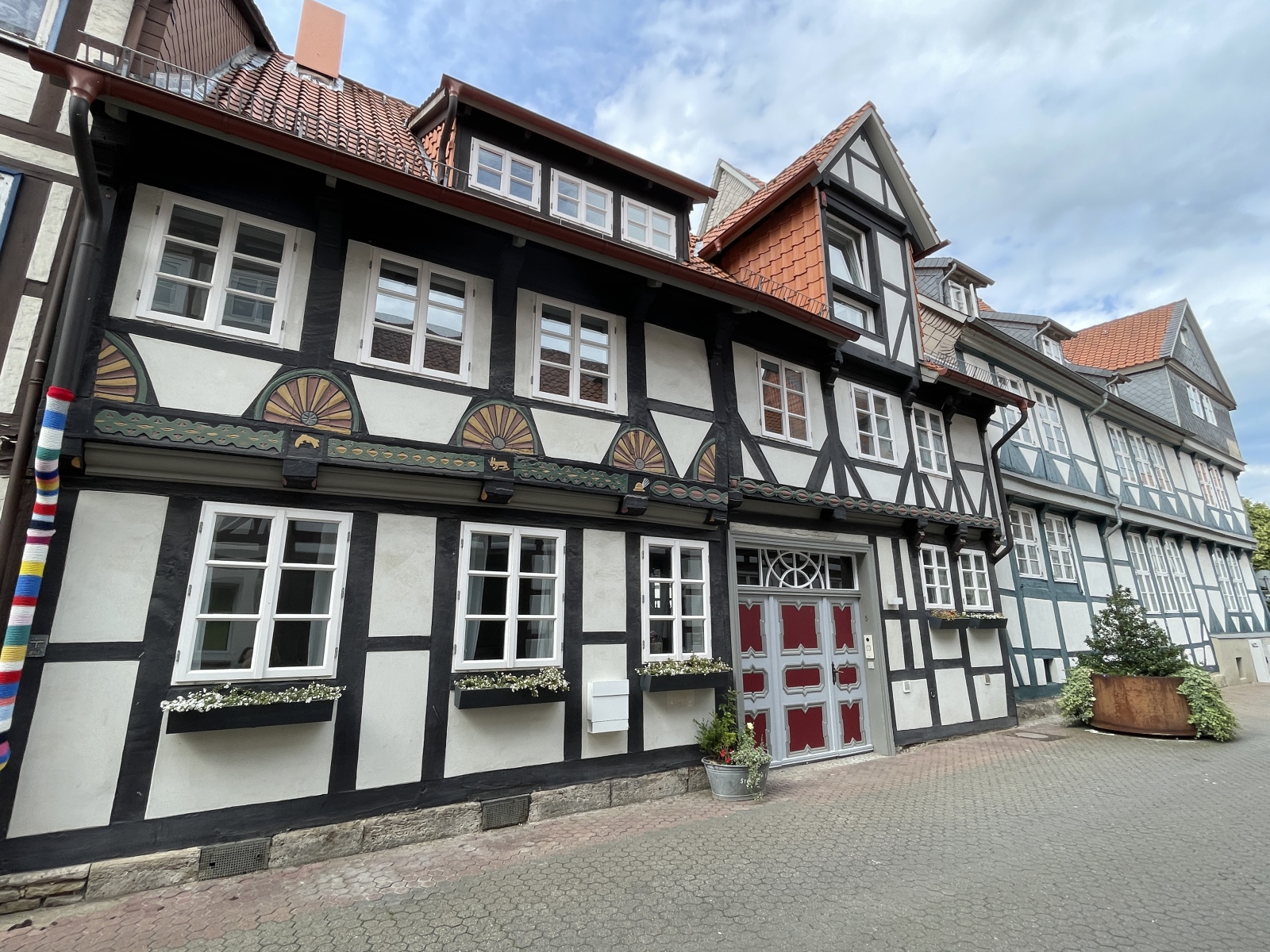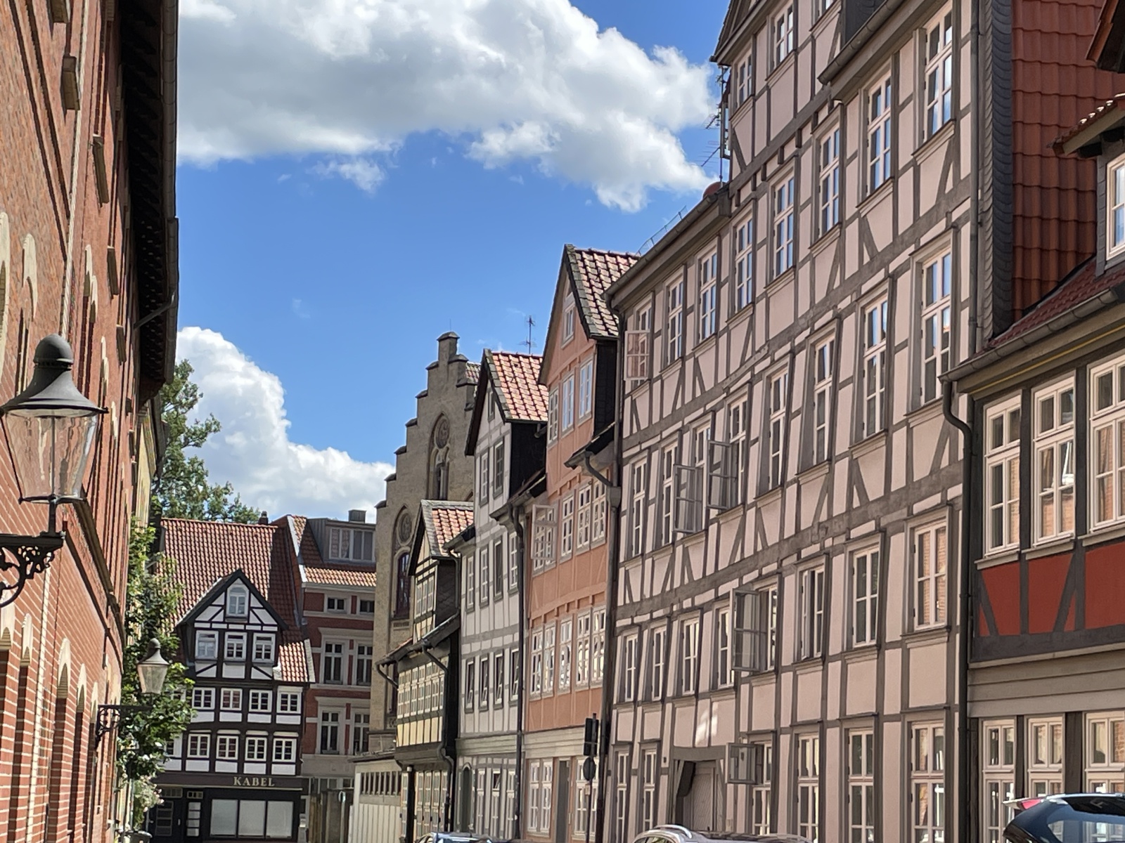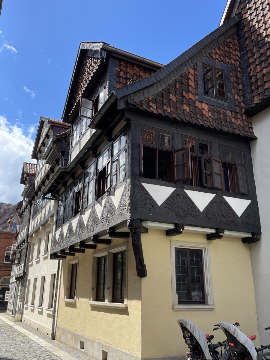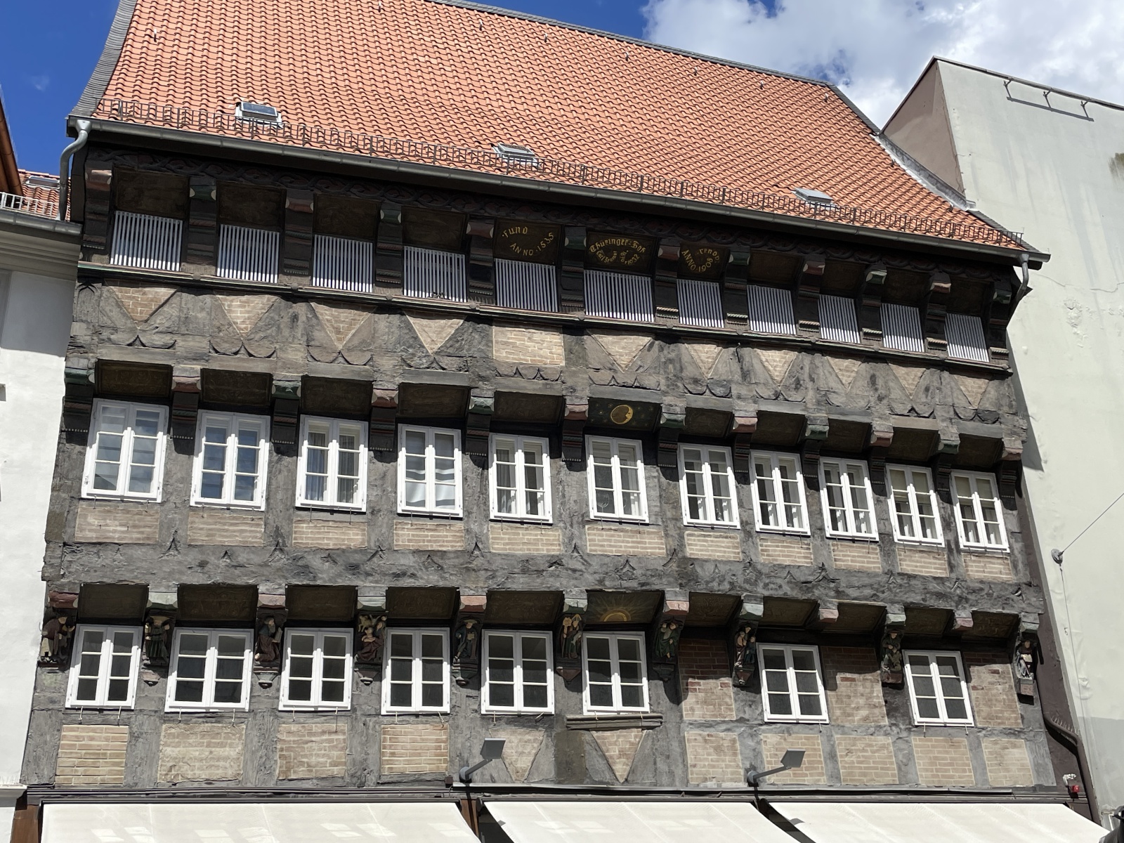 Weiter geht es zum Michaelisviertel. Zentrum des historischen Teil ist die Michaeliskirche. Hier in der Altstadt sehen wir sehr viele verschiedene wertvolle Gebäude und meistens Fachwerkhäuser. Immer wieder erkennen wir tolle Schnitzereien an den Balken und aufwendige Fassaden. So schöne Häuser reihen sich dicht an dicht in den Straßen. Ein besonderes Haus ist das Prediger-Witwenhaus. Ein Mauerrest weist auf die alte Befestigung der Stadt hin. Dann dürfen wir durch eine offene Tür in eine alte Turnhalle schauen. So kenne ich die Turnhallen noch aus meiner Schulzeit.