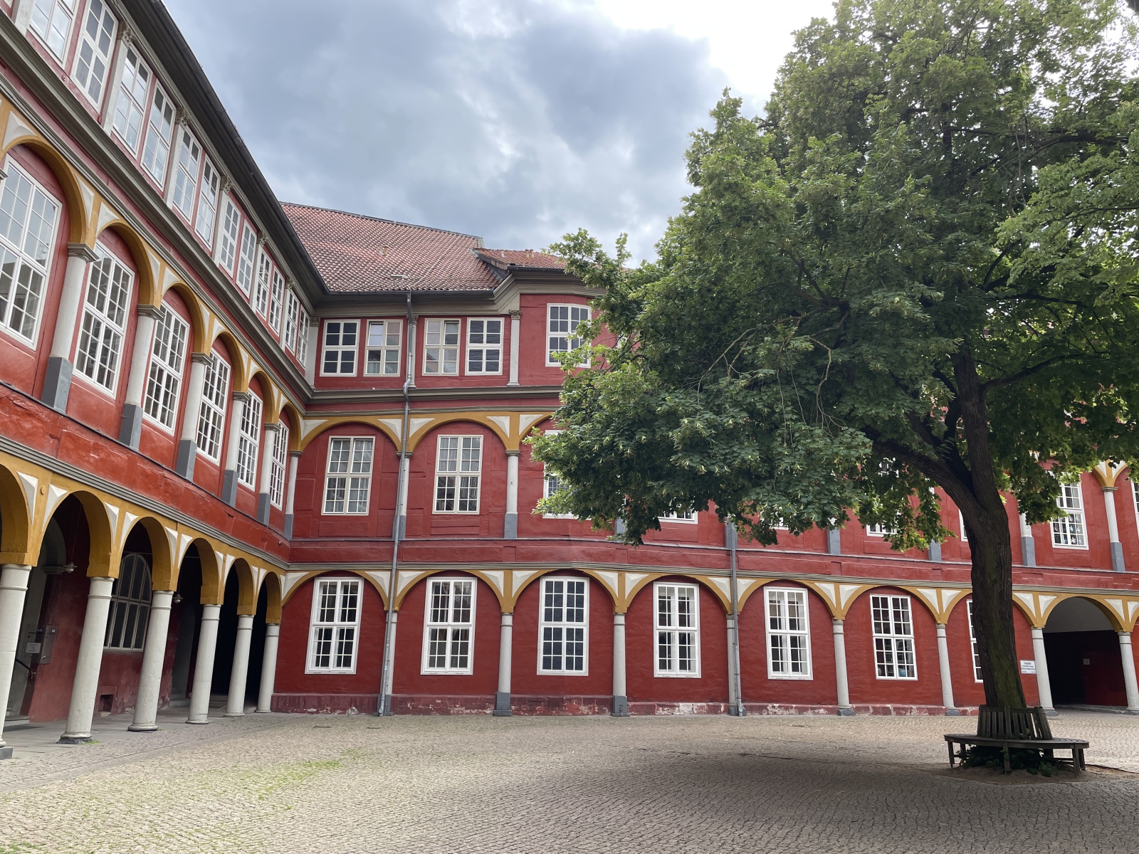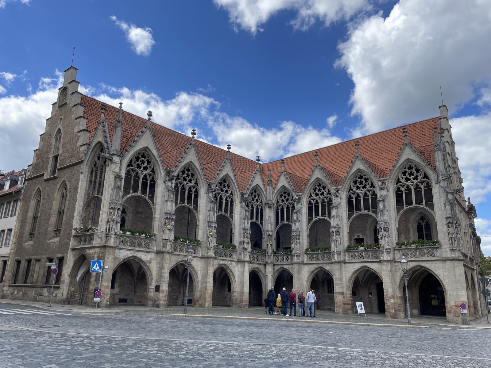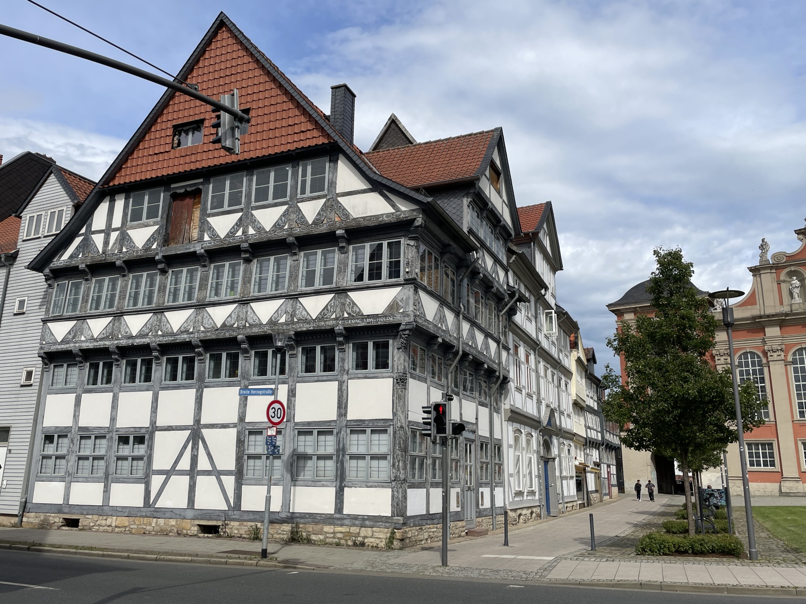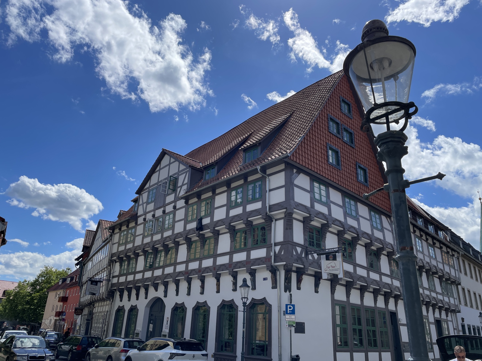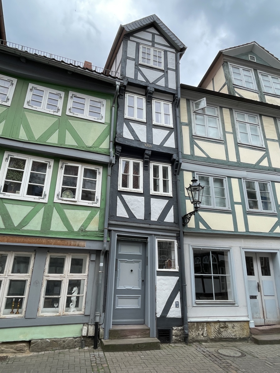 Weiter geht es zum Michaelisviertel. Zentrum des historischen Teil ist die Michaeliskirche. Hier in der Altstadt sehen wir sehr viele verschiedene wertvolle Gebäude und meistens Fachwerkhäuser. Immer wieder erkennen wir tolle Schnitzereien an den Balken und aufwendige Fassaden. So schöne Häuser reihen sich dicht an dicht in den Straßen. Ein besonderes Haus ist das Prediger-Witwenhaus. Ein Mauerrest weist auf die alte Befestigung der Stadt hin. Dann dürfen wir durch eine offene Tür in eine alte Turnhalle schauen. So kenne ich die Turnhallen noch aus meiner Schulzeit.