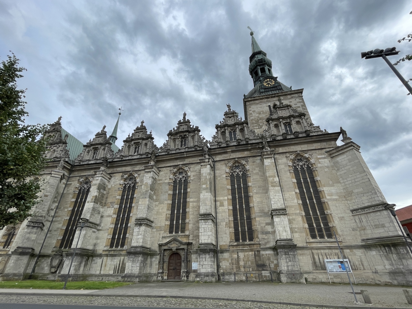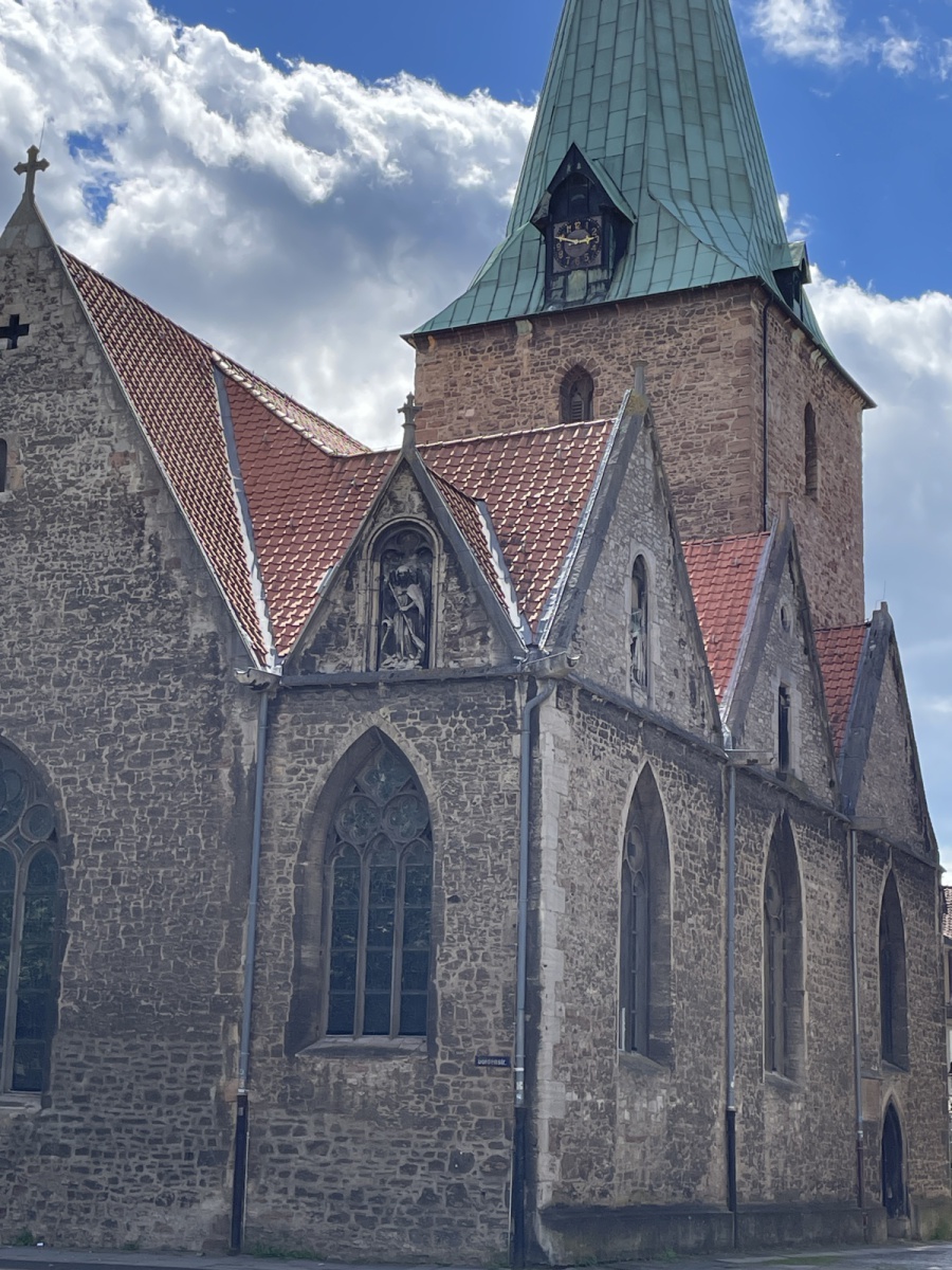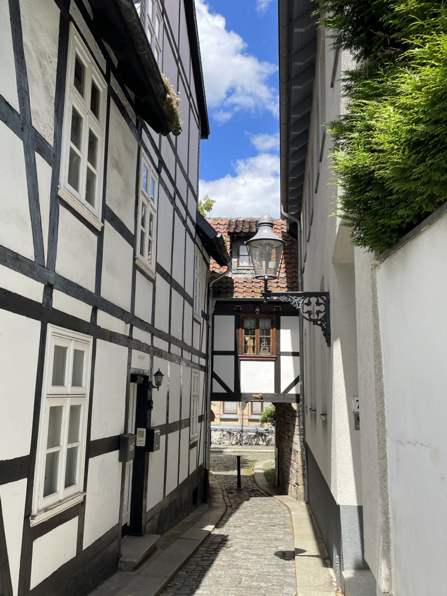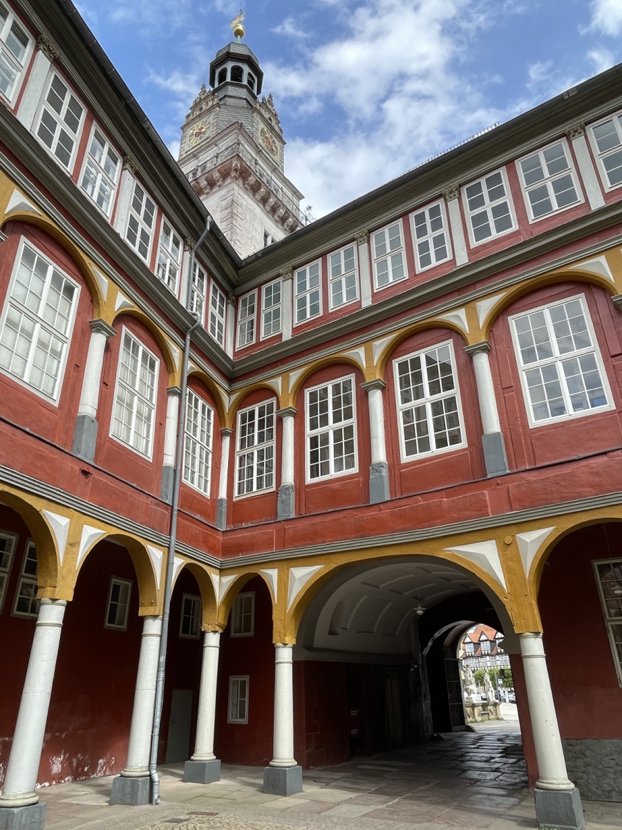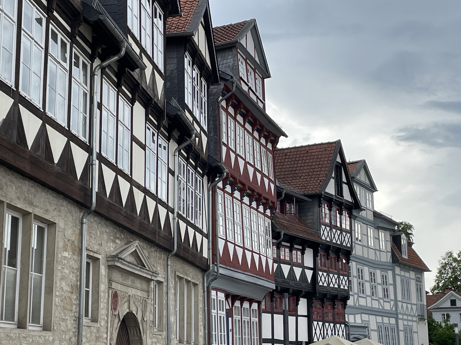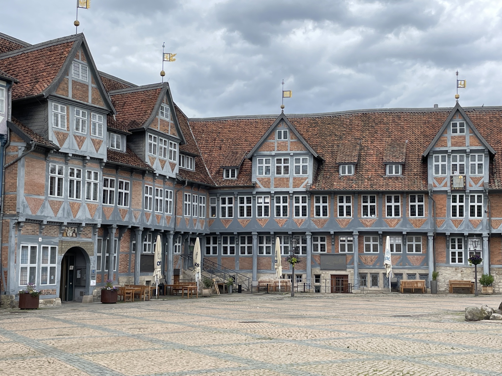 Weiter geht es zum Michaelisviertel. Zentrum des historischen Teil ist die Michaeliskirche. Hier in der Altstadt sehen wir sehr viele verschiedene wertvolle Gebäude und meistens Fachwerkhäuser. Immer wieder erkennen wir tolle Schnitzereien an den Balken und aufwendige Fassaden. So schöne Häuser reihen sich dicht an dicht in den Straßen. Ein besonderes Haus ist das Prediger-Witwenhaus. Ein Mauerrest weist auf die alte Befestigung der Stadt hin. Dann dürfen wir durch eine offene Tür in eine alte Turnhalle schauen. So kenne ich die Turnhallen noch aus meiner Schulzeit.