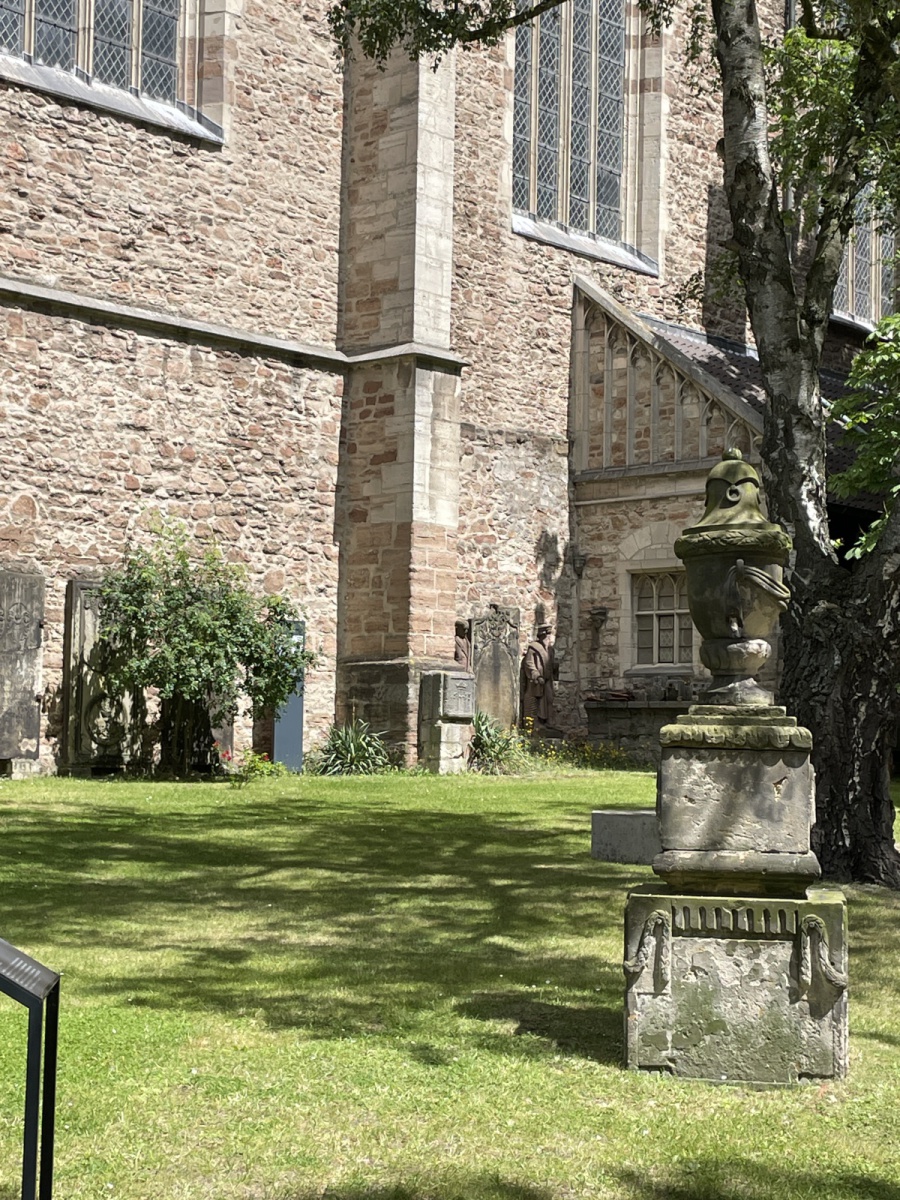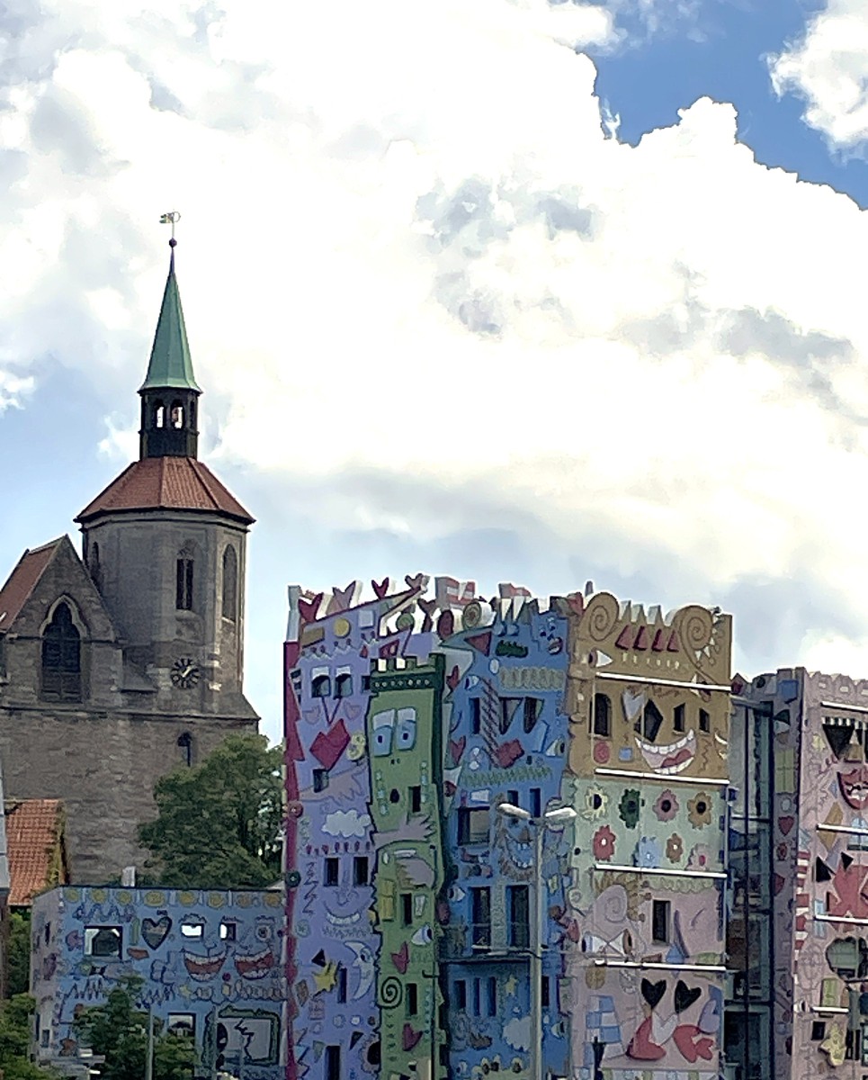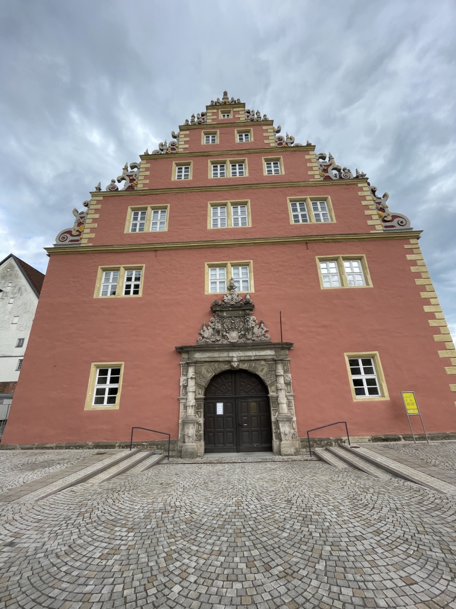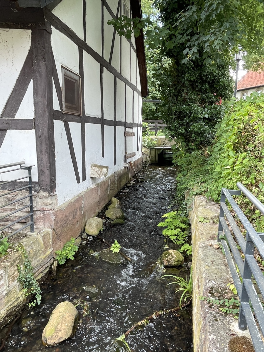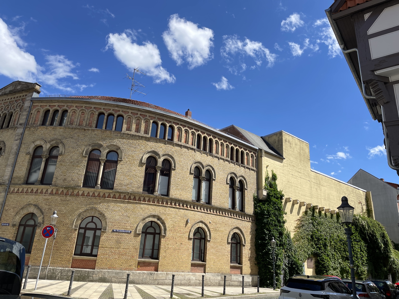 Weiter geht es zum Michaelisviertel. Zentrum des historischen Teil ist die Michaeliskirche. Hier in der Altstadt sehen wir sehr viele verschiedene wertvolle Gebäude und meistens Fachwerkhäuser. Immer wieder erkennen wir tolle Schnitzereien an den Balken und aufwendige Fassaden. So schöne Häuser reihen sich dicht an dicht in den Straßen. Ein besonderes Haus ist das Prediger-Witwenhaus. Ein Mauerrest weist auf die alte Befestigung der Stadt hin. Dann dürfen wir durch eine offene Tür in eine alte Turnhalle schauen. So kenne ich die Turnhallen noch aus meiner Schulzeit.