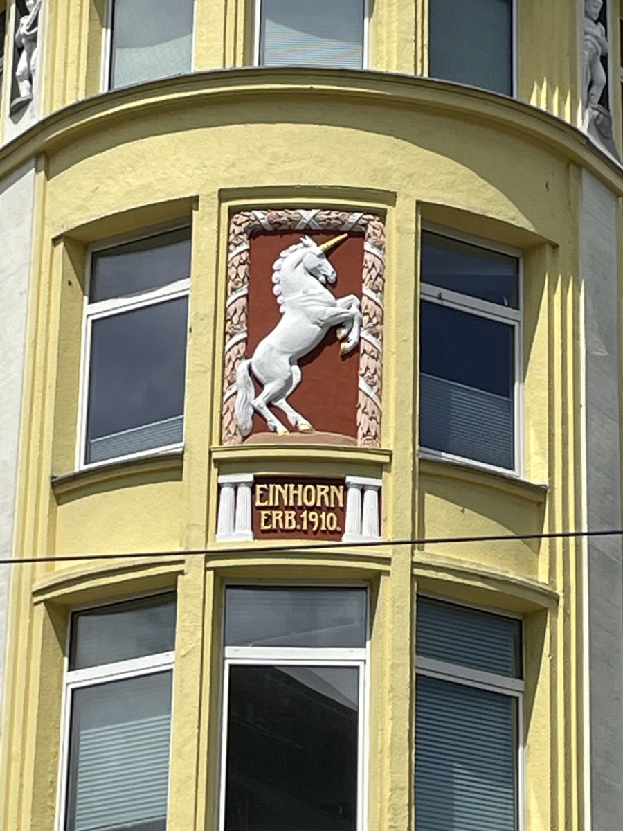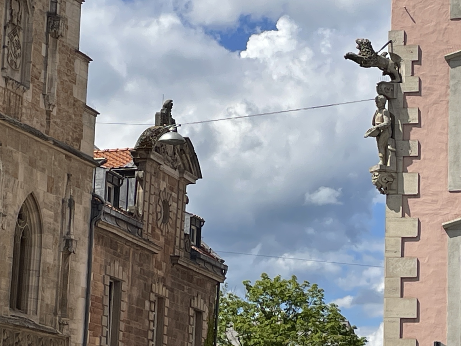 Unsere letzte Station unseres Rundgangs ist das Aegidienviertel. Im Zentrum steht die Aegidienkirche. Sie diente ursprünglich als Gotteshaus des Benedikterklosters. Wir hätten gerne diese Kirche von innen besichtigt, aber leider war sie nicht geöffnet. Auf dem Gelände der Klosterfreiheit wurde der Aegidienmarkt als Marktplatz des mittelalterlichen Stadtteils Altewiek angelegt. Es kamen kleinbürgerliche Wohnhäuser mit unterschiedlichen Gebäuden in schmalen Gassen dazu. Das macht die Eigenart dieses Quartiers aus. Das kleine abgelegene Othilienteil konnte früher nur über eine Brücke erreicht werden. Hier stehen kleine Fachwerkhäuser dicht gedrängt aneinander und sogar die Gassen zur Kirche wurden überbaut. An einigen Häusern sehe wir Schriftbänder und figürlichem Schnitzwerke versehen. Sie erinnern an historischen Traditionen. Auf dem Rückweg zum Platz entdecken wir noch das eine oder andere schöne Haus mit tollen geschnitzten Figuren an der Fassade, im Straßenpflaster das Symbol der Narrenkappe von Till Eulenspiegel und ein weißes Einhorn an einer Hausfassade. Wir gehen wieder durch den Bürgerpark zurück zum Platz. 4 Stunden Stadtbesichtigung reichen für heute. Aber wir haben überhaupt nicht gemerkt, wie die Zeit vergangen ist. Es gab aber auch sehr viel zu sehen und zu bestaunen. Wir waren überrascht von der Vielfalt der Sehenswürdigkeiten hier in der Löwenstadt Braunschweig.