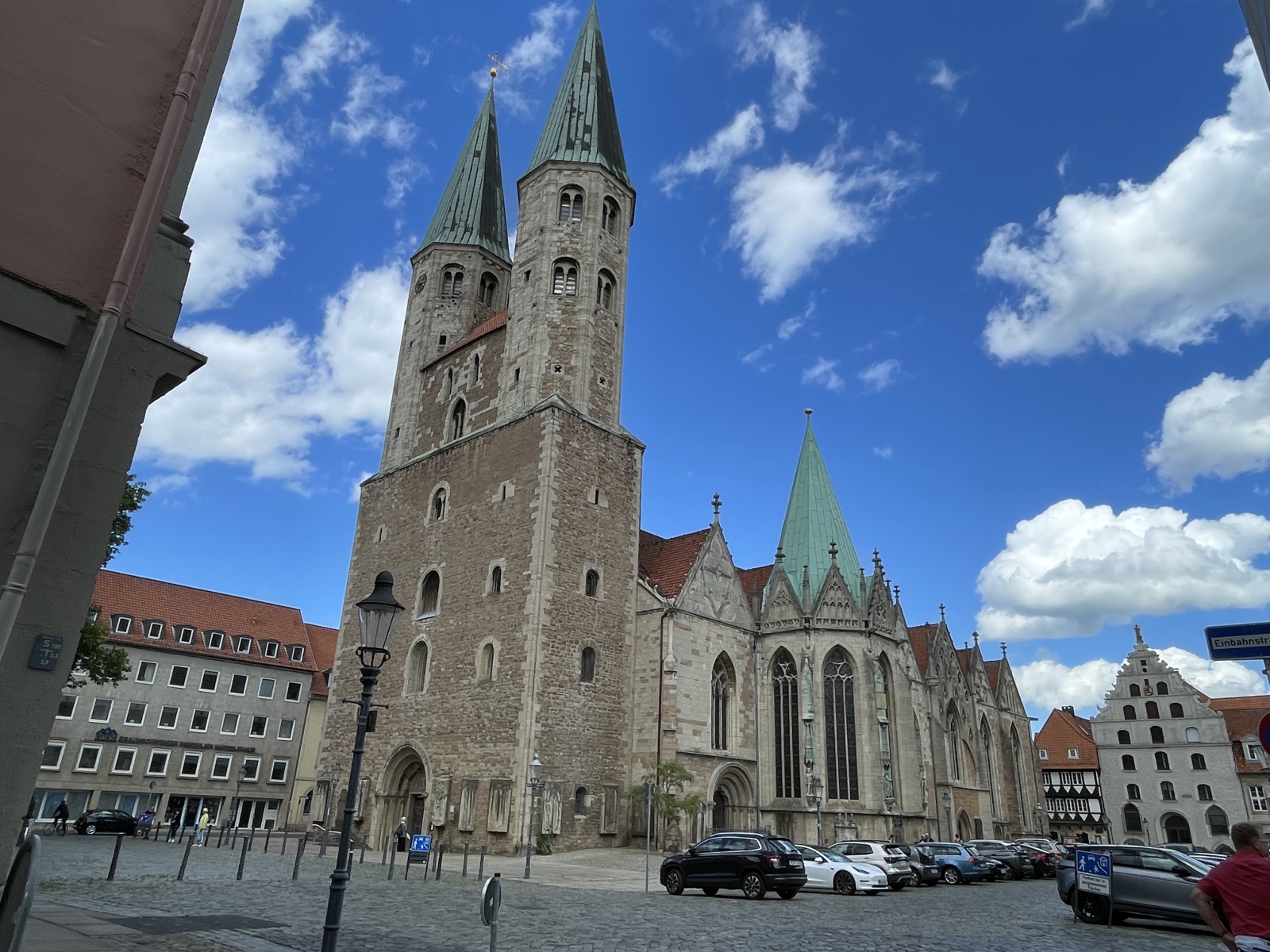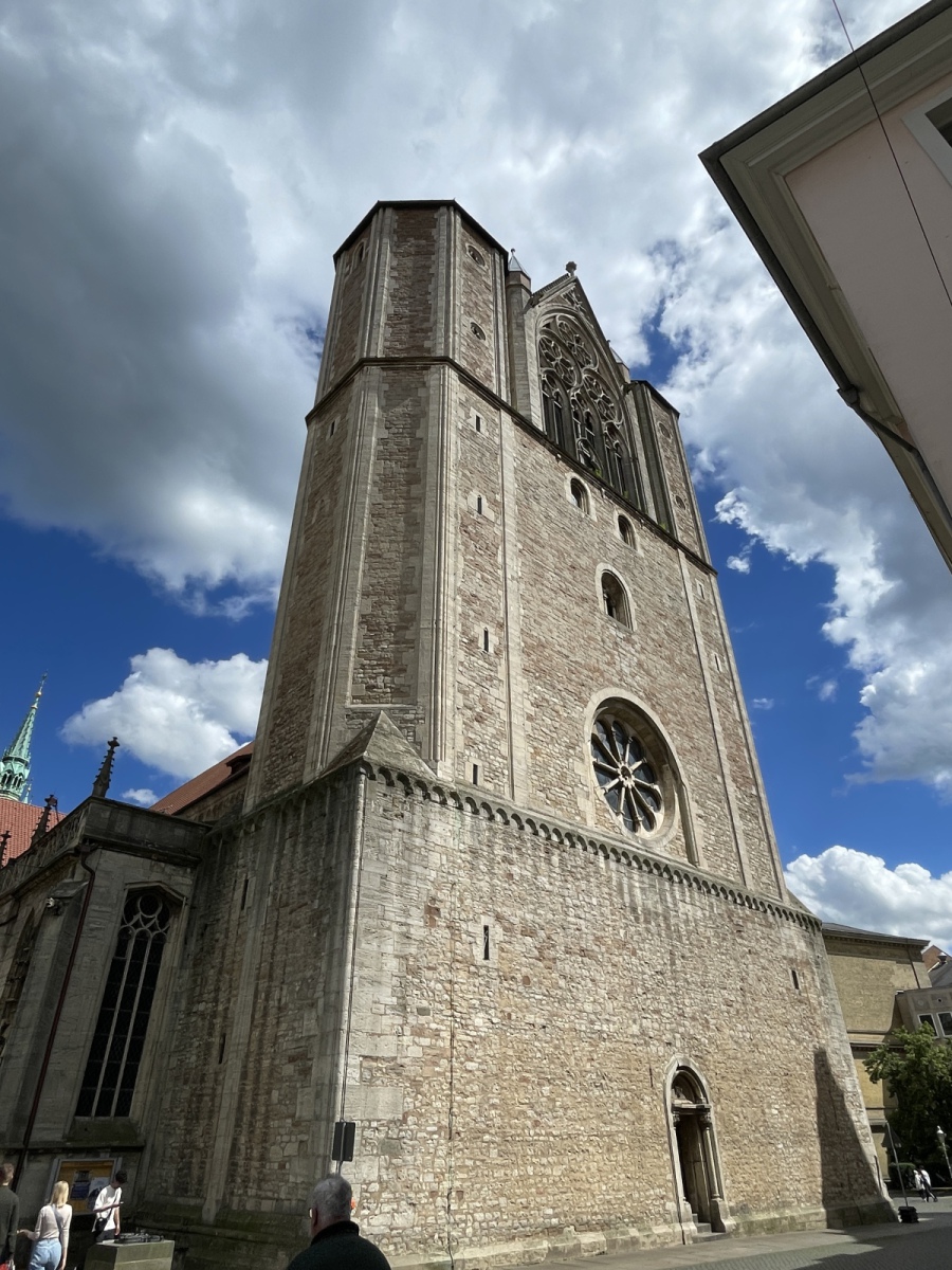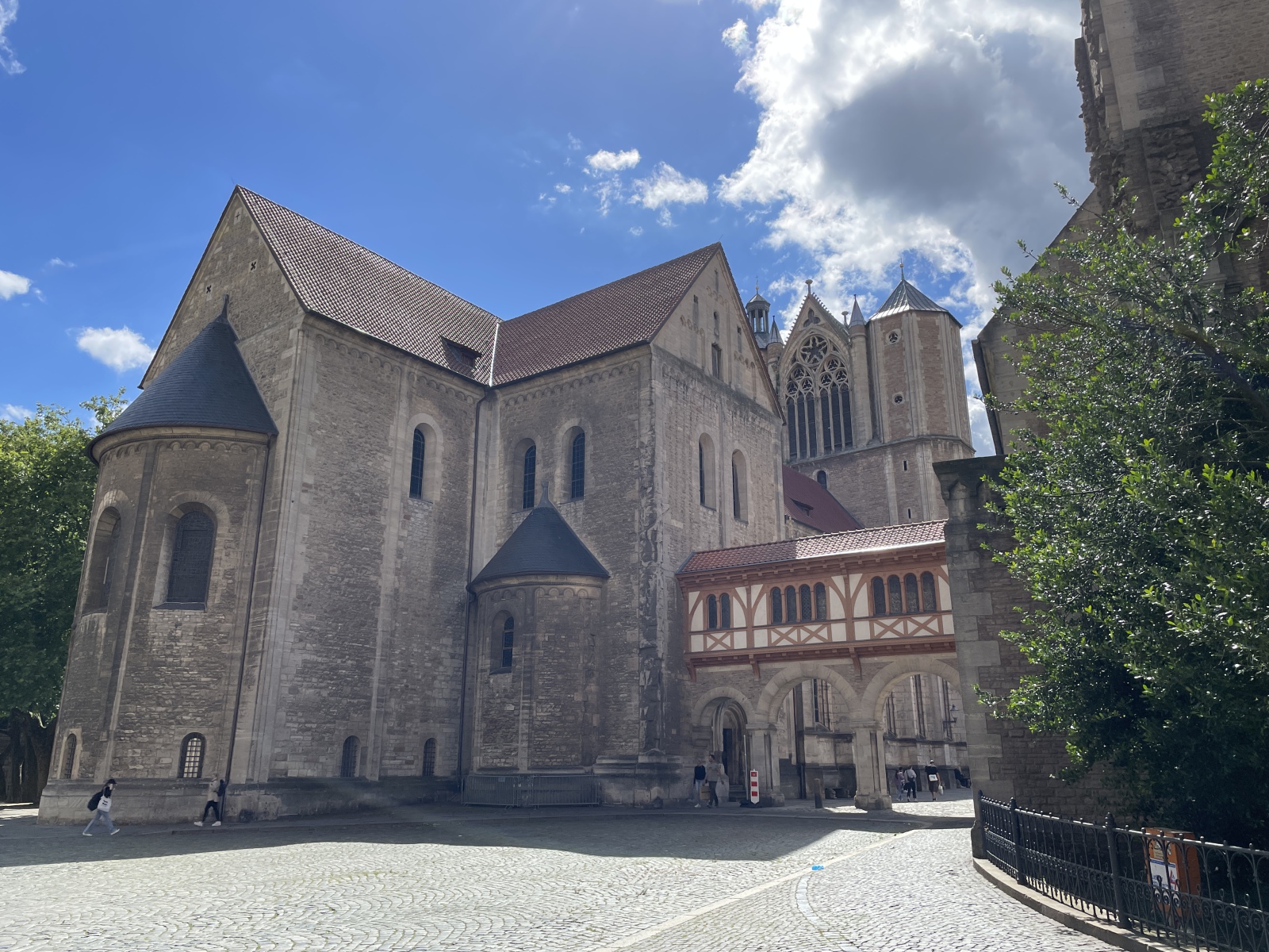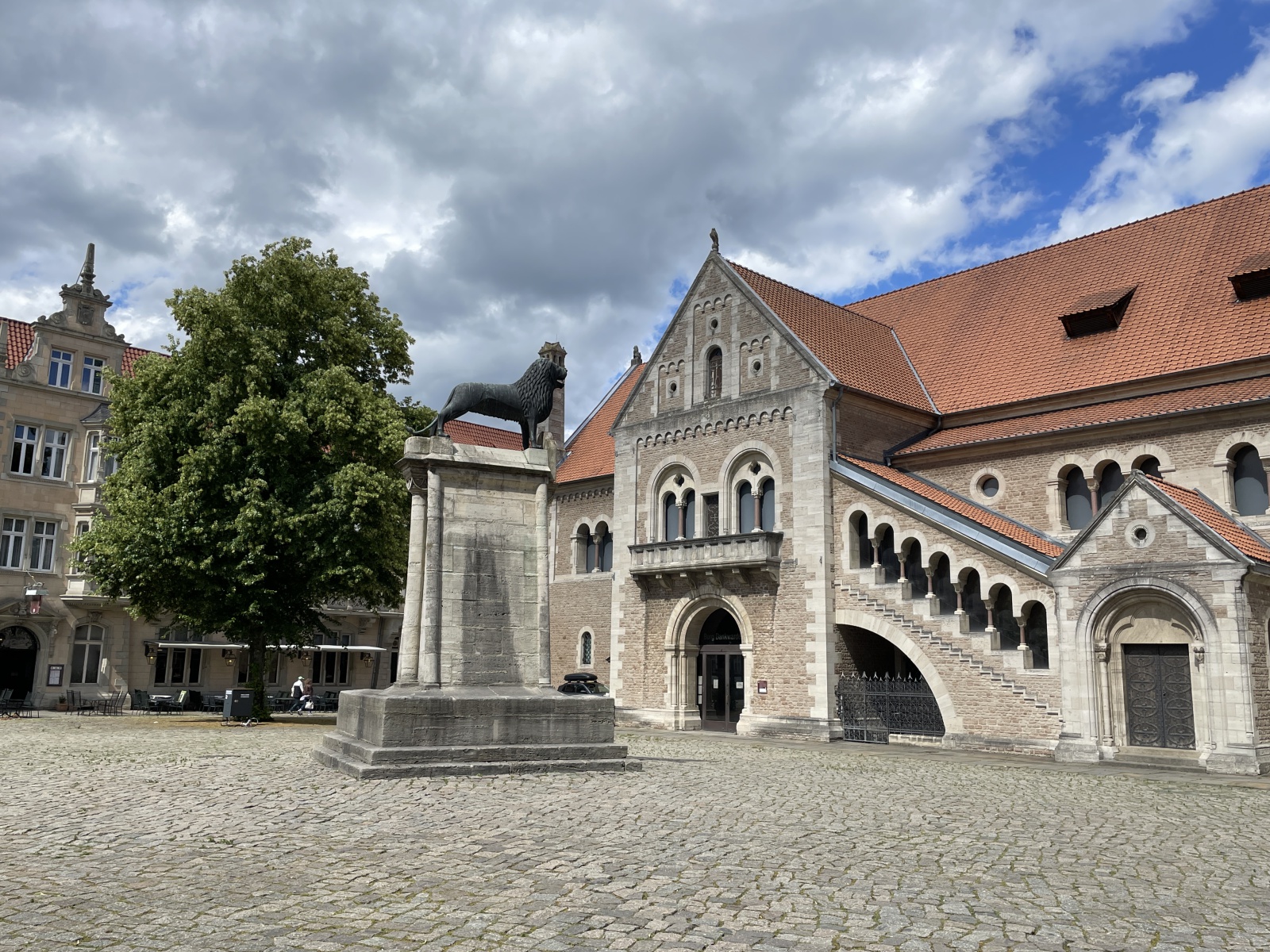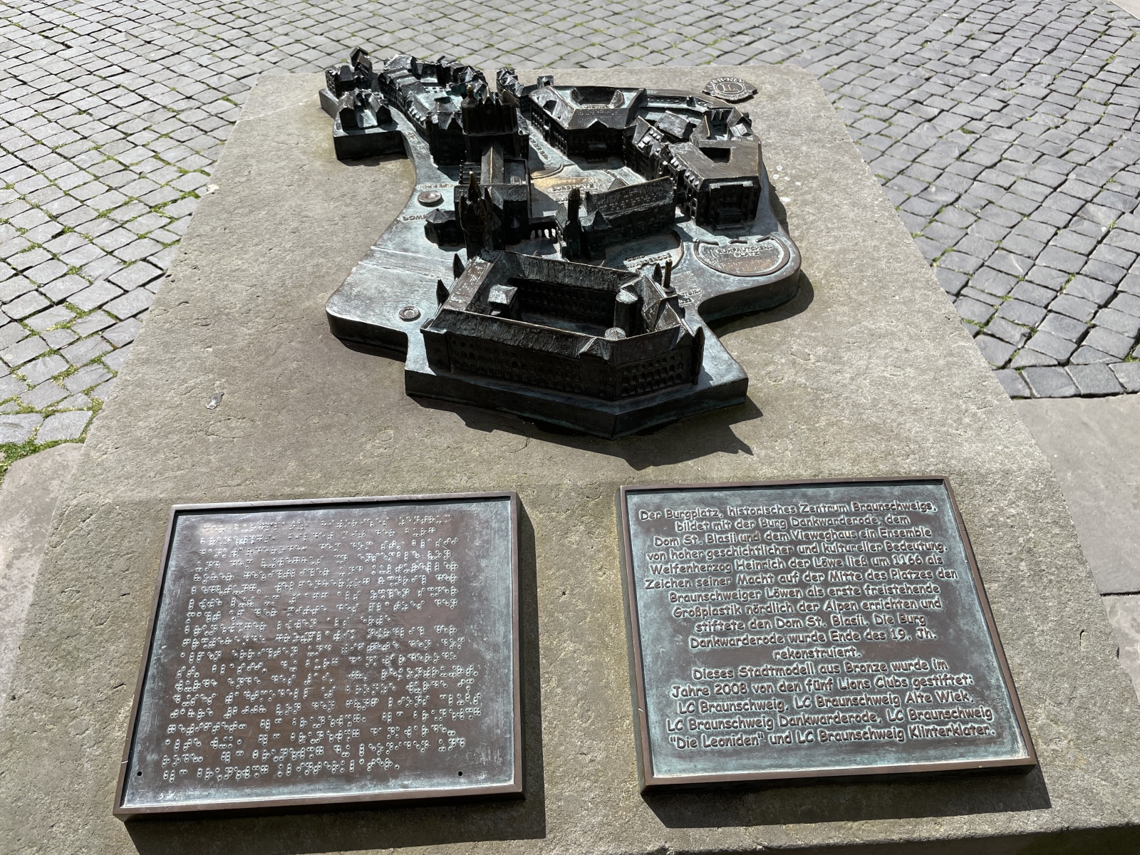 Wir gehen weiter durch die Straße Kleine Burg und sehen die Stiftsherrenhäuser. Diese wurden vom Stift St. Blasii erbaut und dienten den Stiftsherren als Wohnhäuser. Dann kommen wir zum Braunschweiger Dom. Er wurde von Heinrich dem Löwen erbaut und zur seiner Grabstätte sowie seiner Gemahlin Mathilde bestimmt. Zwölf Glocken auf drei Etagen bringen den Dom zum Läuten. Wir gehen hinein und sind überrascht über die Größe. Eine besondere Atmosphäre untermalte eine Geigenspielerin. Vor dem Dom steht ein Stadtmodell aus Bronze vom Burg-und Domplatz. Hier am Platz steht unter anderem das Vieweghaus in dem das Landesmuseum zu finden ist. Eine Dauerausstellung zeigt die Geschichte des Braunschweiger Landes von der Frühgeschichte bis in die Gegenwart. Hinzu kommen hochrangige Themenausstellungen. Außerdem das Huneborstelsche Haus und das von Veltheimische Haus. Das Huneborstelsche Haus wird heute Gildehaus genannt und hat eine berühmte reich verzierte Fachwerkfassade. Die Burg Dankwarderode als Palast Heinrich des Löwen erbaut und ist einer der Wahrzeichen dieser Stadt. Sie gehört zum Herzog Anton Ulrich-Museum. Der Rittersaal mit seinen Säulen, 10 Kronleuchtern und toller Wandmalereien gilt als der beeindruckendste, historische Festsaal in Braunschweig. Der Knappensaal dient als Ausstellungsraum der Sammlung für mittelalterliche Kunst. Es werden Gemälde, Skulpturen, Druckgraphik, Zeichnungen, Münzen und Medaillen präsentiert. Vor der Burg Dankwarderode ließ Heinrich der Löwe den Burglöwen als Wahrzeichen seiner Macht und Gerichtsbarkeit errichten. Der Burglöwe bildet den Mittelpunkt des historischen Burgplatzes.