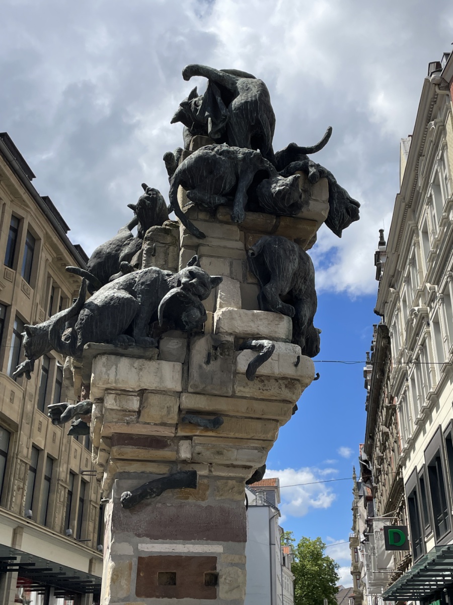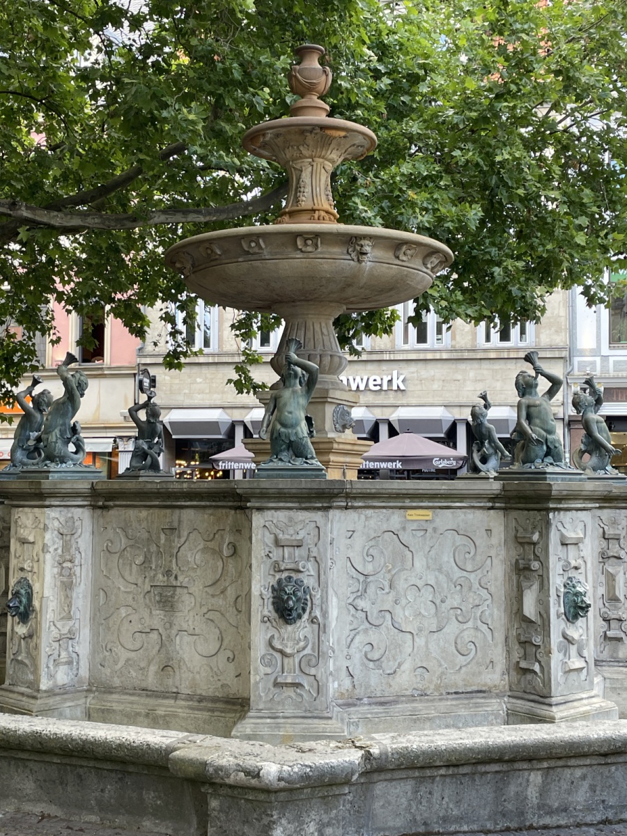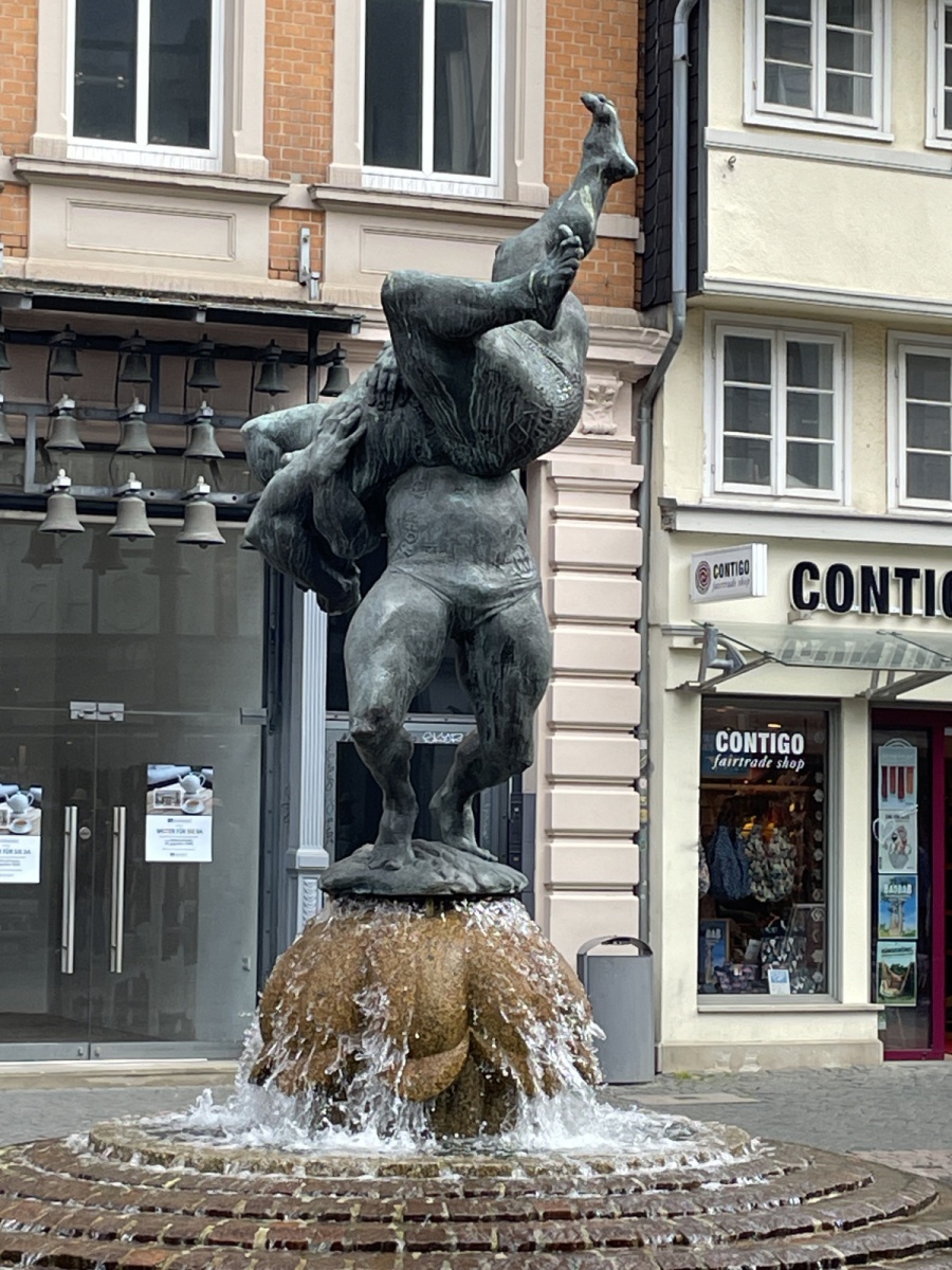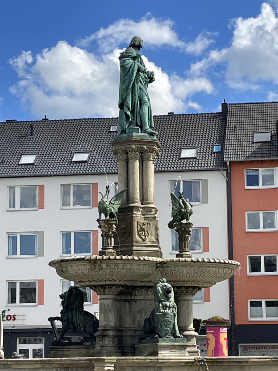 Ein paar Straßen weiter befinden wir uns auf dem Kohlmarkt. Der Kohlmarkt ist ein zentraler Treffpunkt der Fußgängerzone und wir sehen hier auch wieder schöne historische Fassaden. An einem Dachgeschossentdecken wir ein Till Eulenspiegel-Glockenspiel und darunter auf einen Balken gibt es ein Hinweis auf Till Eulenspiegel zu lesen. Hier am Kohlmarkt gibt es den schönen Kohlmarktbrunnen. Dieser Brunnen steht unter Denkmalschutz. Es handelte sich damals um einen Trinkwasserbrunnen. Oben auf dem Brunnen thront eine Vase und darunter sehen wir Wasser speiende Löwenköpfe. Auf dem Rand sitzen Putten mit einem Fischschwanz. In der Nähe vom Kohlmarkt steht der Ringerbrunnen. Der Brunnen steht auf einer Kuppel aus Kopfsteinpflaster mit einem Miniaturgraben drum herum. Die Bronzeskulptur stellt zwei Schwergewichtler dar, wobei der eine den anderen in die Höhe hebt. Es soll sich dabei um Herkules im Kampf mit dem Riesen Antäus handeln. Wo wir gerade bei Brunnen sind. Am Hagenmarkt steht der sehr große historische Zierbrunnen, der Heinrichsbrunnen. Auf einem Säulenbündel steht die fast drei Meter große Bronzefigur von Herzog Heinrich des Löwen. Es gibt drei Drachen und drei sitzendes Löwen. Die Löwen tragen das Wappen des Welfenhauses. Es gibt auch einen Till Eulenspiegel Brunnen. Einer Sage nach soll er sich ja mehrfach hier in Braunschweig aufgehalten haben und dabei den Menschen immer wieder Streiche gespielt haben soll. Oben auf dem Brunnen sitzt Till Eulenspiegel und ihm zugewandt Eulen und Meerkatzen als Wasserspeier. Am Brunnen befindet sich auch eine Inschrift. Zu guter Letzt begegnen wir die Stele Katzenbalgen, die sich auch in der Nähe des Kohlmarkts befindet. Dieses Denkmal wird als das hinreißend, humoristisch und unkonventionell betitelt. Auf der Säule befinden sich spielenden, rangelnden, raufenden oder sich balgenden Katzen, die in ihren verschiedenen Posen erstarrt sind. Das Denkmal ist sehr groß und eindrucksvoll.