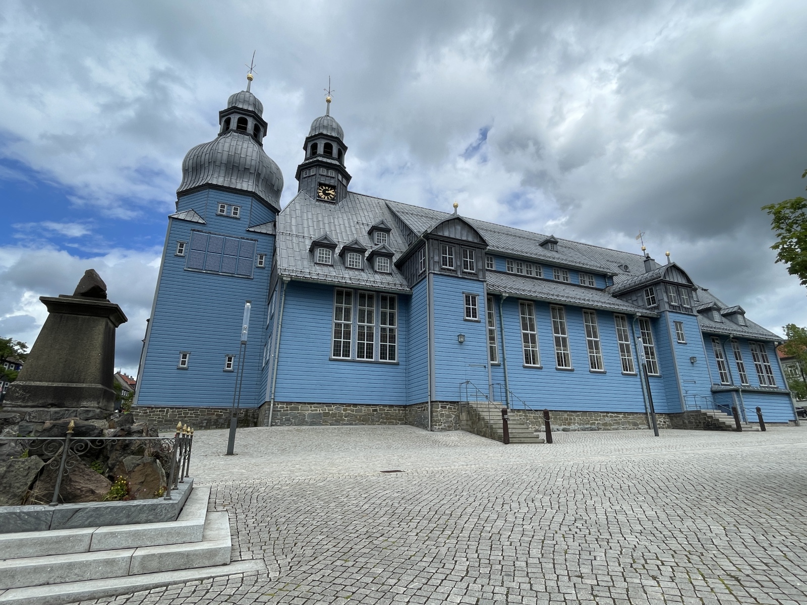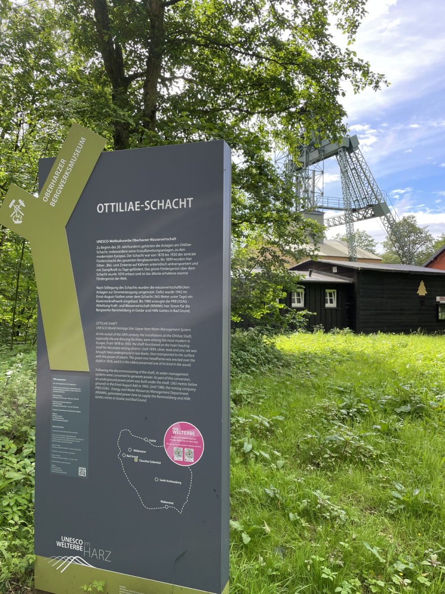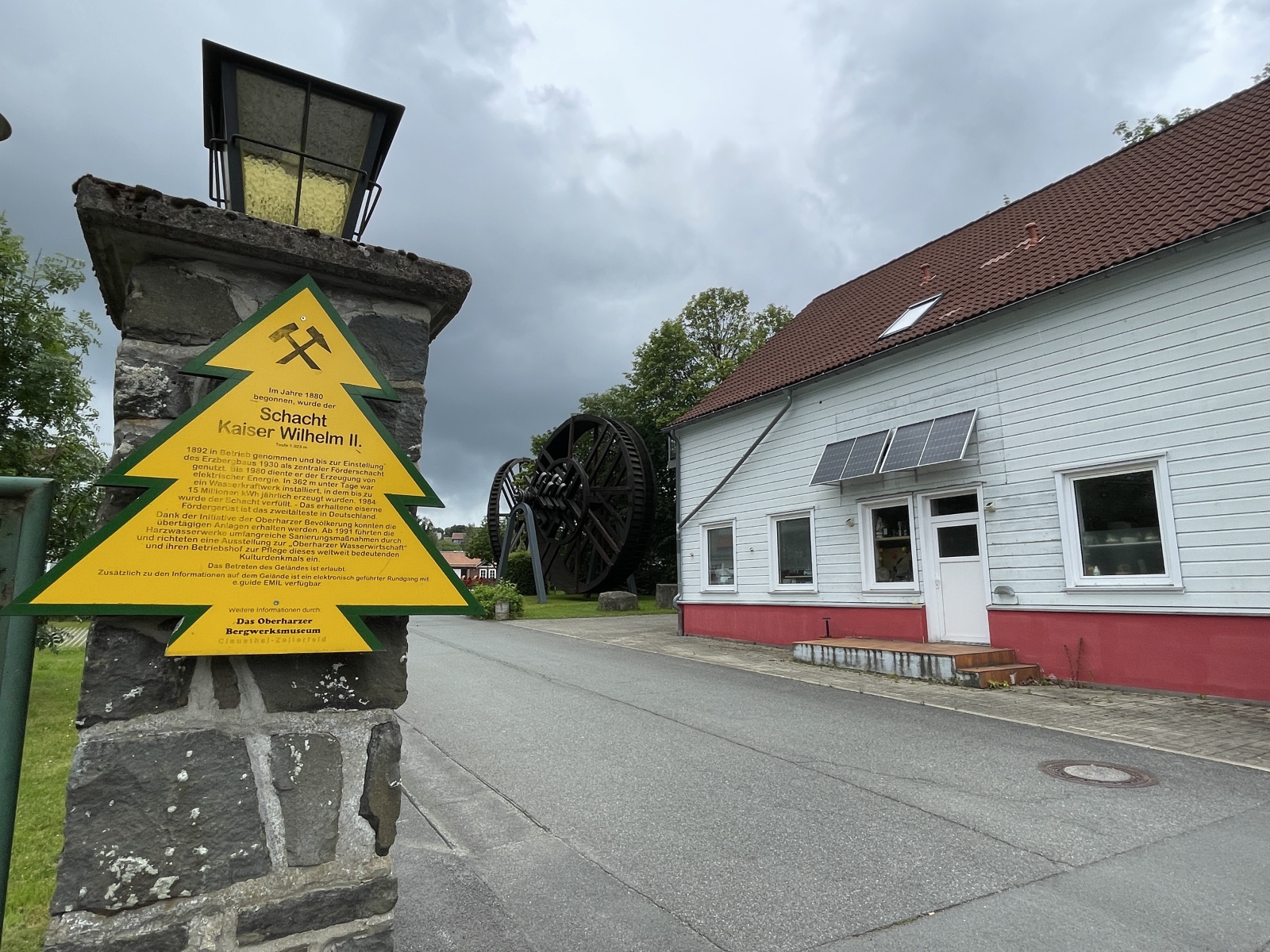 Unser letztes Ziel dieser Reise ist Clausthal-Zellerfeld und auch hier begeben wir uns die Welt des Bergbaus. Clausthal-Zellerfeld liegt im Oberharz im Landkreis Goslar. Bekannt ist der Ort durch seine blaue Marktkirche. Sie ist die zweitgrößte erhaltene Holzkirche Europas. Bevor wir zu dem Wohnmobilstellplatz „park4night Clausthal-Zellerfeld-5a Am Alten Bahnhof“ 51°48´48.636´´N/10°20´9.96´´E fahren, besuchen wir vorher noch den Ottiliae-Schacht und den Schacht Kaiser Wilhelm II. Der Schacht Kaiser Wilhelm II war mit einer Teufe von 1023 m, seinem stählernen Fördergerüst, einer Fahrkunst, einer Dampfförder- und einer Wassersäulenmaschine der zentrale Förder- und Seilfahrtschacht des Bergbaus. Wir entdecken auf dem Gelände Schautafeln zu den einzelnen Anlagen und können uns darüber gut informieren. Außerdem sehen wir hier auf dem Gelände ein Kunst- und ein Kehrrad in Originalgröße. So können wir uns die Dimension der im Bergbau eingesetzten Wasserräder im Vergleich zur modernen Technik richtig gut vorstellen. Die Tagesanlage sind originalgetreu restauriert worden und stellen heute eine vollständige erhaltene übertage Erzbergwerkanlage dar. Das Fördergerüst auf dem Gelände ist das zweitälteste erhaltene in Deutschland.