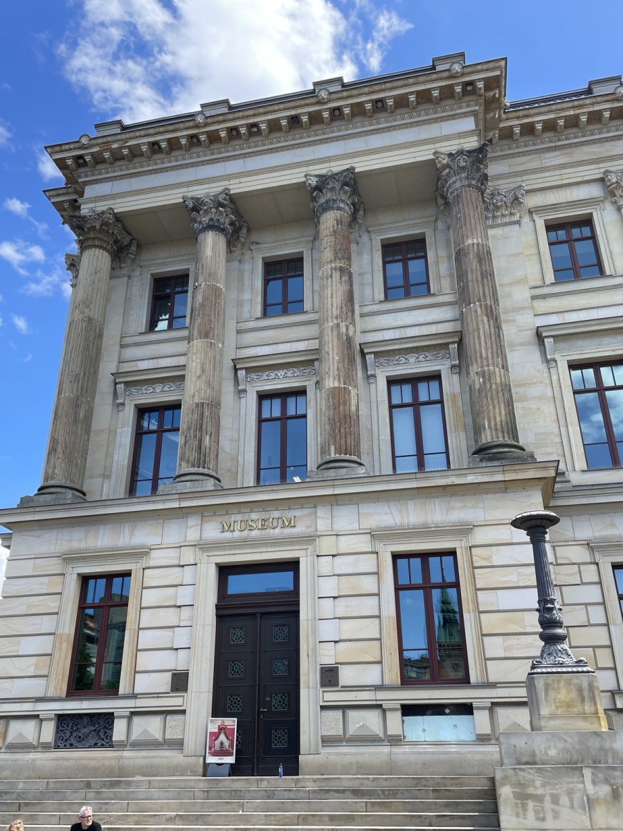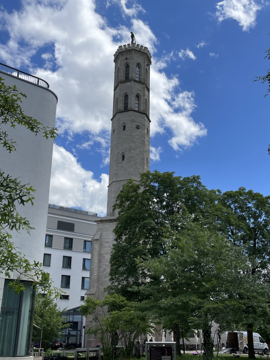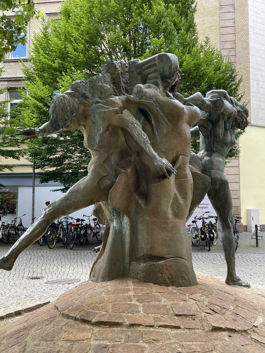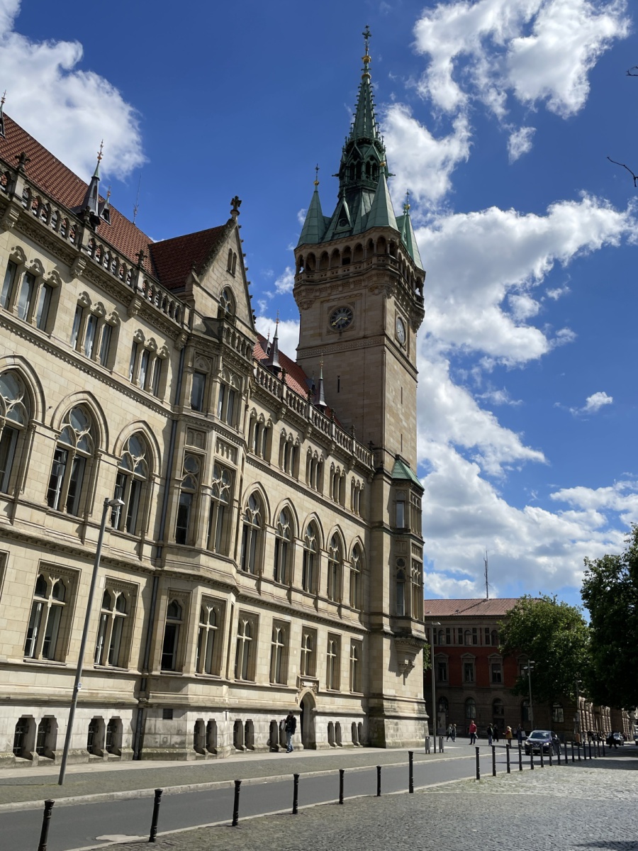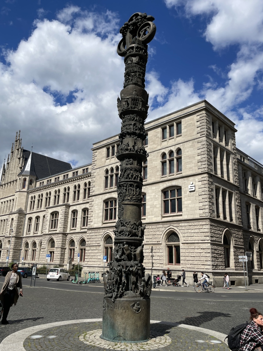 Gleich gegenüber sind wir schon am Platz der deutschen Einheit. Hier steht das Rathaus mit seinem 61 Meter hohen Rathausturm. Man hat einen tollen Blick über die Stadt, wenn man die 161 Stufen hinauf gehen möchte. Es sind aber aus Sicherheitsgründen immer nur zwei Leute erlaubt. Vier Figuren zieren die Fenster über dem Eingangsbereich des Rathauses und stellen die Bereiche Wissenschaft, Kunst, Handwerk und Handel dar. An diesem Platz entdecken wir ein Stück der Berliner Mauer. Hier sehen wir auch die 9 Meter hohe Säule 2000 Jahre Christentum. Sie erinnert an die Geburt Christi vor 2000 Jahren mit plastischen Theme-Ringen zur Geschichte des Christentums. Es gibt zwei Fernrohre, mit denen die kleinsten Details auf der Säule betrachtet werden können. Es gibt aber auch eine Infotafel zum Kunstwerk wo drauf die sichtbaren Szenen und Säulenabschnitte erläutert werden.