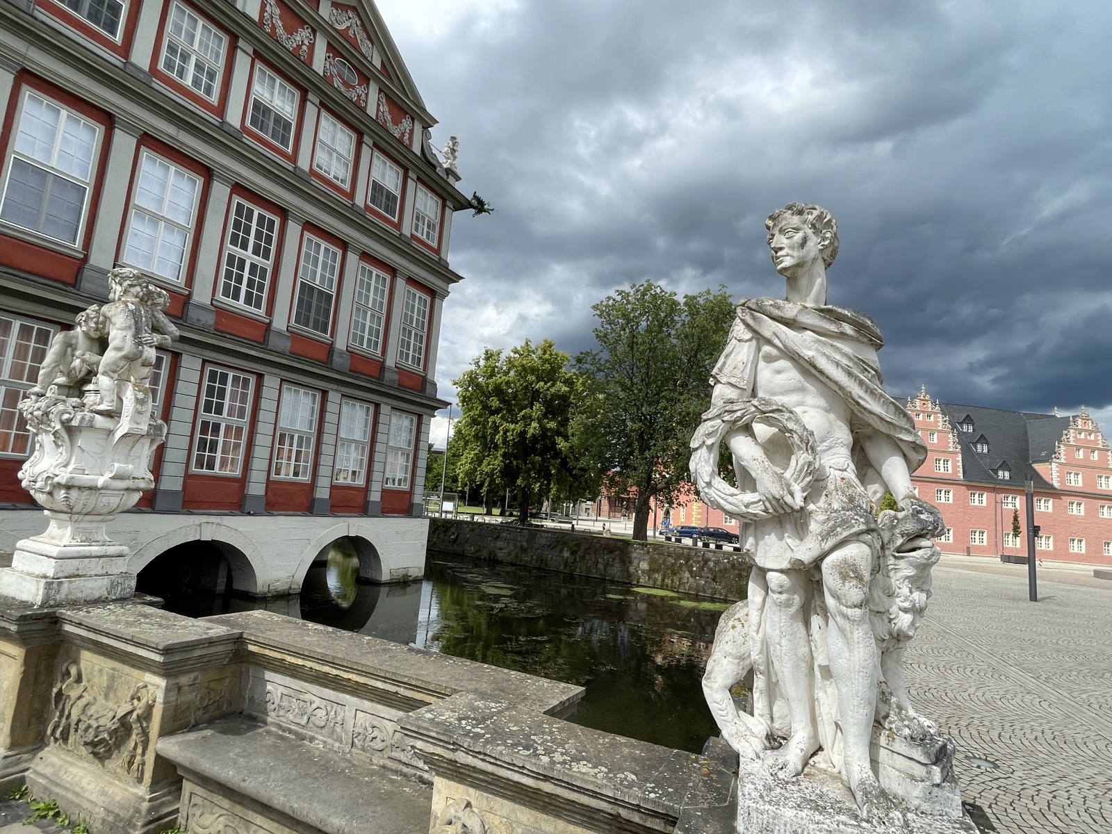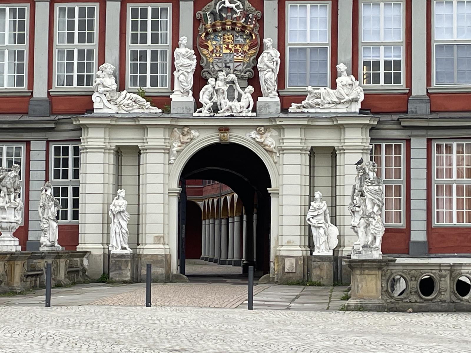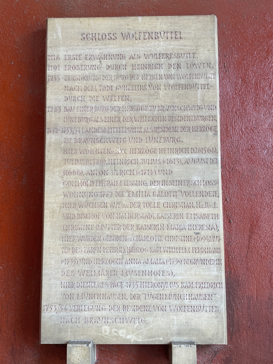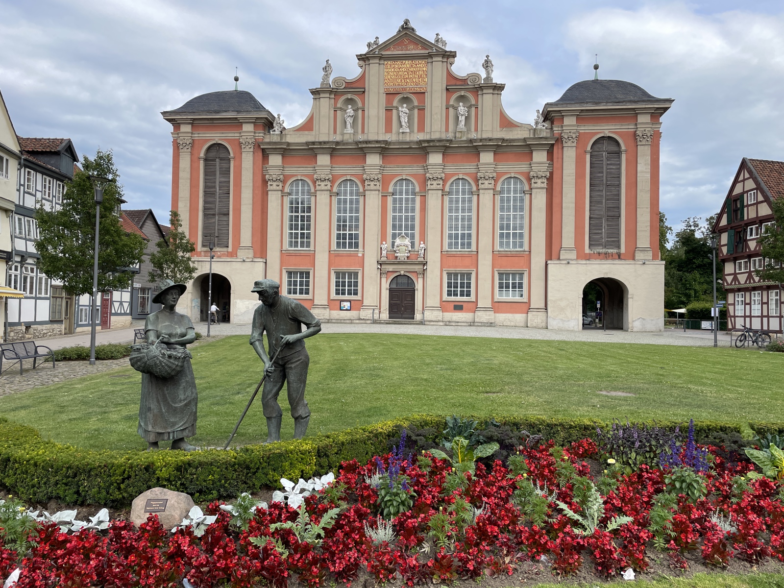 Angekommen fahren wir zum Wohnmobilstellplatz „Wohnmobilstellplatz Wohnmobilpark Stadtbad Okeraue in Wölfenbüttel“ 52°9´21´´N/10°32´33´´E und stehen wieder sehr Stadt nah für unsere Stadtbesichtigung. Die Kreisstadt Wolfenbüttel liegt an dem Fluss Oker in Niedersachsen im nördlichen Harzvorland. Auch für diese Stadt haben wir wieder eine Karte für einen Stadtrundgang und wollen am Herzoglichen Schloss anfangen. Wir gehen durch den Stadtpark vorbei an der Flora-Statue. Flora ist die griechische Göttin der Blüten und Blumen. Nachdem wir den Kulturbahnhof passiert haben, sind wir dann auch schon am Schloss. Wir sind überrascht. So schön und so groß haben wir es und gar nicht vorgestellt. Das Schloss Wolfenbüttel ist das zweitgrößte in Niedersachsen. Ursprünglich war es mal eine Wasserburg der Herren von Wolfenbüttel. Heute ist ein barockes Residenzschloss. In dem Schloss befindet sich Schloss-Museum mit aufwendig restaurierten Staatsgemächer der Welfen und zeigt Hofkultur und Residenzgeschichte. Um das Schloss herum sehen wir den Burgraben und gehen über eine Brücke in den Schlosshof. Hier bewundern wir die nach italienischem Vorbild gestalteten Arkaden. Witzig gestaltet sind die Türgriffe an den alten Türen. Noch heute erhalten ist der 48 Meter hohe Hermannsturm als höchster Turm des Schlosses. Sehr beeindruckend ist das Schlossportal mit dem großen Stadtwappen und den vielen Figuren. Eine richtige Prunkfassade. Diese barocken Figuren an der Brüstung und auf der Schlossbrücke sollen die Tugenden und Pflichten eines Landesfürsten symbolisieren. Auf dem Schlossplatz fällt ein rosarotes Gebäude auf. Es ist das Zeughaus. Früher diente es als Waffenarsenal und Kaserne. Außerdem lagerten hier die größten Geschütze Deutschlands. Heute ist es eine Forschungsbibliothek. Gleich neben dem Zeughaus ist der Proviantboden oder auch Magazinhaus genannt. Dies ist das größte Fachwerkhaus in Niedersachsen. Vorm dem Zeughaus gibt es ein großes Wasserbecken als Springbrunnen mit einer großen Fontäne. Hier stehen richte schöne Fachwerkhäuser mit tollen Eingangstüren. Ein besonderes Haus auf dem Schlossplatz ist das Eckhaus Nummer 19. Hier wohnte der Erzgießer, der für einen Herzog die Kanonen goss. Wir lesen, auf einem Schild, das es hier auch eine Höhere Töchterschule gab. An mehreren Häuserwänden sehen wir prachtvolle Rosen.