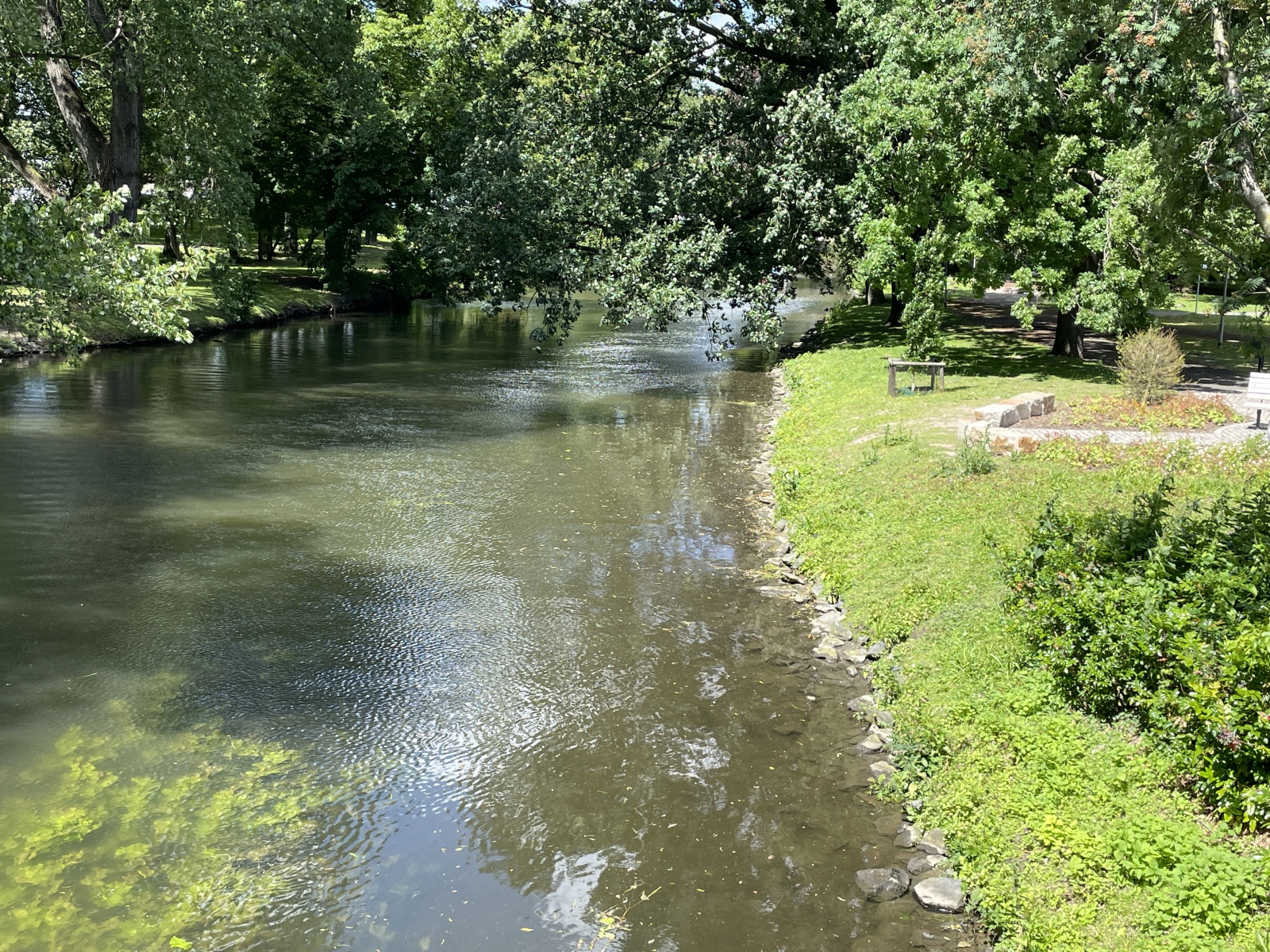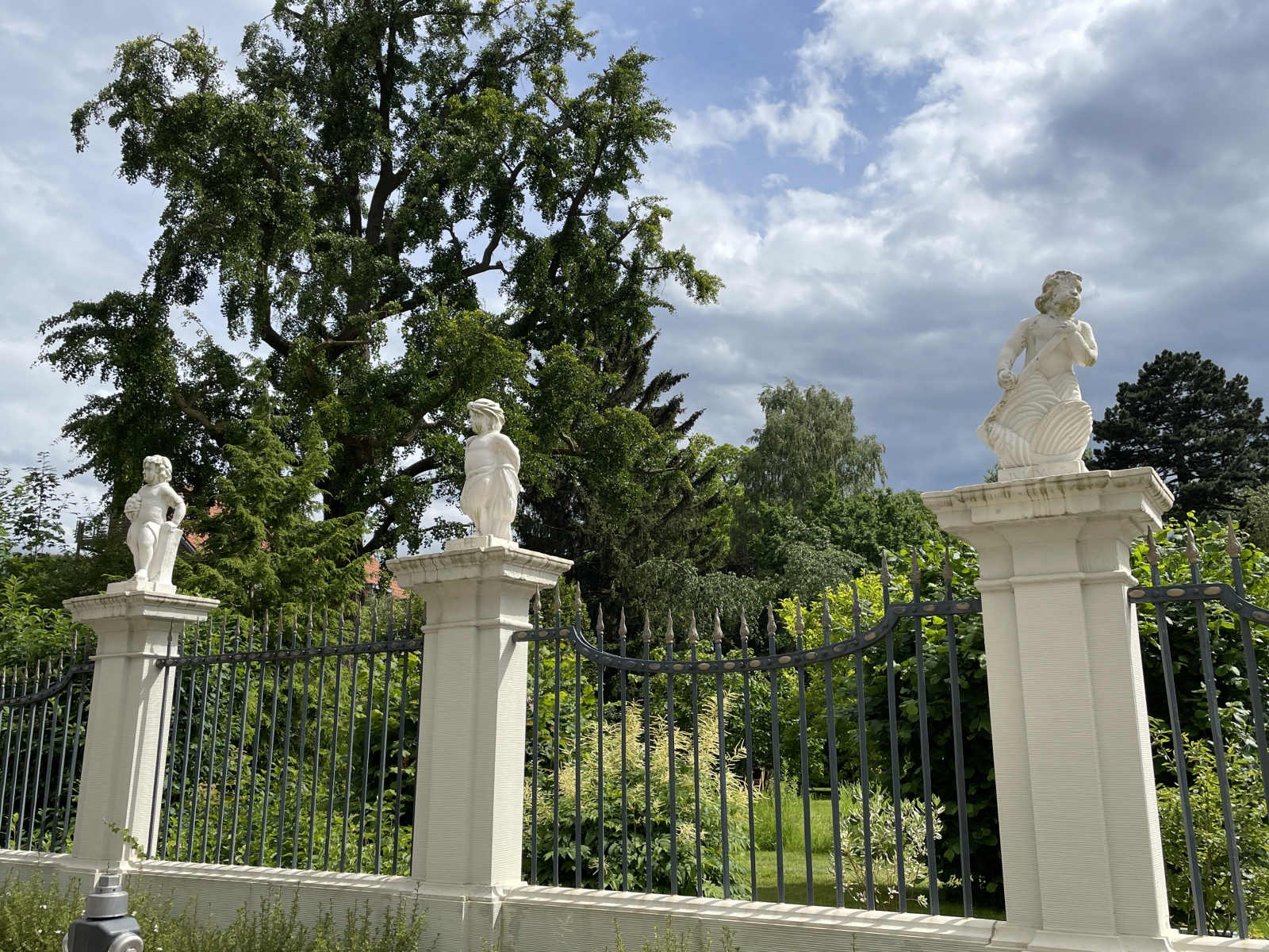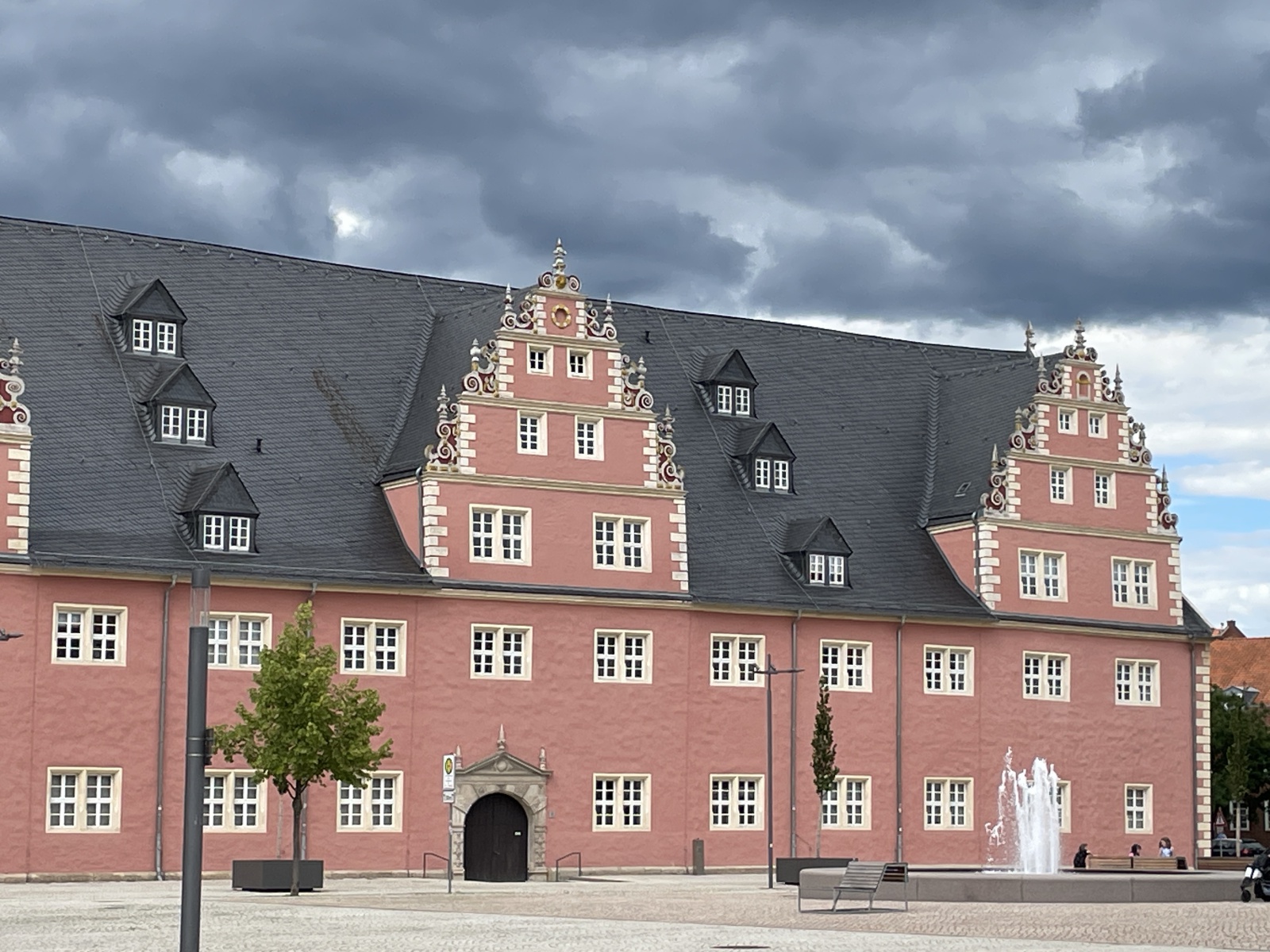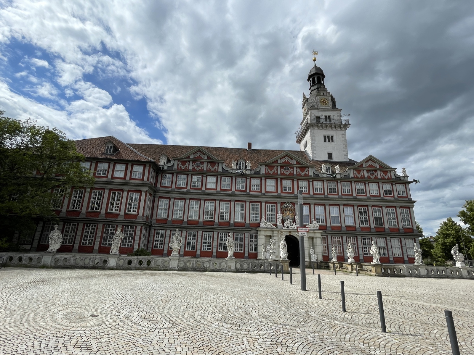 Angekommen fahren wir zum Wohnmobilstellplatz „Wohnmobilstellplatz Wohnmobilpark Stadtbad Okeraue in Wölfenbüttel“ 52°9´21´´N/10°32´33´´E und stehen wieder sehr Stadt nah für unsere Stadtbesichtigung. Die Kreisstadt Wolfenbüttel liegt an dem Fluss Oker in Niedersachsen im nördlichen Harzvorland. Auch für diese Stadt haben wir wieder eine Karte für einen Stadtrundgang und wollen am Herzoglichen Schloss anfangen. Wir gehen durch den Stadtpark vorbei an der Flora-Statue. Flora ist die griechische Göttin der Blüten und Blumen. Nachdem wir den Kulturbahnhof passiert haben, sind wir dann auch schon am Schloss. Wir sind überrascht. So schön und so groß haben wir es und gar nicht vorgestellt. Das Schloss Wolfenbüttel ist das zweitgrößte in Niedersachsen. Ursprünglich war es mal eine Wasserburg der Herren von Wolfenbüttel. Heute ist ein barockes Residenzschloss. In dem Schloss befindet sich Schloss-Museum mit aufwendig restaurierten Staatsgemächer der Welfen und zeigt Hofkultur und Residenzgeschichte. Um das Schloss herum sehen wir den Burgraben und gehen über eine Brücke in den Schlosshof. Hier bewundern wir die nach italienischem Vorbild gestalteten Arkaden. Witzig gestaltet sind die Türgriffe an den alten Türen. Noch heute erhalten ist der 48 Meter hohe Hermannsturm als höchster Turm des Schlosses. Sehr beeindruckend ist das Schlossportal mit dem großen Stadtwappen und den vielen Figuren. Eine richtige Prunkfassade. Diese barocken Figuren an der Brüstung und auf der Schlossbrücke sollen die Tugenden und Pflichten eines Landesfürsten symbolisieren. Auf dem Schlossplatz fällt ein rosarotes Gebäude auf. Es ist das Zeughaus. Früher diente es als Waffenarsenal und Kaserne. Außerdem lagerten hier die größten Geschütze Deutschlands. Heute ist es eine Forschungsbibliothek. Gleich neben dem Zeughaus ist der Proviantboden oder auch Magazinhaus genannt. Dies ist das größte Fachwerkhaus in Niedersachsen. Vorm dem Zeughaus gibt es ein großes Wasserbecken als Springbrunnen mit einer großen Fontäne. Hier stehen richte schöne Fachwerkhäuser mit tollen Eingangstüren. Ein besonderes Haus auf dem Schlossplatz ist das Eckhaus Nummer 19. Hier wohnte der Erzgießer, der für einen Herzog die Kanonen goss. Wir lesen, auf einem Schild, das es hier auch eine Höhere Töchterschule gab. An mehreren Häuserwänden sehen wir prachtvolle Rosen.