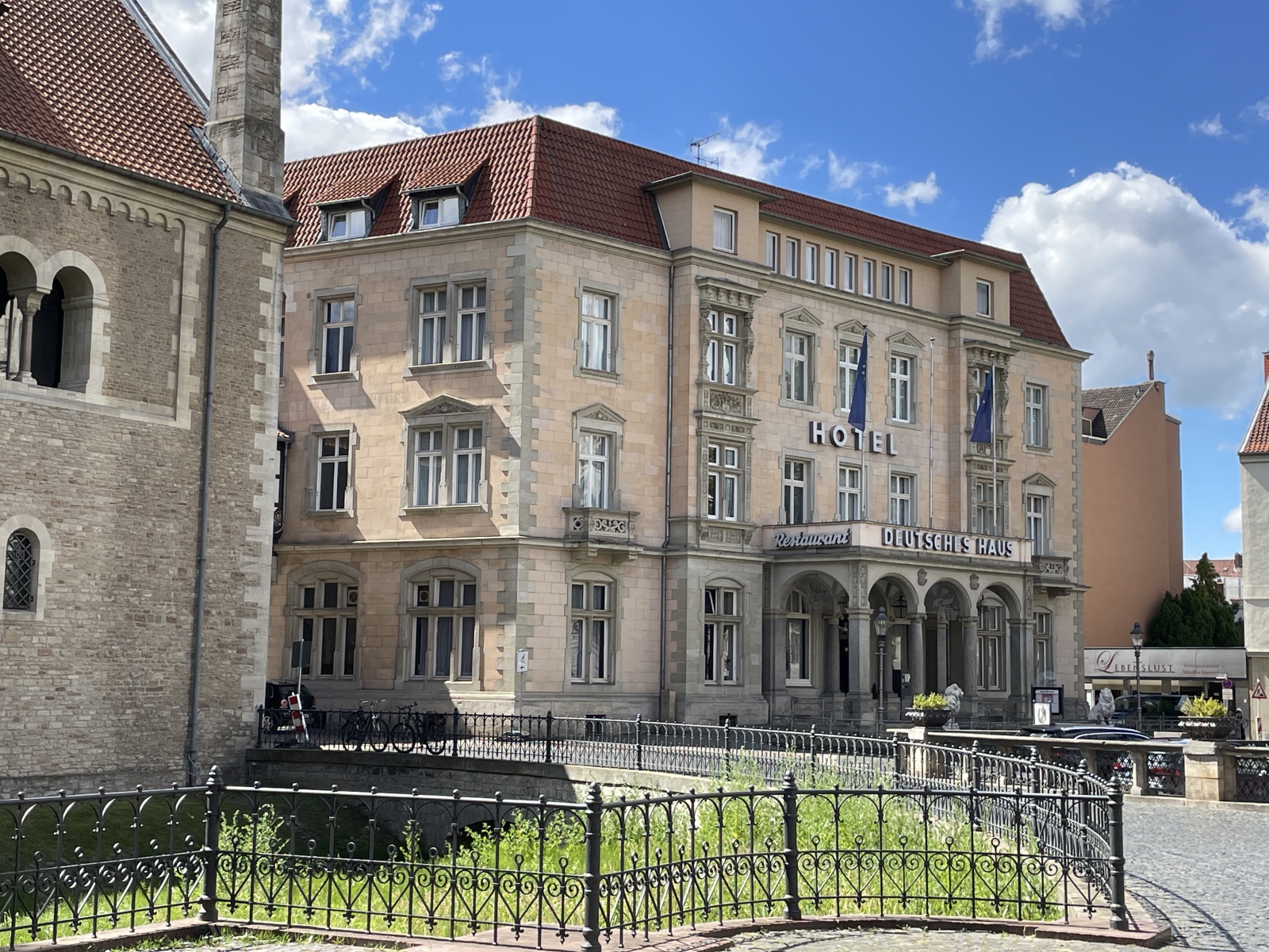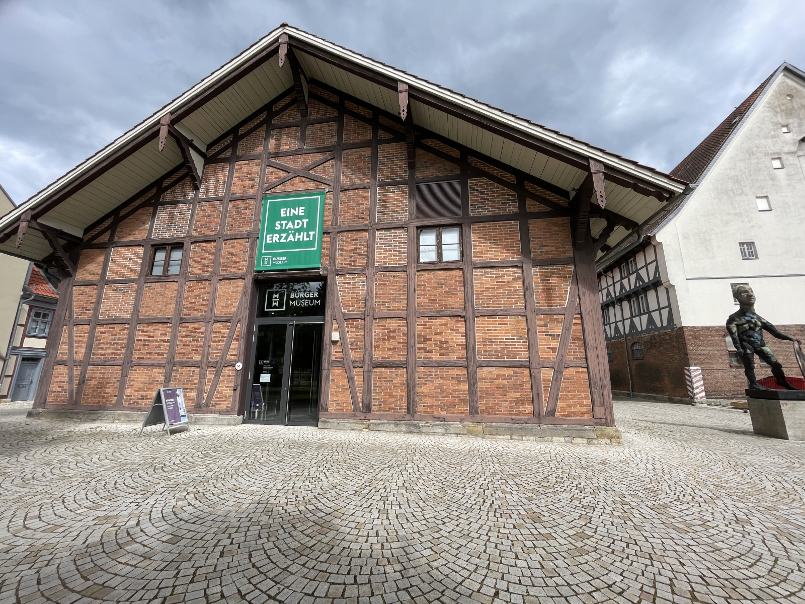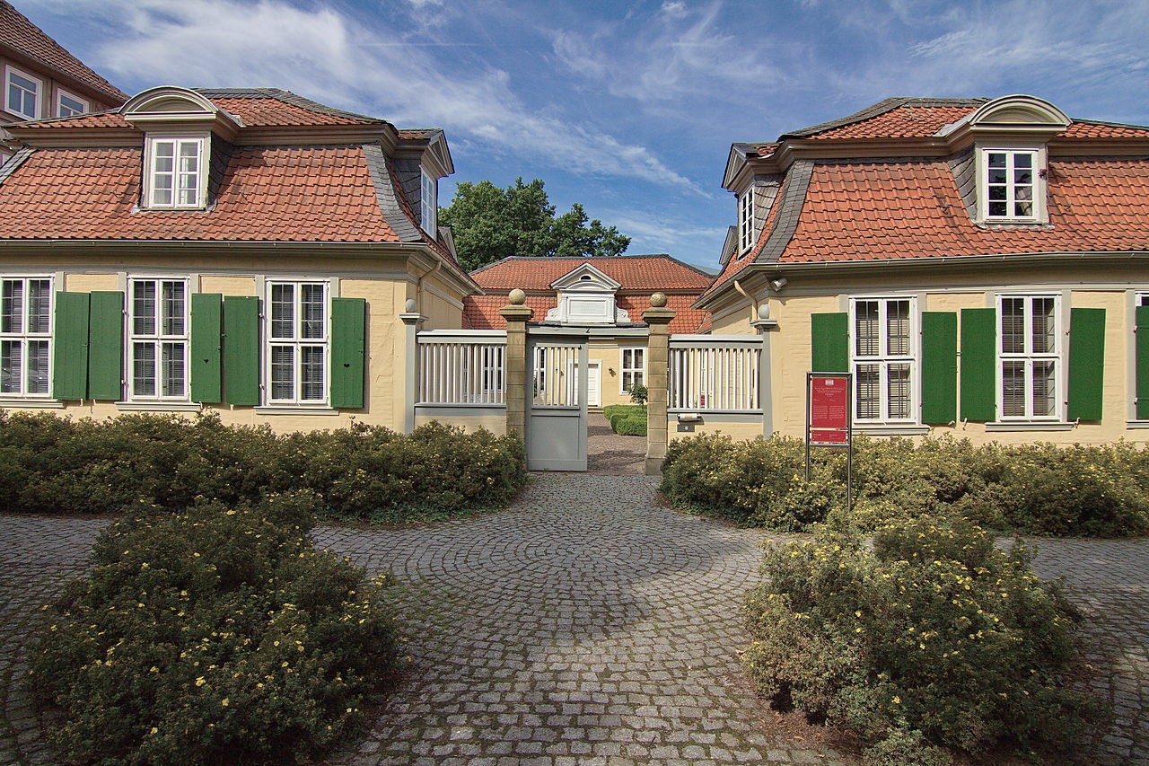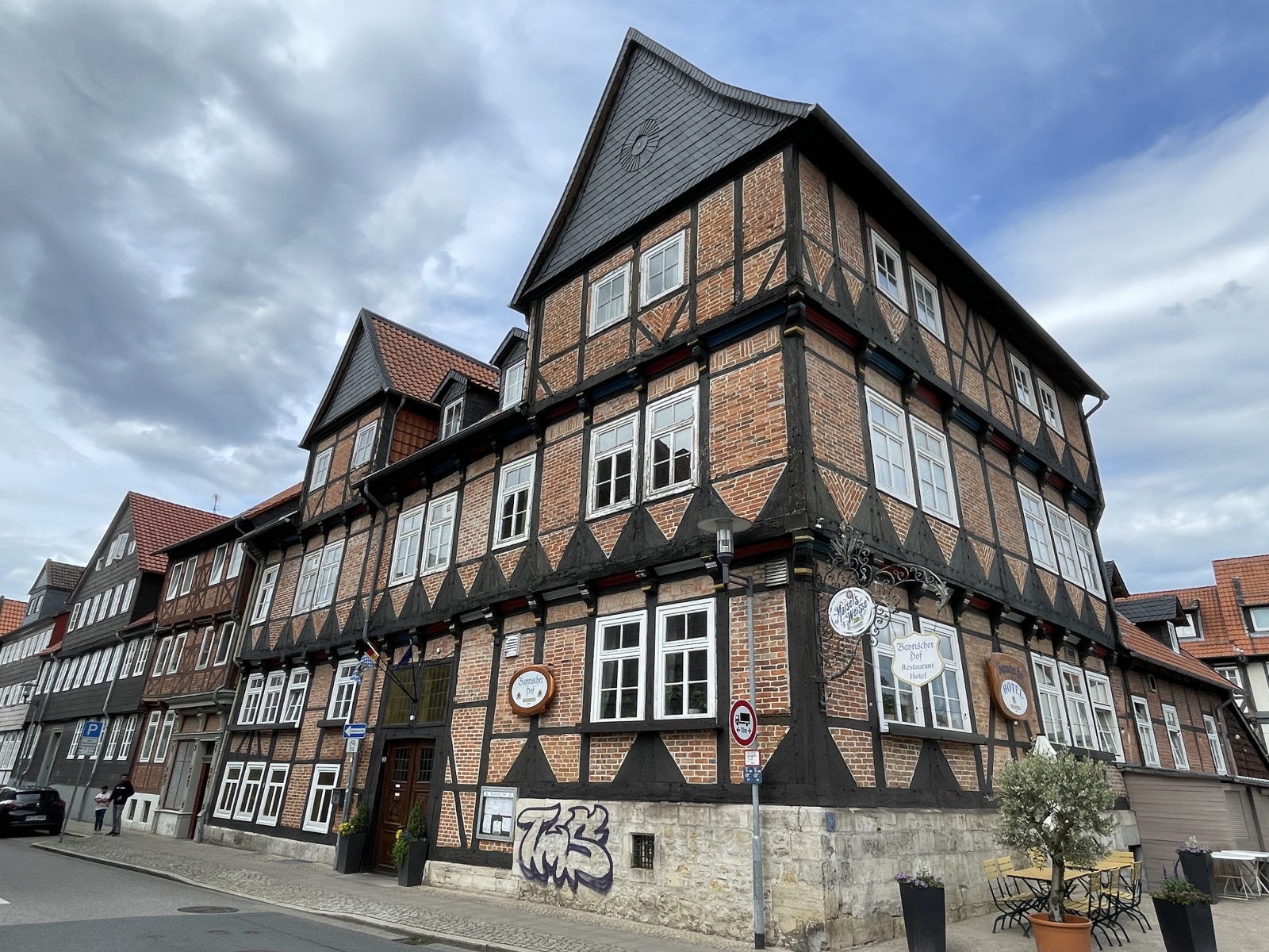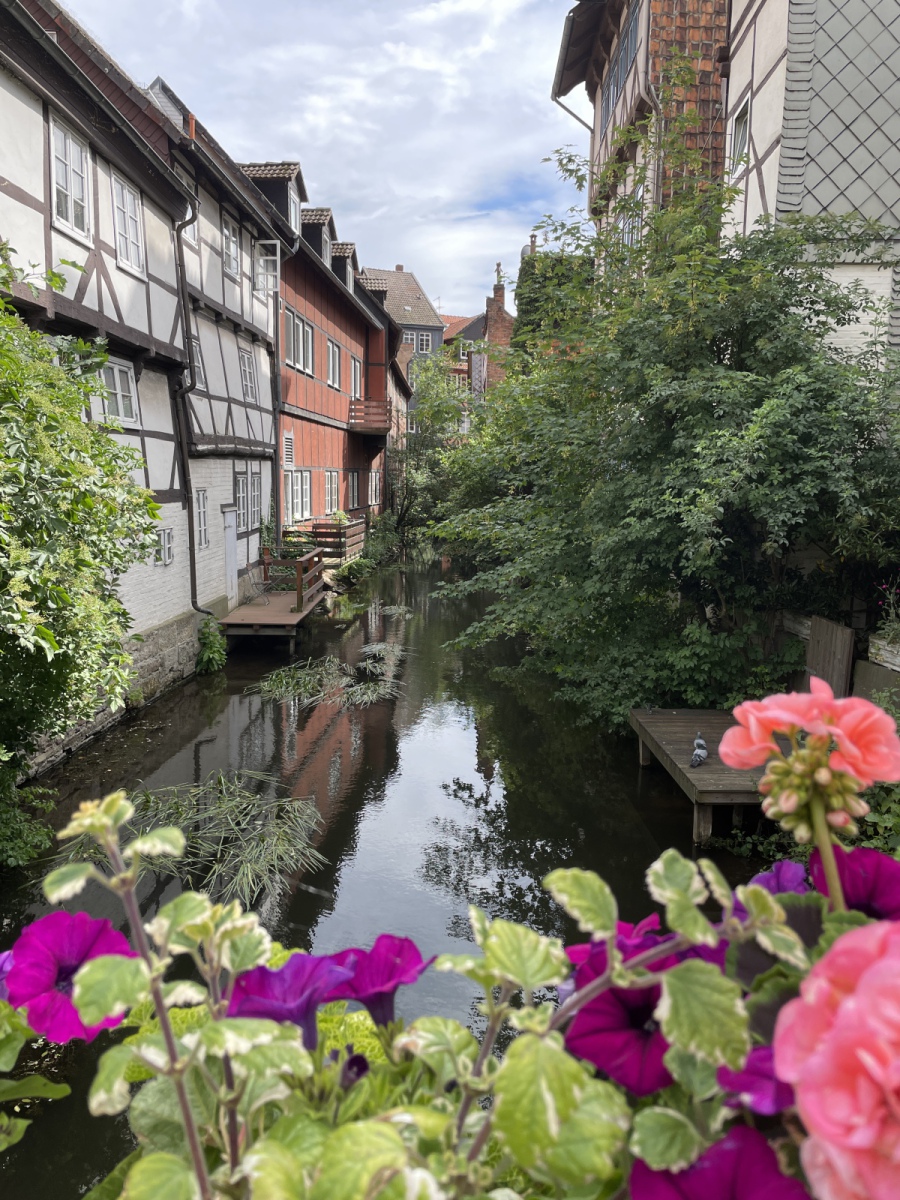 Wir gehen weiter zum Lessinghaus. In dem Hofbeamtenhaus, das im Stil eines spätbarocken Parkschlösschen gebaut wurde, lebte und wohnte der Gotthold Ephraim Lessing. Heute gehört das Haus zur Ernst-August-Bibliothek und ist ein Museum zu Leben und Wirken Lessings. Vor dem Haus steht das Nathan-Denkmal. Auch das Denkmal erinnert an das Leben und Wirken des Dramatikers. erinnert Gleich daneben befindet sich die international bekannte Ernst-August-Bibliothek, die auch unter Namen Bibliotheca Augusta bekannt ist. Im Bürgermuseum sehen wir 500 Jahre Wolfenbütteler Stadtgeschichte. Neben dem Museum steht ein eindrucksvolles Wilhelm Busch Denkmal. Wilhelm Busch war einer der einflussreichsten humoristischen Dichter und Zeichner Deutschlands. Da sein Bruder in der Stadt eine Konservenfabrik betrieb und er hier viel Zeit verbrachte, entstanden hier einige seine Arbeiten und war somit mit der Stadt eng verbunden. Jetzt gehen wir zu einem romantischen Ort in dieser Stadt. Klein Venedig. Früher gab es hier Grachtensystem und dies ist ein kleiner Überrest der Grachten. Die Brücke mit diesem üppigen Blumenschmuck ist ein beliebtes Fotomotiv. So natürlich auch für mich, denn hier fühle ich mich tatsächlich ein bisschen wie in Italien. Wir gehen die Lange Herzogstraße entlang und sehen jede Menge alte Fachwerkhäuser mit ihren Mittelgiebeln und den noch teilweise vorhandenen Ladeluken. Unterwegs Ein Haus schöner als das andere. Am Ende dieser Straße steht die Gedenkstätte der JVA. Wir gehen weiter die Breite Herzogstraße entlang und kommen zum Holzmarkt und Trinitatis-Kirche. Hier stehen so tolle alte Häuser. Vor allem sticht das rote Fachwerkhaus auf der Ecke richtig raus. Die Trinitatis-Kirche gehört zu den bedeutendsten Kirchen, die im Barockstil gebaut wurden. Vor der Kirche steht das bronzene Gärtnerpaar. Das Paar feiert 25-jähriges Bestehen. Sie strahlt mit ihren prall gefüllten Erntekorb und er krautet mit seinem Schüffeleisen. Das Gärtnerdenkmal erinnert an eine lange Tradition als Gärtnerstadt. Die historische Kanzlei Wolfenbüttel ist das Haus für Archäologie und beherbergt die archäologische Sammlung. Der Bayrische Hof, früher das Gildehaus, ist der Beginn der Brauergildestraße. Hier haben einst sehr viele Brauhäuser gestanden.