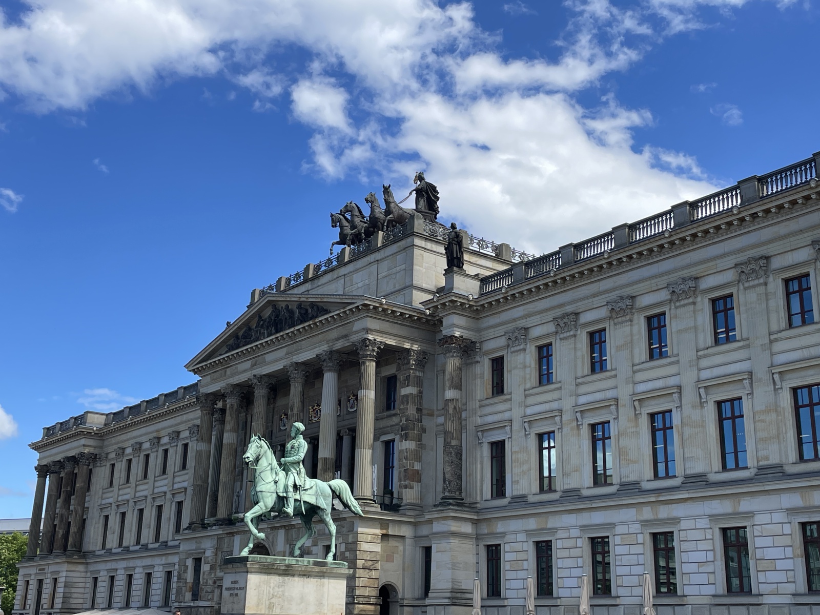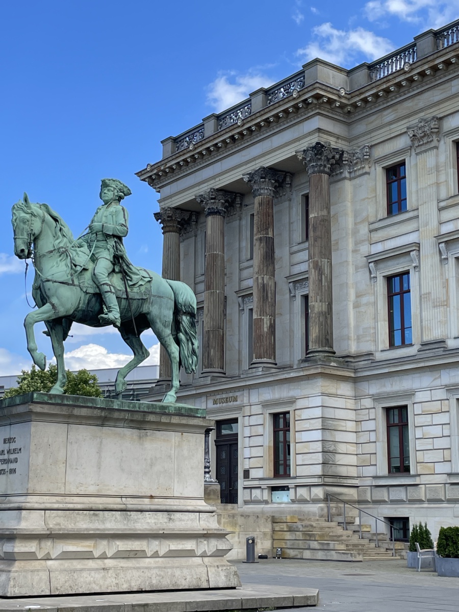 Jetzt kommen wir zum Braunschweiger Residenzschloss. Im Krieg stark beschädigt und schließlich vollständig abgetragen, wurde es anhand alter Pläne und historischen Fotos in ursprünglicher Größe hier am historischen Platz fast originalgetreu wieder aufgebaut. Oben auf den Schloss thront die größte Quadriga mit Wagenlenkerin Europas. Die Figurengruppe, bestehend aus der Stadtgöttin Brunonia und dem Wagengespann mit vier Pferden, wiegt 25,8 Tonnen, ist mehr als 9 Meter hoch, 7,5 Meter breit und 9,5 Meter lang. Im Erdgeschoss befindet sich das Schlossmuseum. Hier bekommt man schnell einen Eindruck davon, wie die das Leben am Hofe war. Am interessantesten ist der Thronsaal. Vor dem Schloss stehen zwei Reiterstandbilder. Diese stellen Herzog Carl Wilhelm Ferdinand und Herzog Friedrich Wilhelm auf ihren Pferden da. Gleich neben dem Schloss ist das Einkaufszentrum Schloss-Arkaden entstanden. Der große Springbrunnen sorgt im Sommer für eine frische Abkühlung. Sehr viele grüne Vogelhäuser stehen hier am Platz vor der einer Bank. Keine Ahnung warum. Sah aber interessant aus. Sehenswert ist natürlich auch das Staatstheater mit dem Cimiotti-Brunnen. Der Brunnen besteht aus zwei halbkugelförmigen Bronzeplastiken, aus denen große Blätter sprießen. Bei näherem Hinsehen erkennt man Schlangen, Schnecken und Vögel inmitten der Pflanzenmotive. Die Skulpturen liegen in einer großen Granitschale. Eines der ältesten Museen Europas ist das Herzog Anton Ulrich Museum mit seinen 4000 Kunstwerken aus 3000 Jahren auf 4000 Quadratmeter. Im Magniviertel steht das Städtische Museum, die Magnikirche und historische Fachwerkbauten mit Blumenschmuck. Ein Platz beschaulicher Ruhe findet man hinter der Magni-Kirche. Hier ist noch ein Stück Alt-Braunschweig erhalten geblieben. Besonders lustig finden wir das Happy RIZZI House. Seine bunte Fassade prägt das Stadtbild der Innenstadt. Der 22 Meter hohe Obelisk am Löwenwall ist ein Denkmal und erinnert an die Herzöge Karl Wilhelm Ferdinand und Friedrich Wilhelm, die im Kampf gegen Napoleon gefallen waren. Am Sockel befinden sich vier Bronzelöwen.