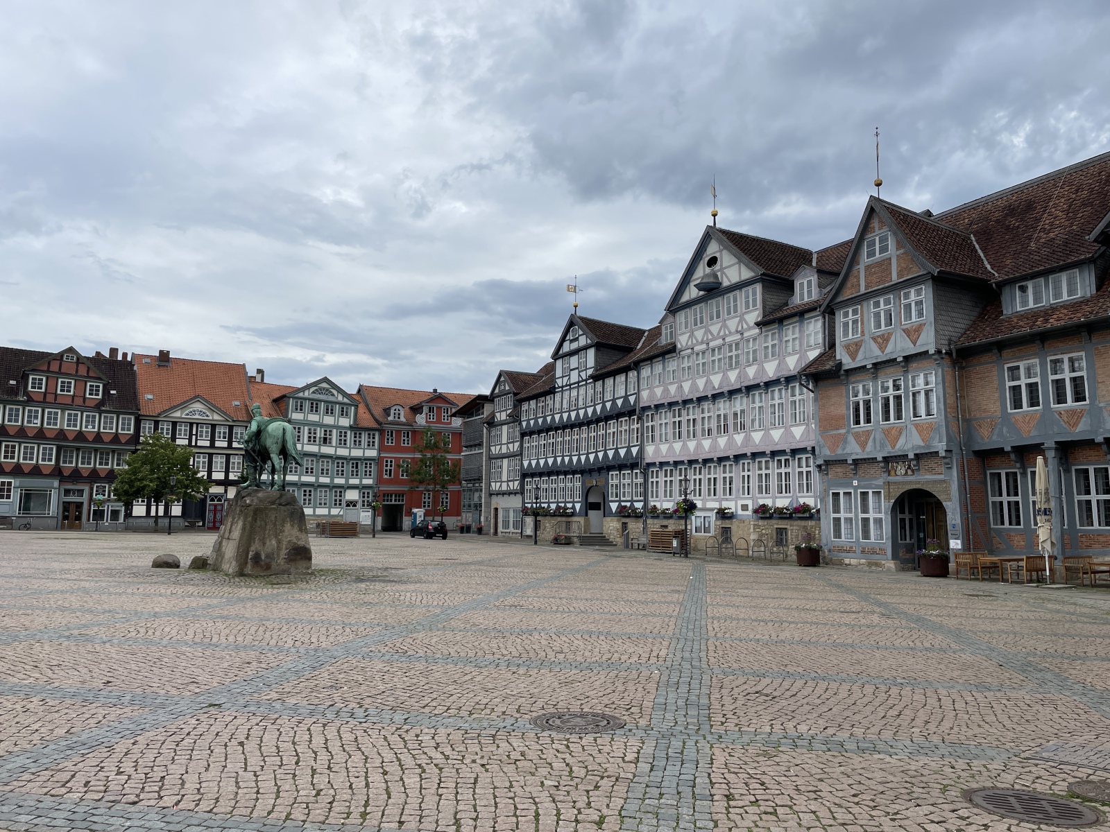 Kurz vor dem Kornmarkt steht auf der rechten Seite die große Haupt- oder Marienkirche. Die Hauptkirche Beatae Marae Virginis zu Wolfenbüttel ist der erste bedeutende protestantische Großkirchenbau der Welt. Sie sollte die Pracht und die Macht der Fürsten repräsentieren. Das ist denen gelungen, denn diese Kirche ist so gewaltig zwischen den schönen Fachwerkhäusern. Der Kornmarkt wird von der mächtigen Hauptkirche und den Hofbeamtenhäusern bestimmt. Die Alte Apotheke am Durchgang zum Stadtmarkt ist ein absoluter Hingucker. Wir können nicht wieder stehen und schauen mal durch die Fenster in die Apotheke. Jetzt sind wir auf dem Stadtmarkt. An jeder Seite des Stadtmarktes stehen wieder Hofbeamtenhäuser mit soviel Fachwerk. Als erstes fällt uns das Rathaus und die Stadtwaage mit ihren aufwendigen Fachwerk-und Backsteinfassaden auf. Der Rathauskomplex entstand aus ehemaligen Bürgerhäusern. Besondere Inschriften über den Türen zum Rathaus und zur Ratswaage zieren die Wände. Wir erkennen das Stadtwappen und ein Zitat aus dem Alten Testament. Zusätzlich sehen wir auch eine Waage und die Norm-Elle. Vor dem Rathaus steht das Denkmal von Herzog August neben seinem Pferd. Es sieht aus als stehe er auf einem Fels mit Wasserfall. Denn vorne plätschert das Wasser. Wir gehen weiter und kommen zu den Krambuden und Zimmerhöfe. Diese bildeten damals die Grenze zwischen herzogliche Residenz und der Bürgerstadt. Dies war der Ort für die gewerbetreibenden Krämer, die ihre Waren unter den Arkaden präsentierten. Am Kleinen Zimmerhof steht eine Sehenswürdigkeit und zwar das kleinste Haus der Stadt. Es hat eine Breite von 2,20 Meter und eine Länge von 3,50 Meter. Im inneren befindet sich eine 12 Meter hohe Wendeltreppe. Hier befinden sich überwiegend ehemalige Handwerkerhäuser. Am Großen Zimmerhof hatten die Zimmerleute ihren Platz. Es ist erstaunlich wie schnell immer die Zeit vergeht. Wir begeben uns jetzt langsam wieder Richtung Stellplatz und kommen durch die Krumme Straße. Da diese Straße noch so ursprünglich aussieht, gehört sie zu den romantischen Gassen. Hier gibt es ausschließlich Fachwerkhäuser und wir kommen uns vor, als wären wir in einer Märchenstraße. Die Fachwerkhäuser haben hier ihren ganz eigenen Charme. Wir gehen wieder durch den Park und sehen noch von weiten das Lessingtheater und den Wasserturm. Wir lassen den Abend ausklingen mit der Übereinstimmung, das wir uns sie nicht so schön vorgestellt haben.