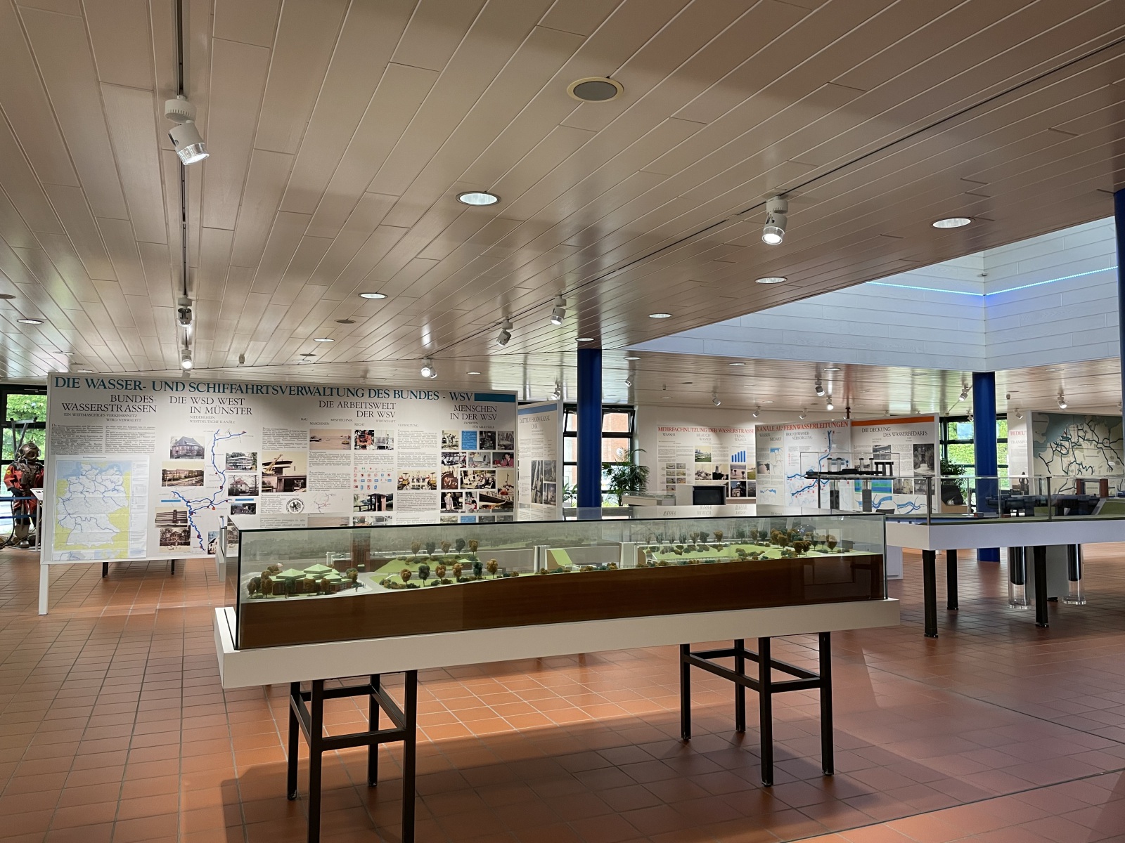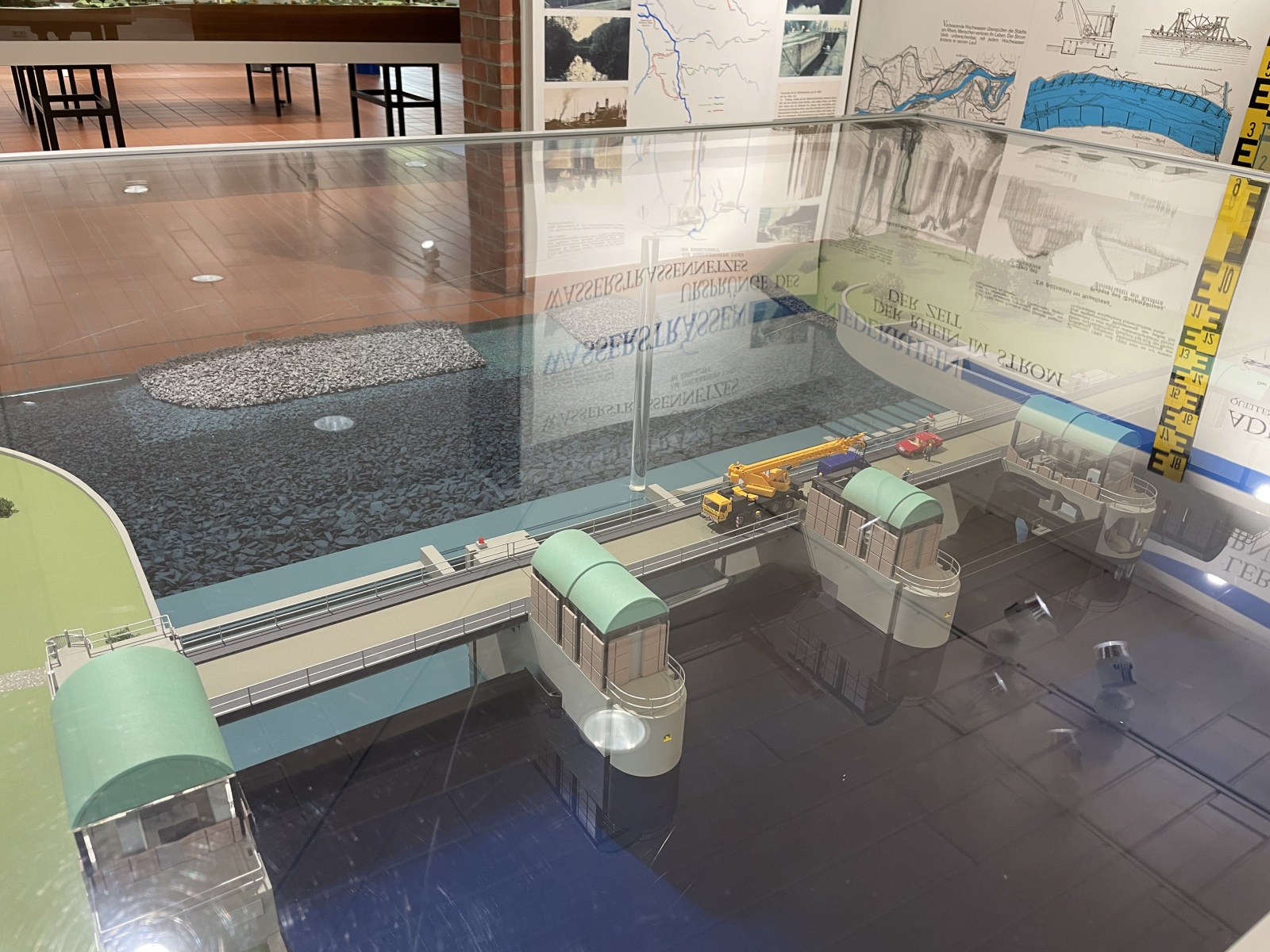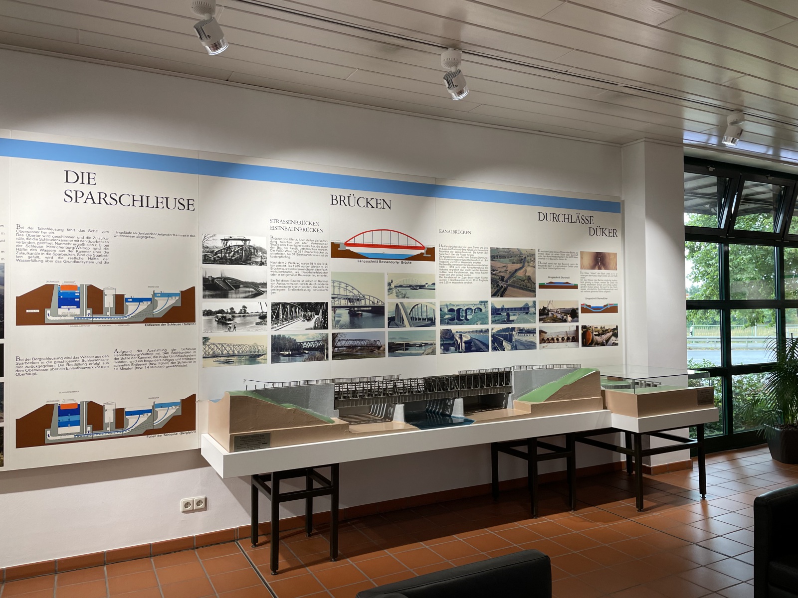 Auf dem Rückweg besuchen wir noch die Ausstellung Wasserstraßen und Schifffahrt. Hier bekommen wir Informationen über Wasserstraßen und über Bedeutung und Leistungen der Binnenschifffahrt. Wir erhalten Einblicke in den Ausbau und die Unterhaltung der Wasserstraßen, in die verschiedenen Bauarten und Funktionsweisen der dazugehörigen Anlagen wie Schleusen und Hebewerke, Wehre, Sicherheitstore, Brücken, Düker und Durchlässe. Als Themen werden die Bedeutung und Leistung der Binnenschifffahrt, die besonders enge Beziehung der Wasserstraßen zur Umwelt und die Mehrfachnutzung der Wasserstraßen behandelt. Besonders attraktiv sind die Modelle von den Bauwerken, die auf dem umliegenden Gelände in natura besichtigt werden können. Hier hätten wir gerne den laufenden und den ruhenden Schiffsverkehr und das Heben und Absenken der Schiffe in der Schleuse live erlebt, aber leider war dies zurzeit nicht möglich. Trotzdem war die Ausstellung sehr interessant. Kann man empfehlen.