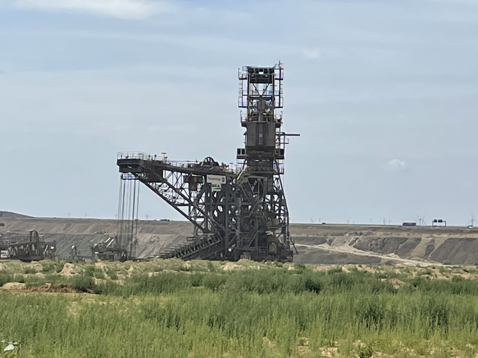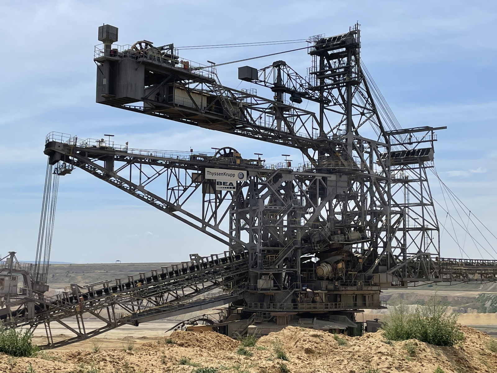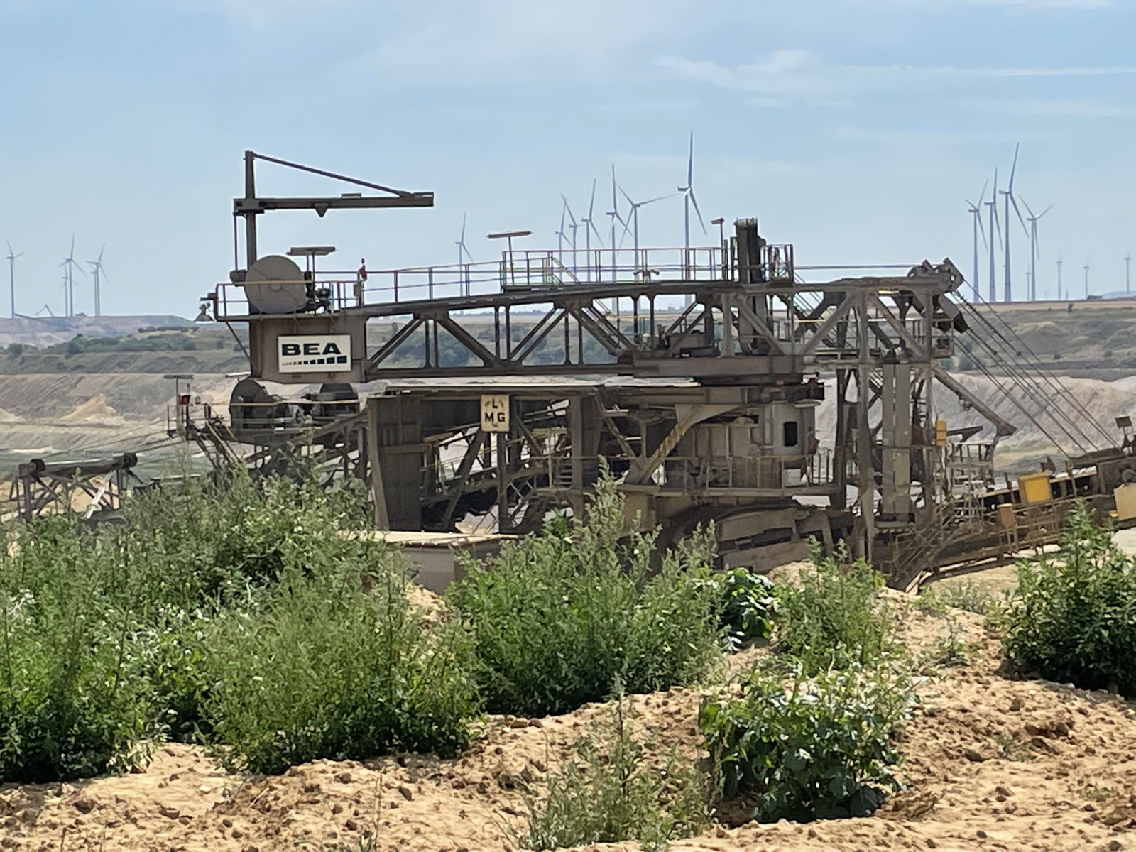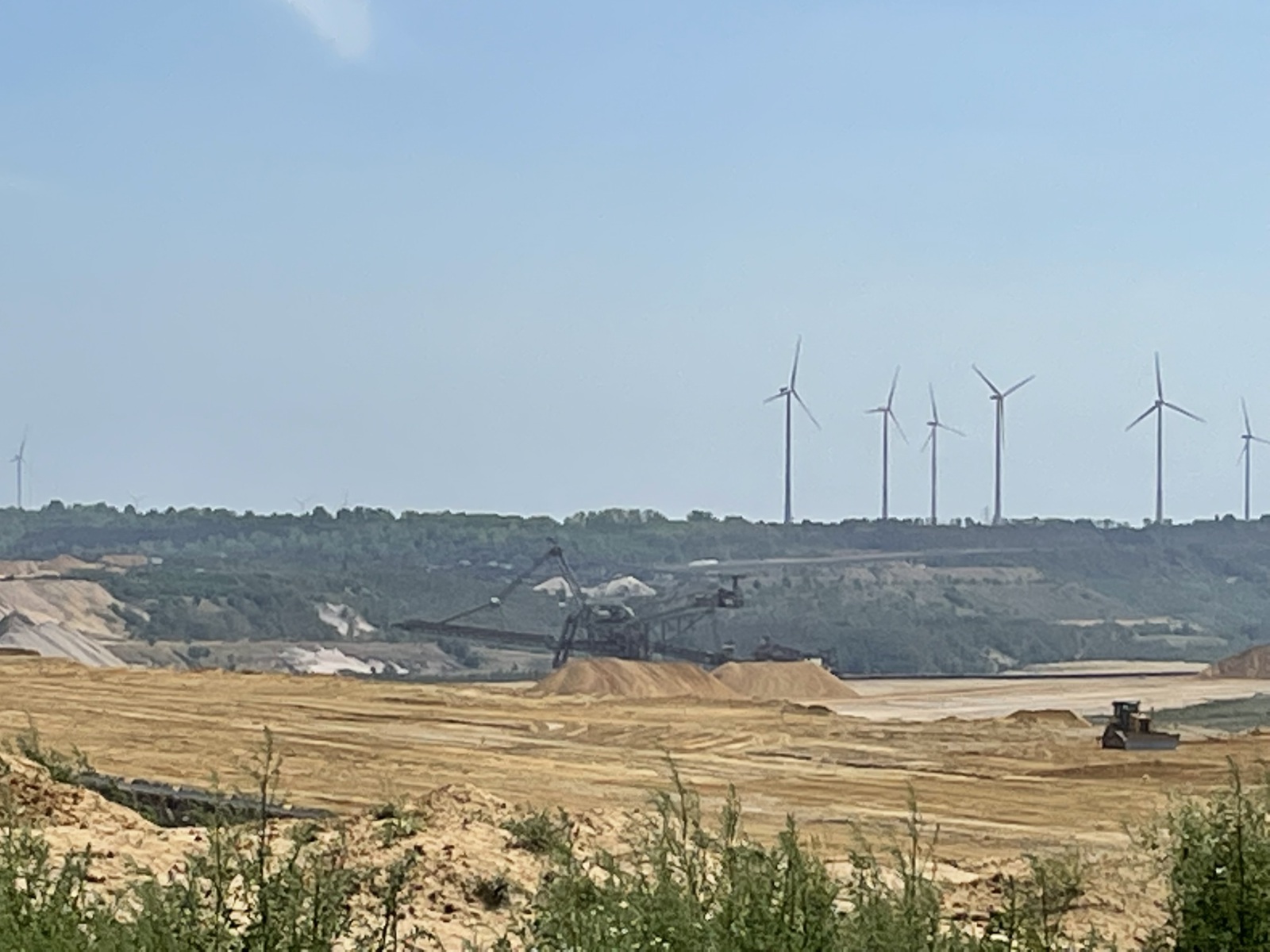 Wir fahren jetzt zu dem Wohnmobilstellplatz „Wohnmobilstellplatz Liedberg in Korschenbroich“ 51°9´50´´N/6°32´17´´E in Korschenbroich. Korschenbroich ist eine Stadt am Niederrhein in Nordrhein-Westfalen. Hier wohnen unsere Freunde und von diesem Platz aus haben wir es nicht weit zu ihnen. Angekommen treffen wir unsere Freunde auch gleich und verbringen einen schönen Abend. Wir planen den nächsten Tag und fahren somit zum Tagebau Jüchen. Obwohl man kann beim Tagebau Jüchen nicht unbedingt von Sehenswürdigkeit sprechen kann, bleiben wir bei dem Wort. Und außerdem sollte man sich das mal ansehen, alleine um mit sprechen zu können. Egal wie man zu dem Thema steht. Ich finde man muss etwas gesehen haben um sich eine Meinung bilden zu können. Uns interessiert das, weil wir schon ein paarmal die großen Bagger von der Autobahn aus gesehen haben. Da unsere Freunde nicht weit entfernt wohnen, zeigen sie uns den Tagebau aus der Nähe und können uns natürlich auch etwas darüber erzählen. Jüchen ist eine mittlere kreisangehörige Stadt im Rhein-Kreis Neuss in Nordrhein-Westfalen. Sie liegt zwischen Mönchengladbach und Grevenbroich. Südwestlich von Jüchen liegt der Tagebau Garzweiler. Die zur Gemeinde Jüchen gehörenden Ortsteile Otzenrath und Spenrath wurden deshalb abgerissen und umgesiedelt. Der Braunkohletagebau Garzweiler ist von einem Aussichtspunkt aus einzusehen. Im Abbaufeld Garzweiler wird seit mehr als 100 Jahren Braunkohle gefördert und überwiegend in der Region verbrannt. Es gibt zwei Aussichtspunkte am Tagebau Garzweiler. Zum einen sollte man von einem Skywalk am südlichen Ende des Tagebaus einen Blick ins Abbaugebiet gehabt haben. Diesen Skywalk soll es wohl nicht mehr geben. Der zweite Aussichtspunkt befindet sich am nördlichen Ende. Ich weiß nicht genau, ob das die Stelle ist von der wir das Gebiet sehen können. Die Größe des Tagebaus ist schon imposant, wobei die Natur ganz schön verschandelt wird. Jeder der sich für den Tagebau interessiert hat hier mal einen tollen Einblick. Es gibt hier einen kleinen Hügel mit Sitzgelegenheit und Informationstafeln. Wir sehen den großen Schaufelradbagger und können ziemlich nahe ran gehen. Der Bagger ist ganz schön groß. Wir sehen eine Zeit lang zu und erkennen, dass der Bagger dabei ist die Löcher wieder zu verfüllen. Wir erfahren, dass die Stadt Jüchen fordert, die Gruben im Braunkohletagebau Garzweiler schneller zu verfüllen, denn sie will Raum schaffen – fürs Leben, Wohnen und Arbeiten. Dann gehen wir zurück und informieren uns noch an den Informationstafeln. Wir werden uns in ein paar Jahren mal ansehen, was dann aus diesem Gebiet geworden ist.