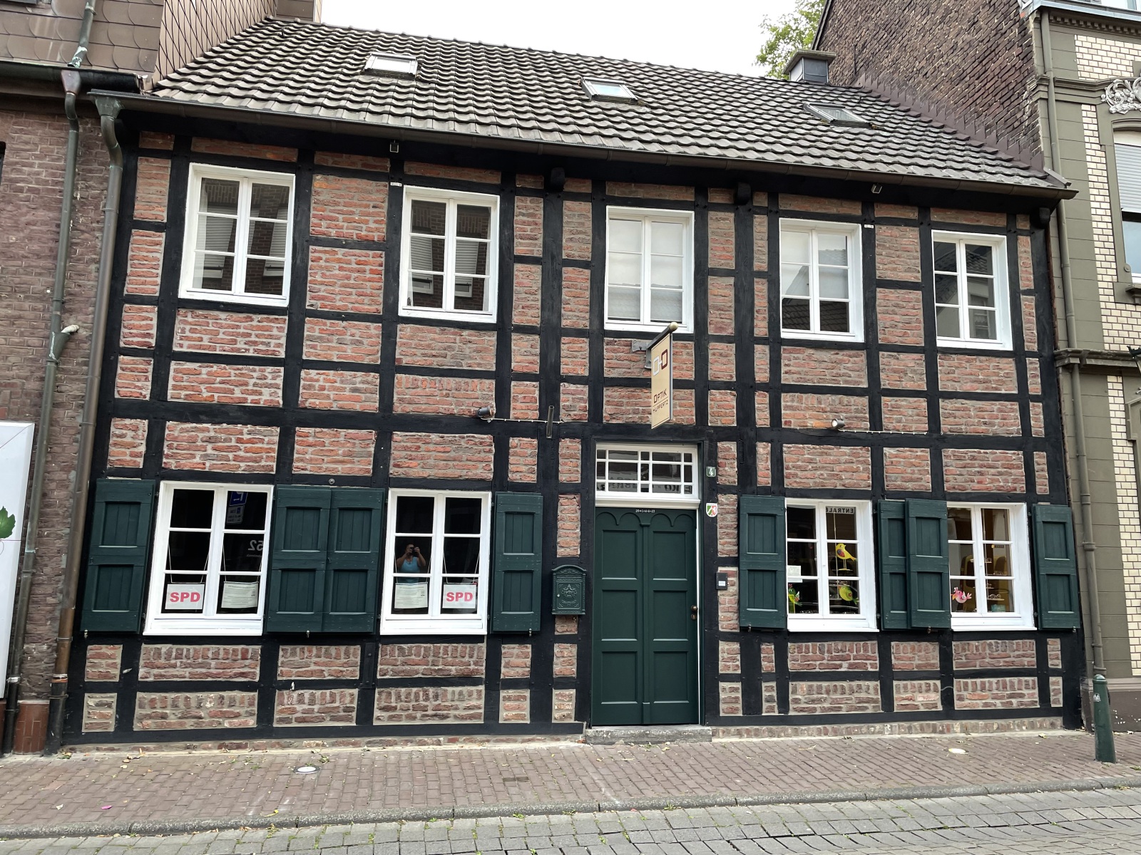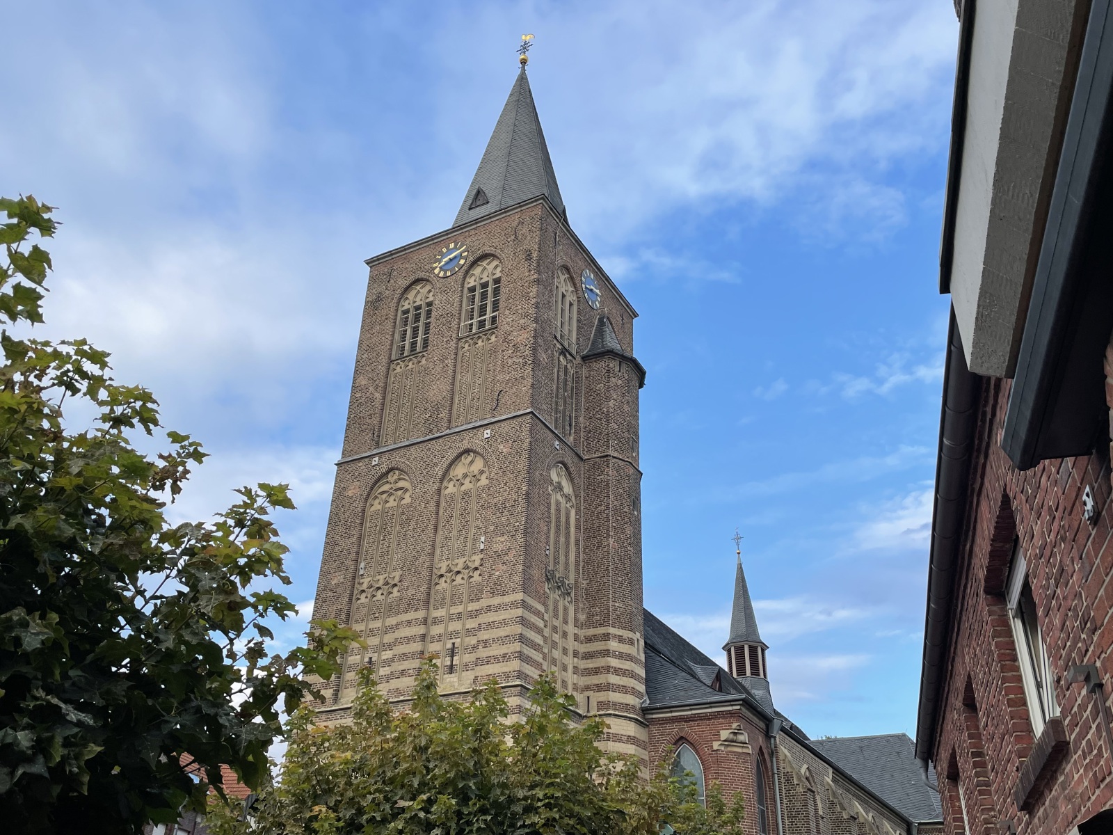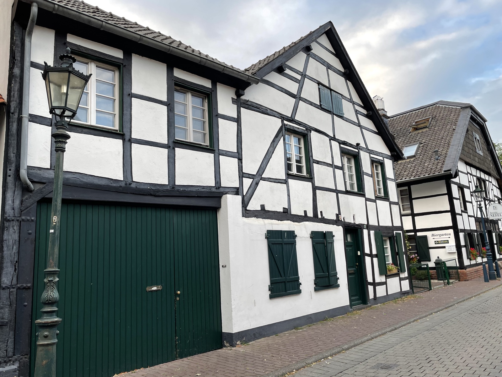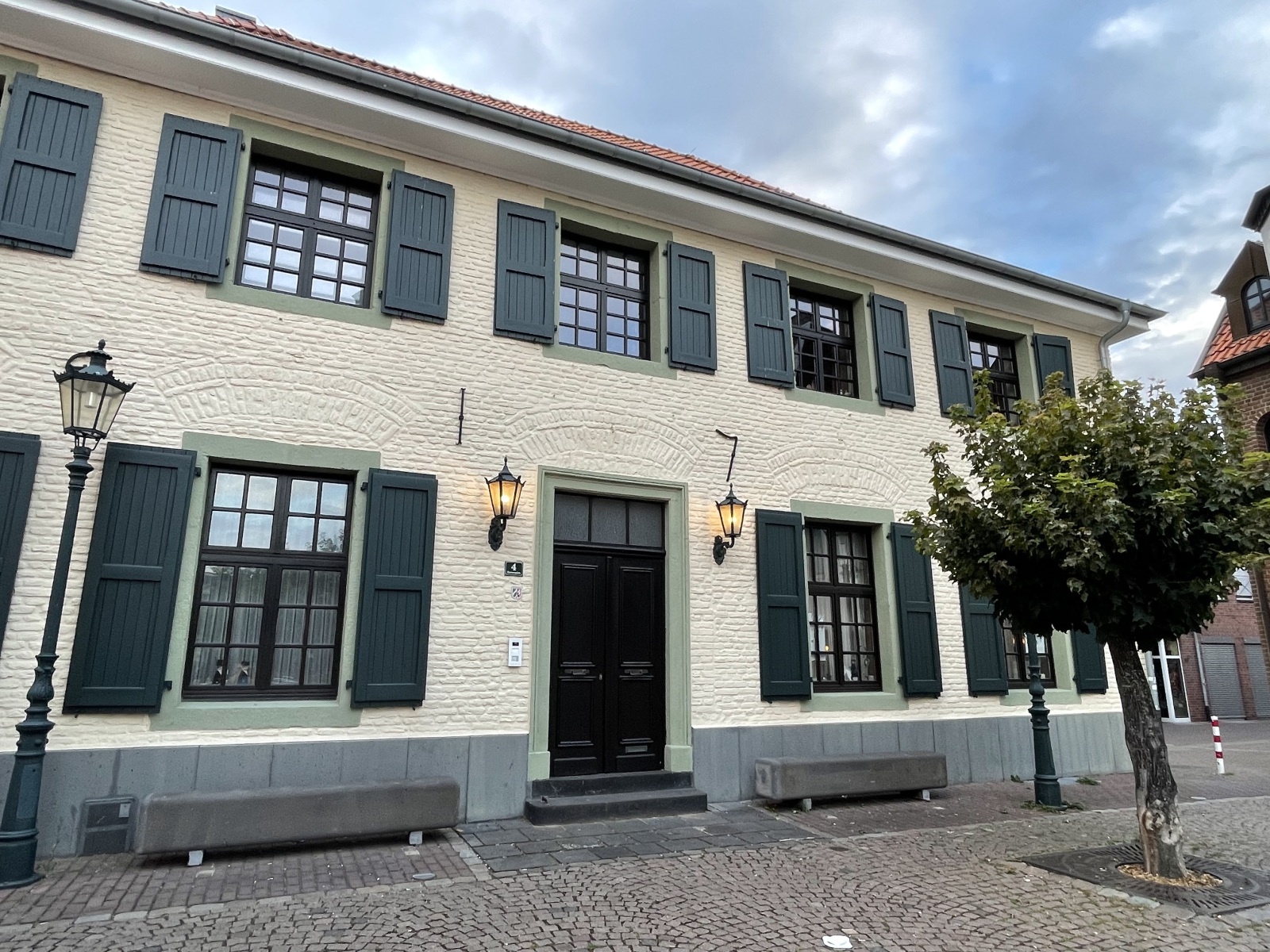 Am Abend fahren wir in die Stadt von Korschenbroich. Uns fällt auf, das es im charmanten und gepflegten Ortskern viel einladende Gastronomie gibt und somit gehen wir erst einmal lecker essen. Wir entscheiden uns für ein Lokal in einem alten Fachwerkhaus, dessen Besonderheit eine durchgängige Glasfassade ist. Tolle Atmosphäre. Im Lokal befindet sich auch noch ein alter Teil mit einer sehenswerten Theke. Ich erfahre, dass hier früher sogar die Pferde mit in die Kneipe durften. Habe sogar ein Beweisfoto bekommen. Nach dem Essen unternehmen wir einen Spaziergang durch die Stadt und haben dafür die besten Stadtführer dabei . Korschenbroich ist modern und geschichtsträchtig zugleich. Die Historie der Stadt dokumentieren zahlreiche Fachwerkhäuser. Sehenswert ist auch die römisch-katholische Pfarrkirche Kirche St. Andreas. Eine Bronzetafel gibt einen kurzen Abriss über die Geschichte der Kirche. Der zum Kirchplatz gerichtete Seiteneingang trägt wegen der kassettenförmigen Reliefs den schönen Namen Verkündigungsportal. Interessant ist auch die bekrönende Engelsfigur mit Trompete. Hier auf dem Kirchplatz steht der Andreas-Brunnen. Ein sehr schönes Gebäude ist auch das ehemalige Gerichts-und Weinhaus Hannenplatz 4. Es wird langsam spät und wir werden zum Platz zurück gebracht. Morgen gibt es noch ein leckeres Frühstück, bevor wir uns wieder auf den Heimweg machen.