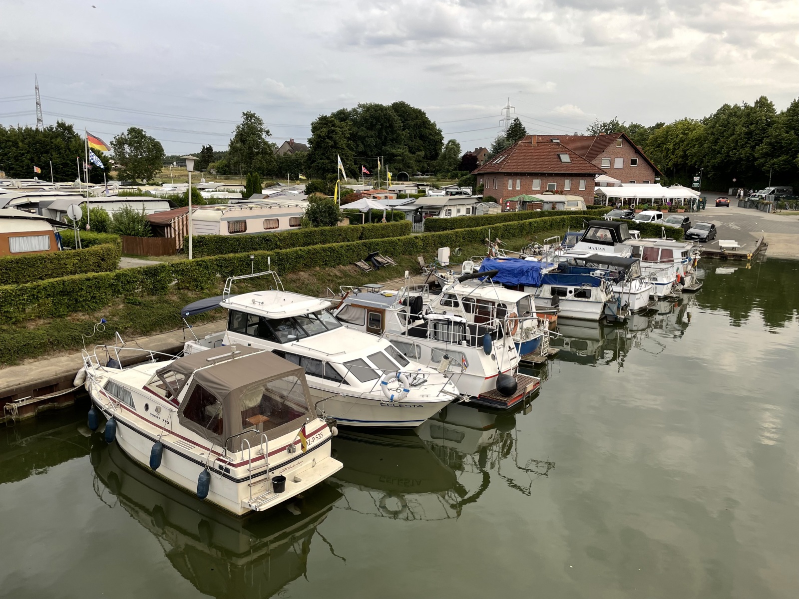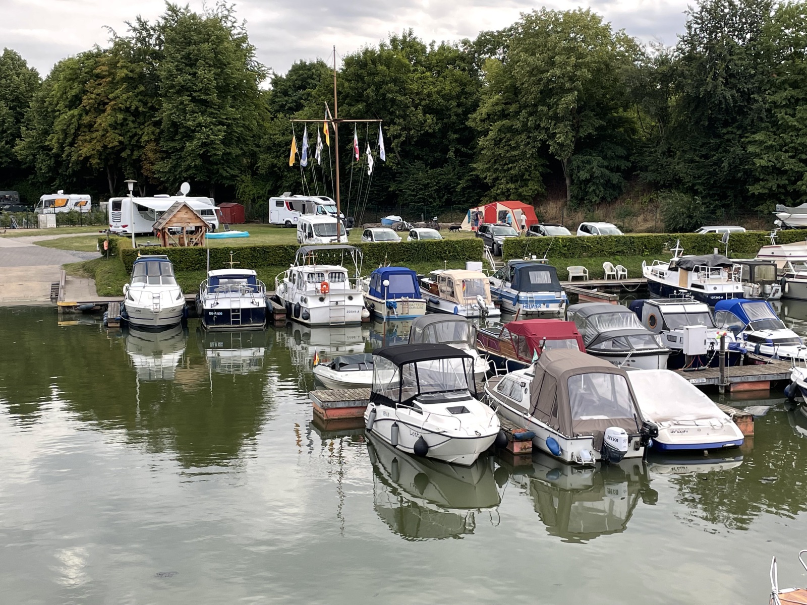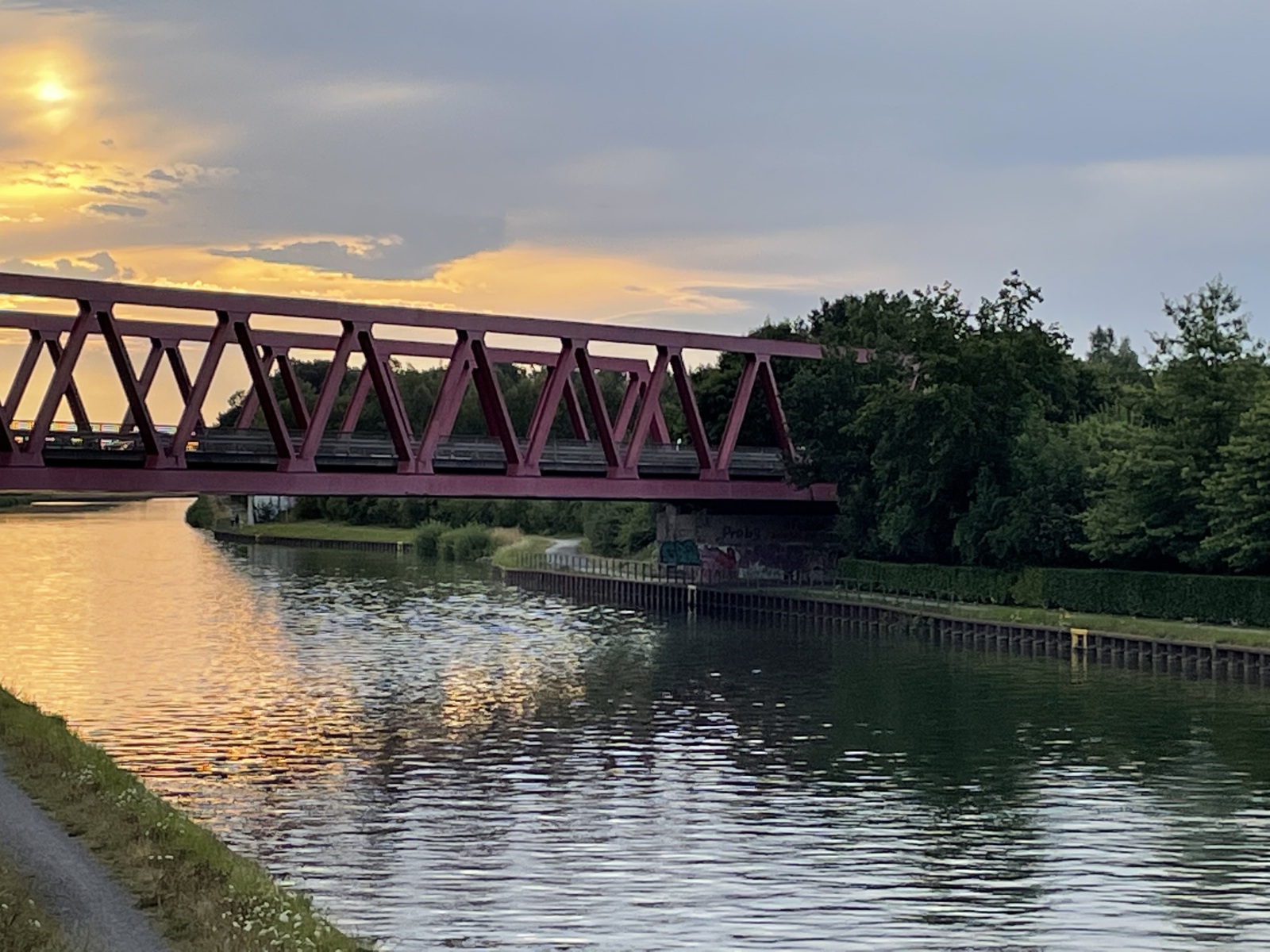 Da wir Freunde in Korschenbroich besuchen wollen, nutzen wir die Gelegenheit, uns an diesem Wochenende noch ein paar Sehenswürdigkeiten anzusehen. Das kennt ihr doch sicherlich auch, man will sich gerne etwas ansehen, aber nicht unbedingt Urlaub dafür opfern. Also verbindet man das Schöne mit dem Nützlichen. Da wir nicht so weit von der ersten Sehenswürdigkeit entfernt sein wollen, haben wir uns den Wohnmobilstellplatz „Wohnmobilstellplatz Camp Marina Ribbrock in Waltrop“ 51°3´22´´N/7°22´36´´E ausgesucht. Von hier brauchen wir dann morgen früh nur noch sieben Kilometer fahren. Wir haben einen guten Platz, auch wenn wir hier sozusagen vor der Schranke stehen. Wir nutzen das oft, dann sind wir unabhängig und können weiterfahren wann wir wollen. An diesem schönen Abend unternehmen wir noch einen Sparziergang zum Datteln-Hamm-Kanal. Wir stehen hier auf einer Brücke und haben von einen richtig guten Blick auf den Yachthafen. Unter uns befindet sich die Hafenausfahrt direkt auf den Datteln-Hamm-Kanal. Langsam geht die Sonne unter und wir gehen zurück zum Platz.