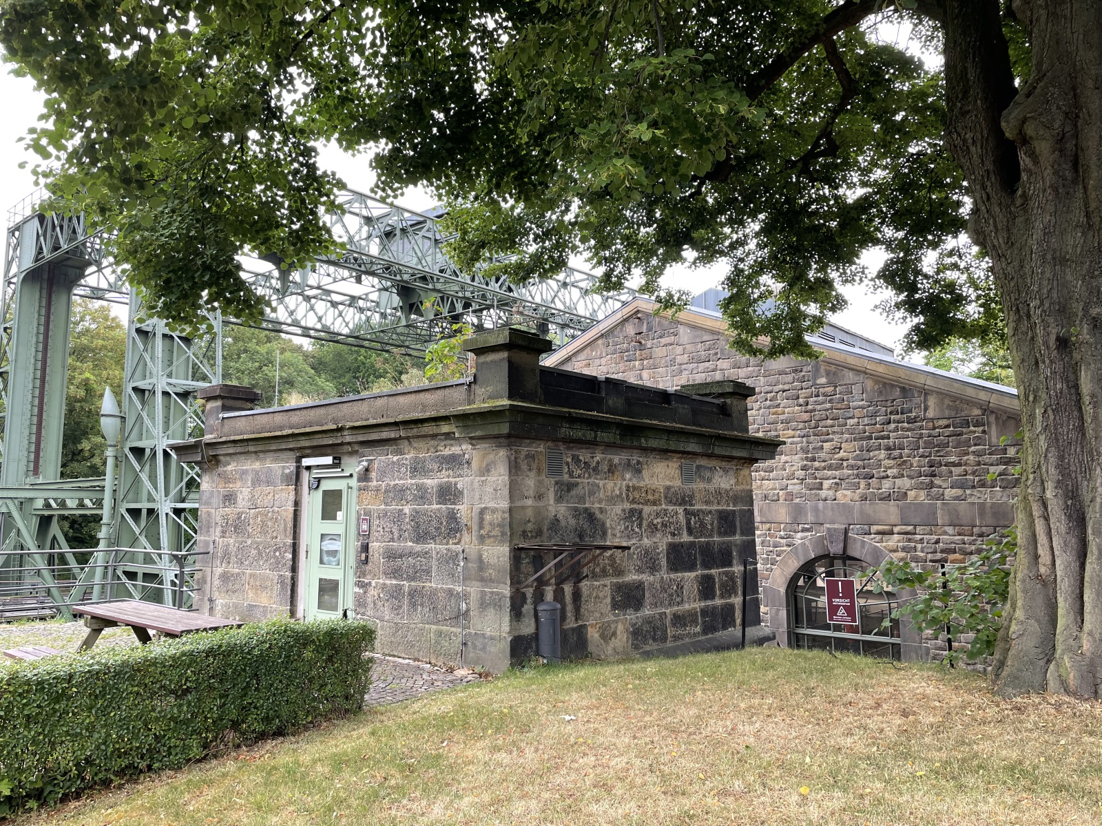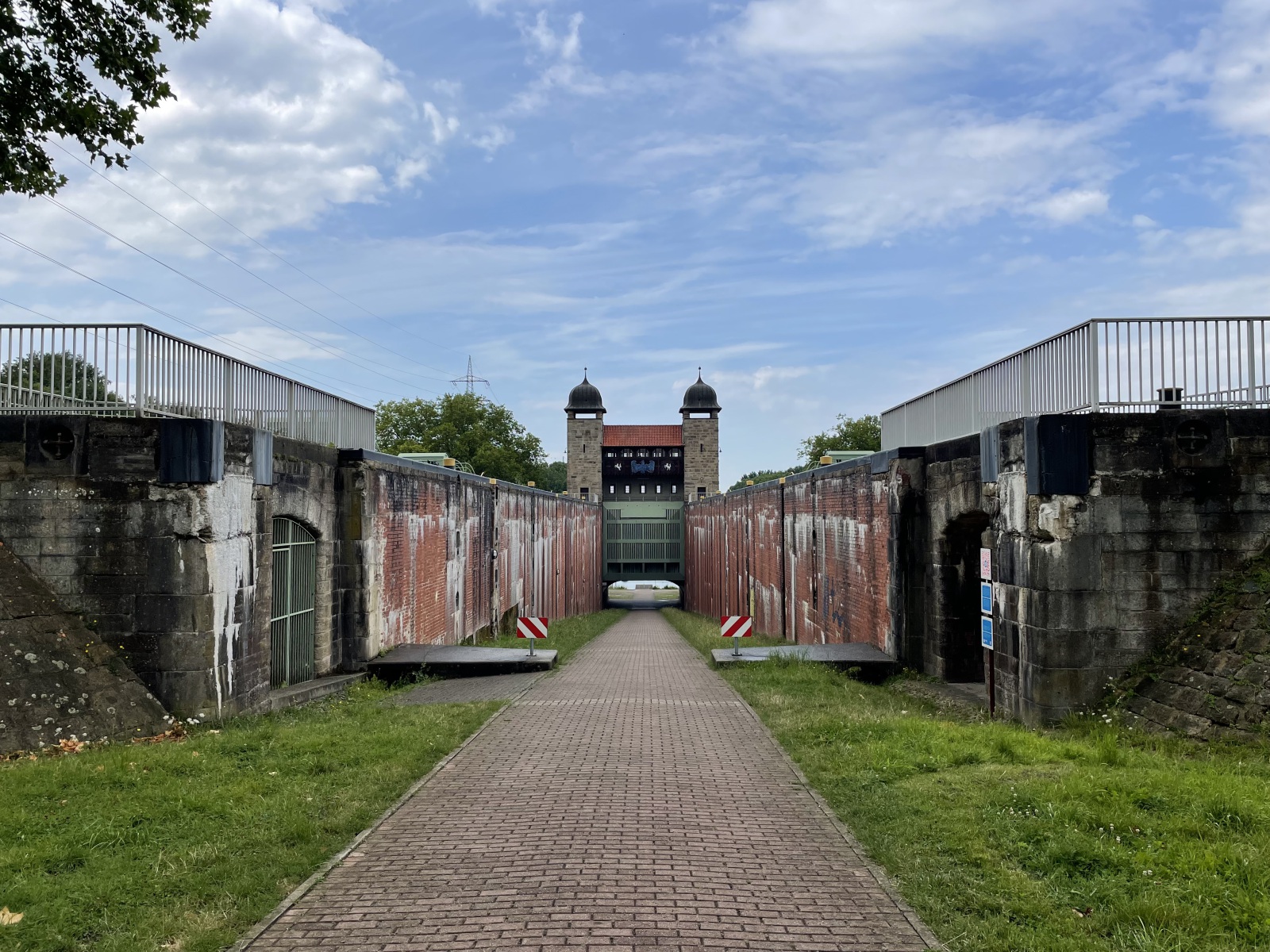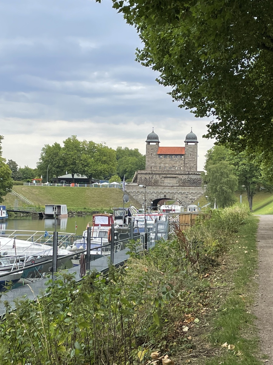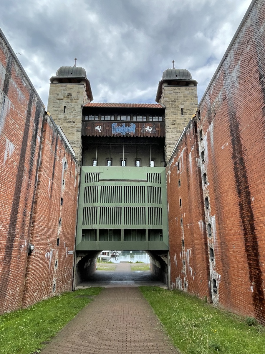 Wir gehen den Kanaluferweg entlang und kommen so zu der alten Schlachtschleuse. Hier wurde eine schöne parkähnliche Anlage errichtet. Wir lesen, dass der Stolz und Kern der frei zugänglichen Anlage die Alte Schachtschleuse aus dem Jahre 1914 mit ihren westlichen Sparbecken ist. Sie dienten dazu, während des Schleusenvorgangs Wasser zu sparen und das notwendige und aufwendige Wiederauffüllen des Oberwassers auf dem Abschnitt zwischen Waltrop und Dortmund zu minimieren. Das Prinzip der Schleuse ist sehr einfach: Das Schiff fährt in die Schleusenkammer, in der der Wasserspiegel anschließend langsam auf das untere oder obere Niveau angepasst wird, also abgesenkt oder erhöht wird. Danach kann das Schiff die Schleuse höhengleich auf der anderen Seite verlassen. Beim Rückbau der Schleuse nach ihrer Schließung 1989 wurden die östlichen Sparbecken entfernt und jetzt befindet sich dort ein Parkplatz. Ebenfalls entfernt wurden die Schleusentore. Ein Fußgängerweg führt uns mitten durch das nur 10 Meter breite Schleusenbecken und unter dem Schleusentor mit seinen romantischen Türmchen hindurch vom ehemaligen Ober- zum Unterwasser. Meterhoch ragen die Backsteinwände des Schleusenbeckens neben uns rechts und links in die Höhe. Ein betonierter Poller zeigt uns, dass hier früher Schiffe gefahren sind. Das Alte Hebewerk und die Alte Schleuse wurden ergänzt durch das Neue Hebewerk.