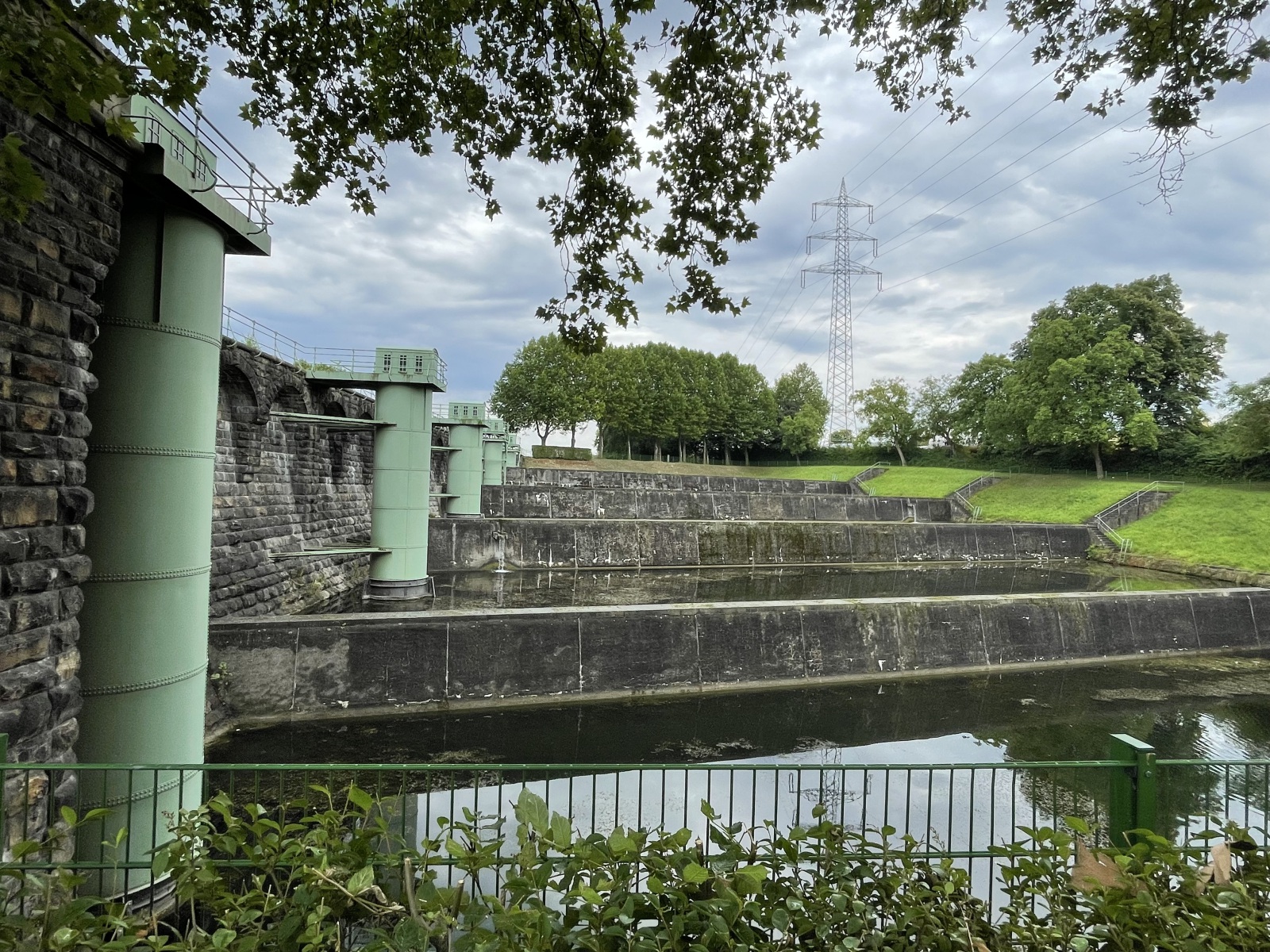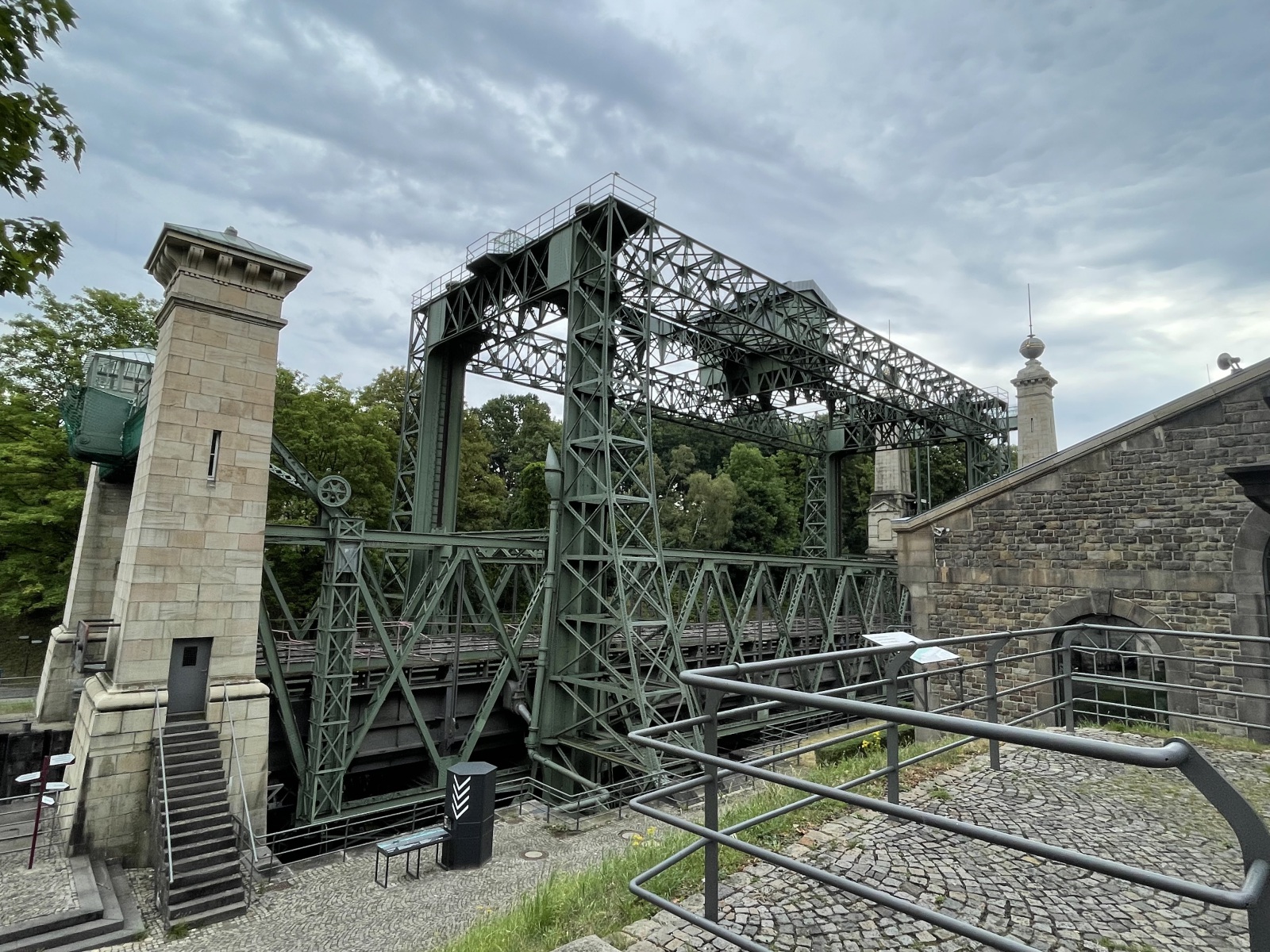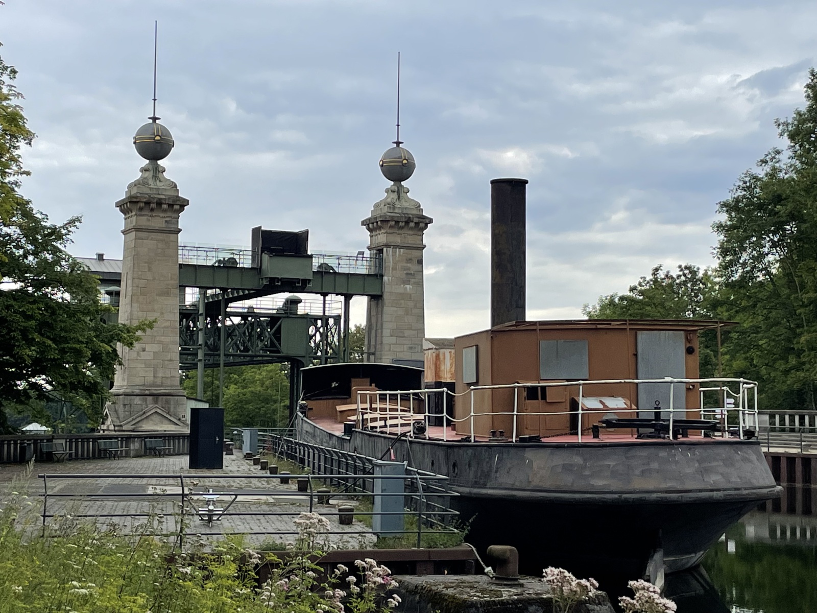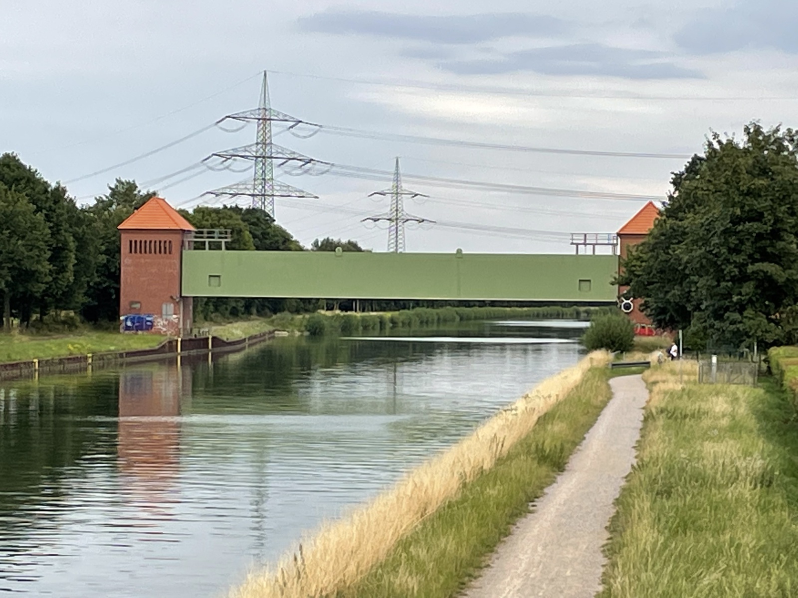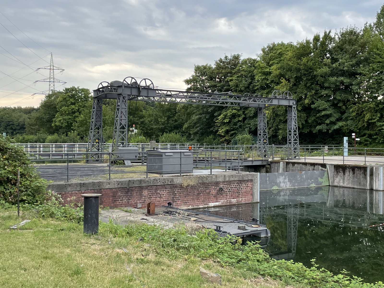 Wir gehen den Kanaluferweg entlang und kommen so zu der alten Schlachtschleuse. Hier wurde eine schöne parkähnliche Anlage errichtet. Wir lesen, dass der Stolz und Kern der frei zugänglichen Anlage die Alte Schachtschleuse aus dem Jahre 1914 mit ihren westlichen Sparbecken ist. Sie dienten dazu, während des Schleusenvorgangs Wasser zu sparen und das notwendige und aufwendige Wiederauffüllen des Oberwassers auf dem Abschnitt zwischen Waltrop und Dortmund zu minimieren. Das Prinzip der Schleuse ist sehr einfach: Das Schiff fährt in die Schleusenkammer, in der der Wasserspiegel anschließend langsam auf das untere oder obere Niveau angepasst wird, also abgesenkt oder erhöht wird. Danach kann das Schiff die Schleuse höhengleich auf der anderen Seite verlassen. Beim Rückbau der Schleuse nach ihrer Schließung 1989 wurden die östlichen Sparbecken entfernt und jetzt befindet sich dort ein Parkplatz. Ebenfalls entfernt wurden die Schleusentore. Ein Fußgängerweg führt uns mitten durch das nur 10 Meter breite Schleusenbecken und unter dem Schleusentor mit seinen romantischen Türmchen hindurch vom ehemaligen Ober- zum Unterwasser. Meterhoch ragen die Backsteinwände des Schleusenbeckens neben uns rechts und links in die Höhe. Ein betonierter Poller zeigt uns, dass hier früher Schiffe gefahren sind. Das Alte Hebewerk und die Alte Schleuse wurden ergänzt durch das Neue Hebewerk.