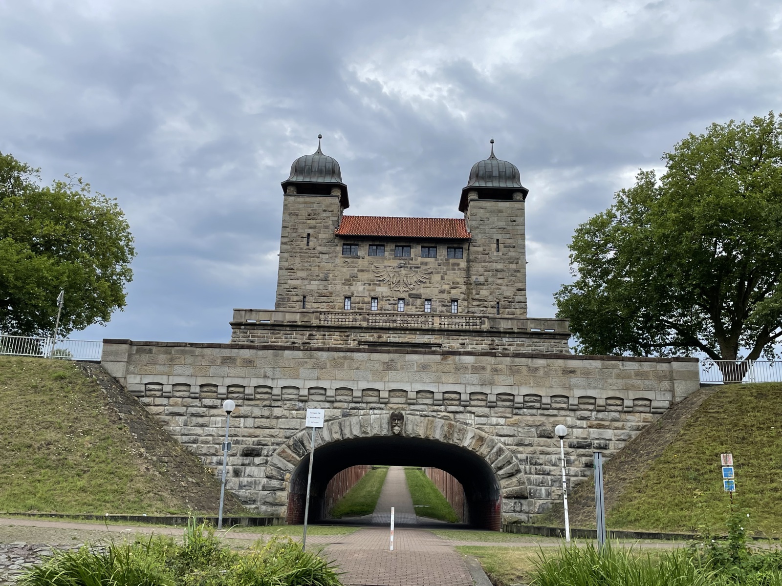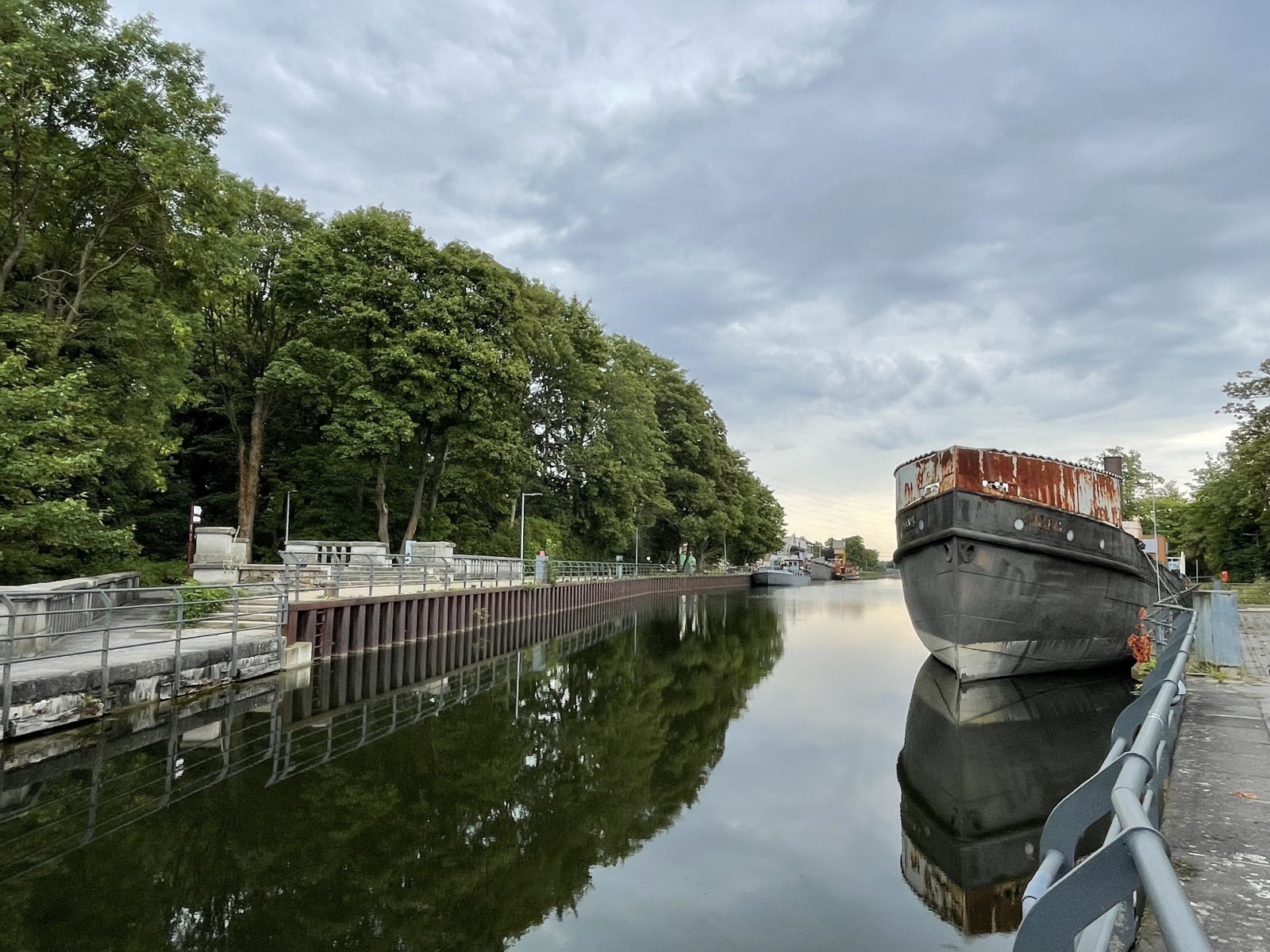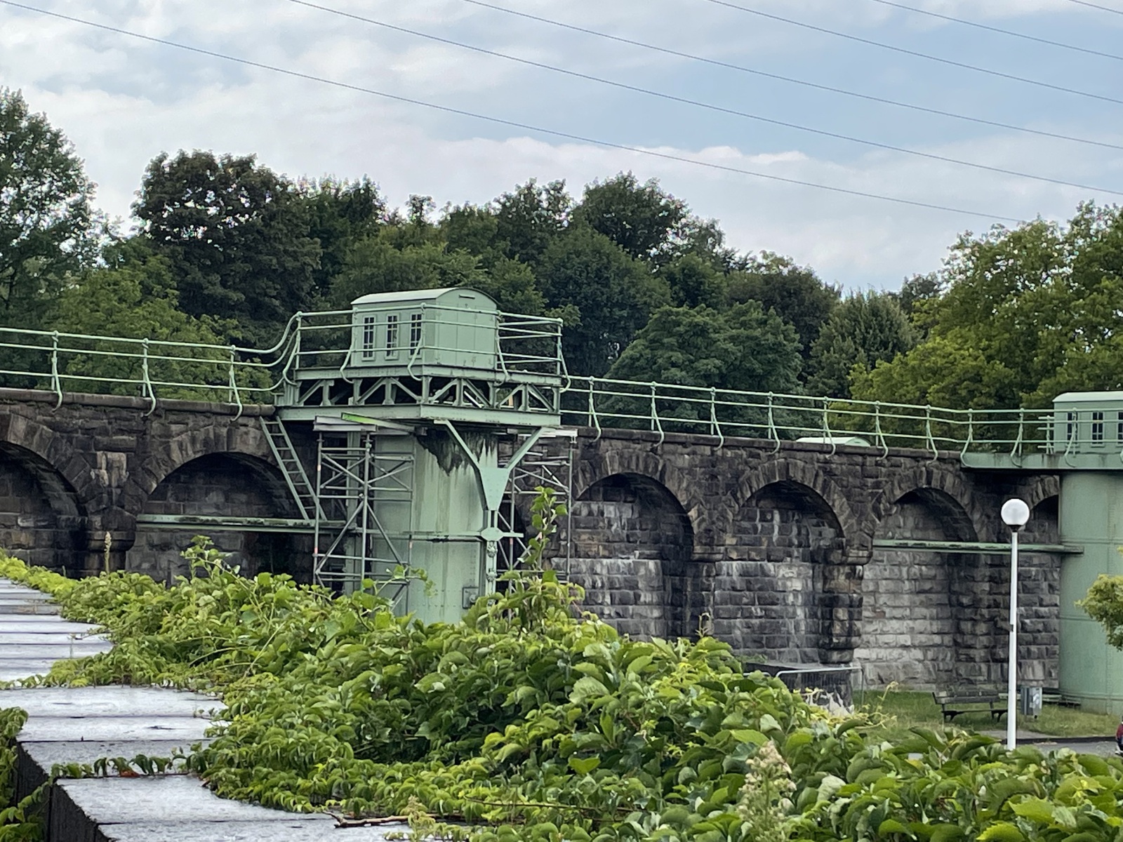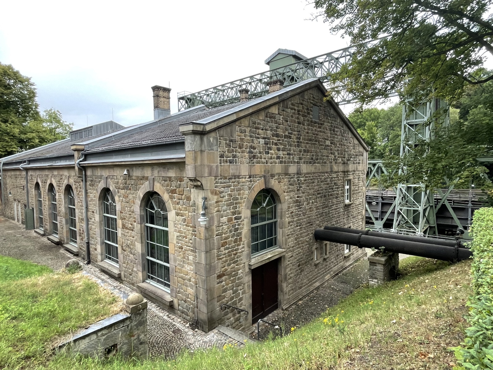 Wir gehen den Kanaluferweg entlang und kommen so zu der alten Schlachtschleuse. Hier wurde eine schöne parkähnliche Anlage errichtet. Wir lesen, dass der Stolz und Kern der frei zugänglichen Anlage die Alte Schachtschleuse aus dem Jahre 1914 mit ihren westlichen Sparbecken ist. Sie dienten dazu, während des Schleusenvorgangs Wasser zu sparen und das notwendige und aufwendige Wiederauffüllen des Oberwassers auf dem Abschnitt zwischen Waltrop und Dortmund zu minimieren. Das Prinzip der Schleuse ist sehr einfach: Das Schiff fährt in die Schleusenkammer, in der der Wasserspiegel anschließend langsam auf das untere oder obere Niveau angepasst wird, also abgesenkt oder erhöht wird. Danach kann das Schiff die Schleuse höhengleich auf der anderen Seite verlassen. Beim Rückbau der Schleuse nach ihrer Schließung 1989 wurden die östlichen Sparbecken entfernt und jetzt befindet sich dort ein Parkplatz. Ebenfalls entfernt wurden die Schleusentore. Ein Fußgängerweg führt uns mitten durch das nur 10 Meter breite Schleusenbecken und unter dem Schleusentor mit seinen romantischen Türmchen hindurch vom ehemaligen Ober- zum Unterwasser. Meterhoch ragen die Backsteinwände des Schleusenbeckens neben uns rechts und links in die Höhe. Ein betonierter Poller zeigt uns, dass hier früher Schiffe gefahren sind. Das Alte Hebewerk und die Alte Schleuse wurden ergänzt durch das Neue Hebewerk.