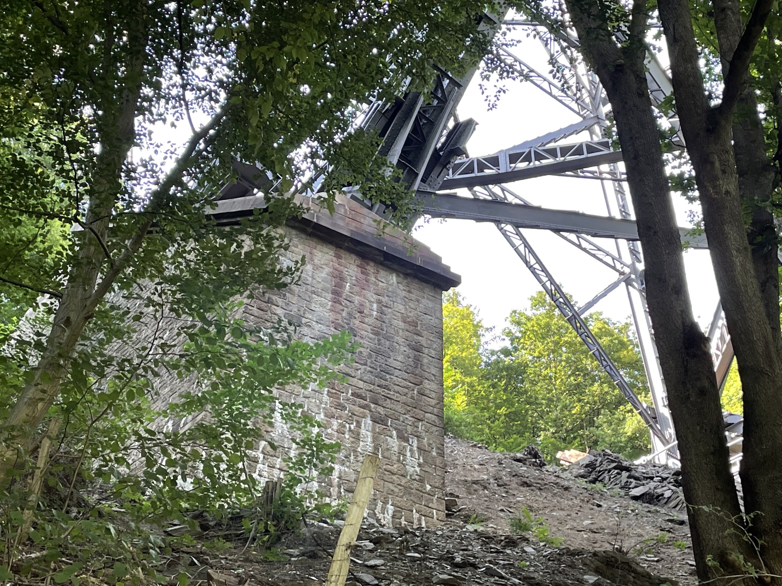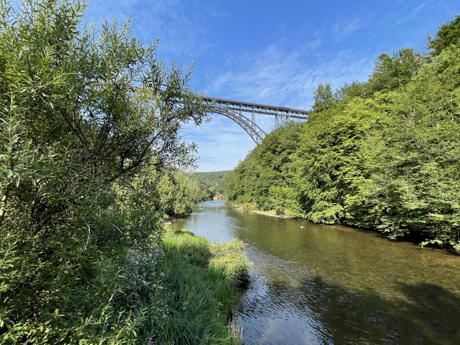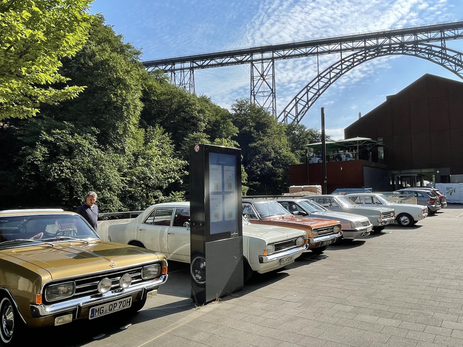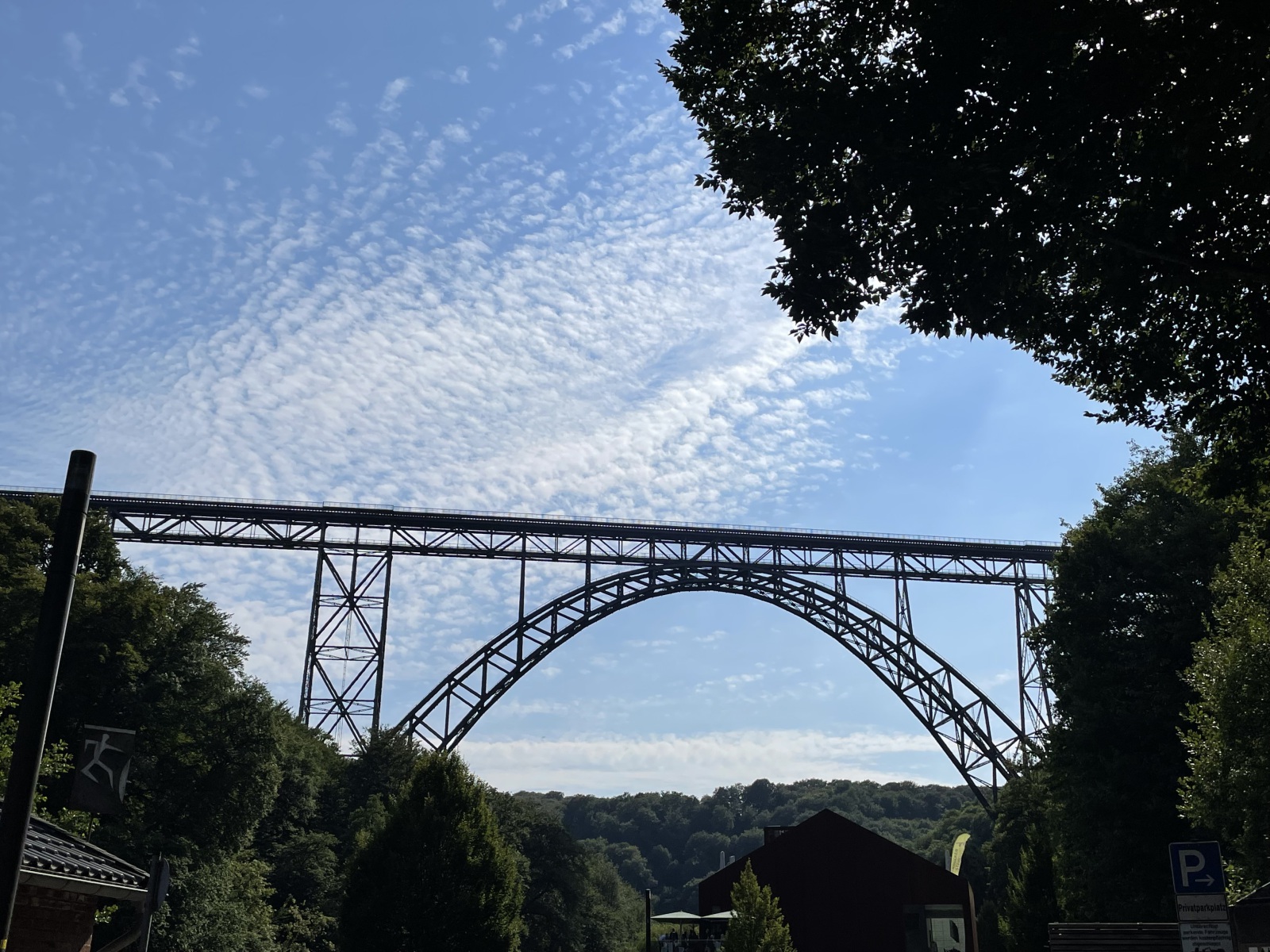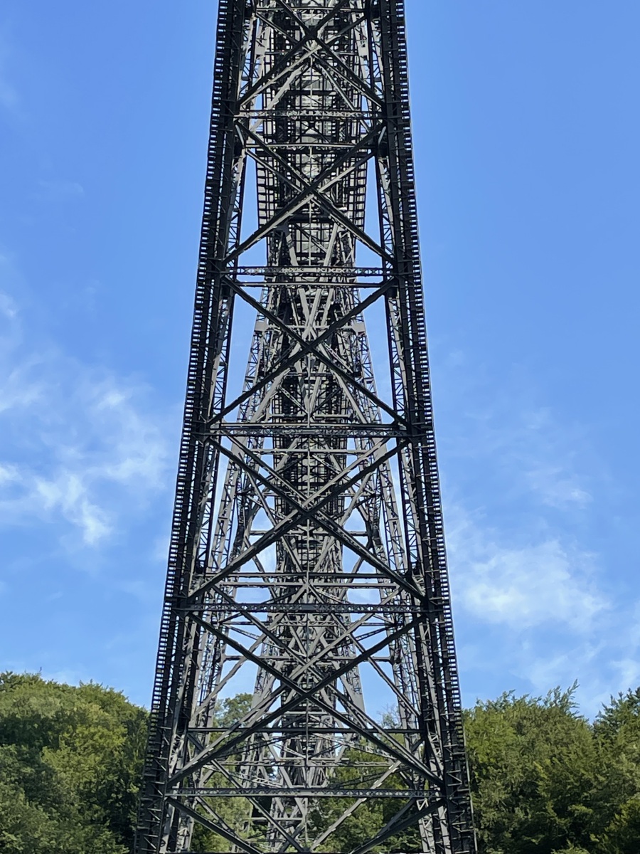 Unsere zweite Sehenswürdigkeit ist die Müngstener Brücke. Müngsten war eine Ansiedlung sowie ein Industrie- und ein beliebter Ausflugsort. Heute ist Müngsten nur noch eine Flurbezeichnung für das Grenzgebiet der Städte Wuppertal, Solingen und Remscheid am Zusammenfluss von Wupper und Morsbach. Da am Brückenpark nicht so viele Parkmöglichkeiten für Wohnmobile sind, parken auf einem Parkplatz der etwas weiter entfernt liegt und gehen den Rest des Weges zu Fuß. Als wir um die letzte Ecke kommen, sehen wir sie schon. Sie ist so groß und wirkt so gewaltig. Wir müssen immer wieder nach oben sehen. Wir haben sogar richtig Glück. Auf dem Parkplatz stehen bestimmt 20 Opel Oldtimer. Die stolzen Besitzer haben sich zu einem Opel Treffen getroffen und nehmen hier eine Führung teil. Jetzt müssen wir uns erst einmal die Fahrzeuge ansehen. Die alten Fahrzeuge sind schon toll. Mein erstes Auto war auch ein Opel. Ein Opel Kadett. Aber jetzt widmen wir uns wieder der Brücke. Wir gehen weiter und haben die Chance bei der Führung mit zu hören und erfahren einiges über die Brücke. Die Müngstener Brücke ist die ehemalige Kaiser-Wilhelm-Brücke und die höchste Eisenbahnbrücke Deutschlands. Sie überspannt zweigleisig zwischen den Städten Remscheid und Solingen in 107 Meter Höhe das Tal der Wupper. Die 6 Gerüstpfeiler haben eine maximale Höhe von 69 Meter. Der Bau der Brücke stellte zum Ende des 19.Jahrhunderts eine Ingenieursleistung dar, die in ihrer hochtechnisierten Konstruktion und Realisierung im starken Kontrast zur Erlebniswelt des Großteils der staunenden Bevölkerung stand. Obwohl die Brücke Kaiser-Wilhelm-Brücke getauft wurde, kam Kaiser Wilhelm II nicht zur feierlichen Einweihung. Wir gehen weiter und sehen, dass sich unter der Brücke ein Park mit einer Auenlandschaft befindet. Noch ein Stück weiter finden wir die Hauptattraktion. Das ist eine handbetriebene Schwebefähre mit der wir die Flussseite wechseln können. Da hier viel Andrang herrscht, sehen wir eine Zeitlang zu und stellen fest, dass das ganz schön anstrengend sein muss und probieren es aus. Auf dem Rückweg entdecken wir eine Reihe stählerner Plattformen, auf denen themenspezifische Rätsel und deren Lösungen zu lesen oder zu hören sind. Unterhalb der Brücke erinnert eine Gedenktafel an die Bauleute. Außerdem gibt es Gedenktafel zur Erinnerung an den Besuch vom Kaiser-Wilhelm II. Hier am Ufer der Wupper stehen überall Liegestühle und da legen wir uns erst einmal drauf. Das Wetter ist so schön und irgendwie kann man sich an der Brücke nicht sattsehen. Ich kann nicht mal sagen warum. Wahrscheinlich liegt es daran das sie sich so leicht und schwebend in die traumhafte Landschaft einfügt. Schon seit 2012 ist dies monumentales Bauwerk ein Denkmal von besonderer Bedeutung. Am gigantischen Brückenbogen entlang führen 777 Stufen zu einer Plattform auf hundert Metern Höhe, knapp unter dem höchsten Punkt der insgesamt 107 Meter hohen Müngstener Brücke. Von dort eröffnet sich eine atemberaubende Aussicht ins Tal, zur Wupper und über die Höhen. Wir sind sie nicht aufgestiegen, obwohl der Reiz schon da war. Da wir noch ein ca. 80 Kilometer fahren müssen, machen wir uns so langsam wieder auf den Weg zurück zum Parkplatz.