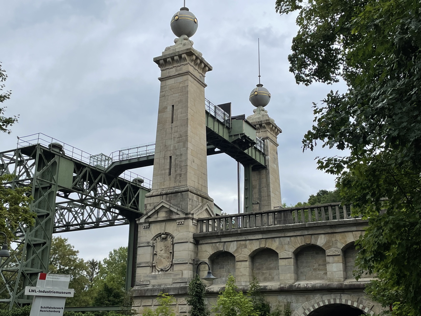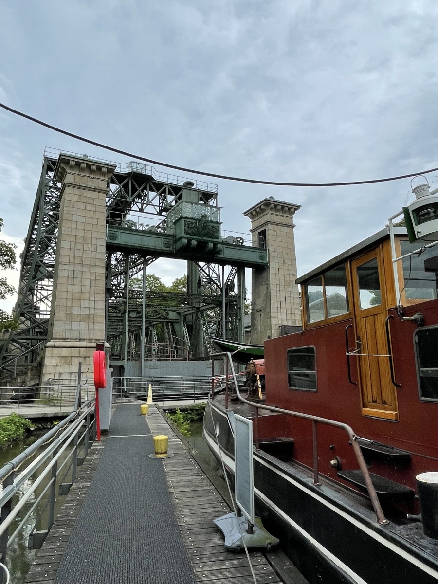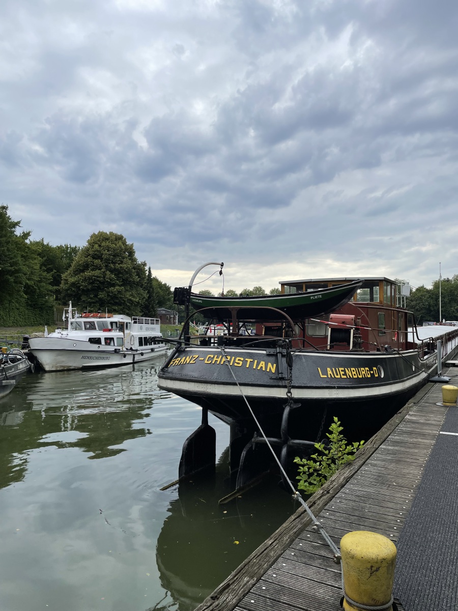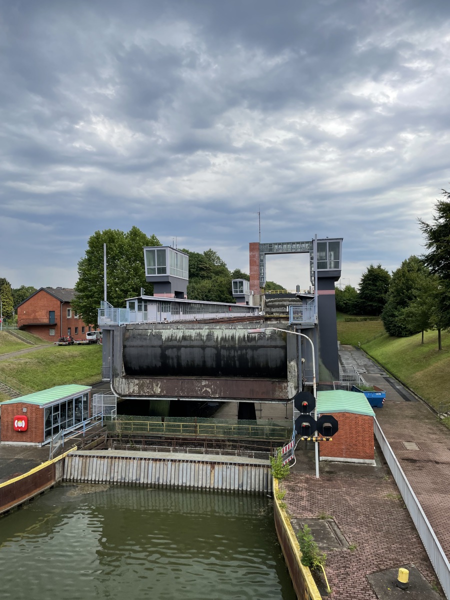 Nach dem Frühstück geht es zu unserer ersten Sehenswürdigkeit. Wir sehen uns das alte und das neue Schiffshebewerk Henrichenburg und den Schleusenpark Waltrop an. Alles liegt nur wenige hundert Meter voneinander entfernt. Die Schiffshebewerke gehören zur Kanalstufe Henrichenburg der Bundeswasserstraße Dortmund-Ems-Kanal in Waltrop und sind nach der alten Gemeinde Henrichenburg benannt. Heute fließt der Schiffsverkehr nur noch durch die neue Schleuse. Alle Schleusen, auch die alte Schlachtschleuse, sind Teile des Schleusenparks Waltrop. Wir gehen zuerst zum alten Schiffshebewerk. Wir stehen davor und sind beeindruckt von seiner Größe. 14 Meter Höhe. 70 Meter lang, 8,80 Meter breit und 60 Jahre war die Anlage in Betrieb. Dieses war ein Schlüsselbauwerk des Dortmund-Ems-Kanal, denn mit seiner Fertigstellung konnte der Kanal bis zum Dortmunder Hafen befahren werden. Dieses Schiffshebewerk ist das größte und spektakulärste Bauwerk und wurde zusammen mit dem Dortmund-Ems-Kanal von Kaiser Wilhelm II in Betrieb genommen. Heute ist dieses Hebewerk ein Museum und der untere Vorhafen wird als Marina genutzt. Das alte Schiffshebewerk ist eine Stahlfachwerkkonstruktion mit fünf Schwimmerschächten. Der Trog und die steinernen Oberhaupt- und Unterhaupttürme sind begehbar. Im ehemaligen Kessel- und Maschinenhaus sind Maschinen, Modelle und Bilder zu sehen. Im oberen Vorhafen liegen das Polizei- und Feuerlöschboot Cerberus und im unteren Vorhafen das Motorgüterschiff Franz-Christian mit der Ausstellung „Ein Arbeitsleben an Bord“ im Laderaum. Diese Ausstellung sehen wir natürlich an und stellen fest, dass die Ausstellung sehr interessant ist. Dann gehen wir zu dem leer geräumten Maschinenhaus in der einiges digital wieder zum Leben erweckt wurde. Die digitale Präsentation bringt die Maschinen nicht nur scheinbar in den Raum zurück, sondern ermöglicht auch tiefere Einblicke in den Aufbau und die Funktionsweise der Technik. Im Kesselhaus geht es um die Geschichte des Hebewerks und die Welt der Binnenschifffahrt. An vielen Stellen wird uns durch Videos die Funktionsweise des Hebewerks und der Schiffsdampfmaschine gezeigt und erklärt. Wir können sogar virtuell den Rhein, den Dortmund-Ems-Kanal oder den Rhein-Herne-Kanal bereisen und dabei die Geschwindigkeit selbst steuern. Es gibt auch viele Exponate, die von Schiffsmodellen bis zu einem gesprengten Tresor, den die Diebe nach ihrer Tat im Kanal entsorgt haben, reichen. Wir sehen uns weiter das Schiffshebewerk an und gehen dann durch einen Turm nach oben zum Museum Oberwasser. Auf einem 400 Meter langen Kanalabschnitt im Anschluss an den oberen Vorhafen zeigt das Museum eine europaweit einzigartige Sammlung historischer Schiffe, darunter der Dampfschlepper Fortuna und das einzige europaweit noch existierende Dampftankschiff Phenol. Dazu befinden sich hier schwimmende Arbeitsgeräte, eine Anlege- und Verladestelle für Güterschiffe, eine Hellinganlage zur Schiffsreparatur mit historischem Drehkran und der Kanaldurchlass mit altem Klapptor sowie eine historische Hubbrücke. Im rekonstruierten Hafengebäude kann man sich wechselnde Sonderausstellungen ansehen. Wir bekommen eine Hochzeit zu sehen, die hier am Museum im Standesamt Zimmer geheiratet haben und nun schöne Erinnerungsfotos machen. Wir gehen einmal um das Museumsgelände herum. Jetzt geht es wieder über eine Treppe im anderen Turm herunter. Diese sind sehr schmal und deshalb muss man auf der einen Seite rauf und der anderen Seite wieder runter. Wir gehen noch mal in das Schiffshebewerk und um das Schiffshebewerk herum und sehen wie das Fahrgastschiff Henrichenburg gerade los fährt. Denn heute ist das Wahrzeichen ein beliebtes Ausflugsziel mit Schiffstouren.