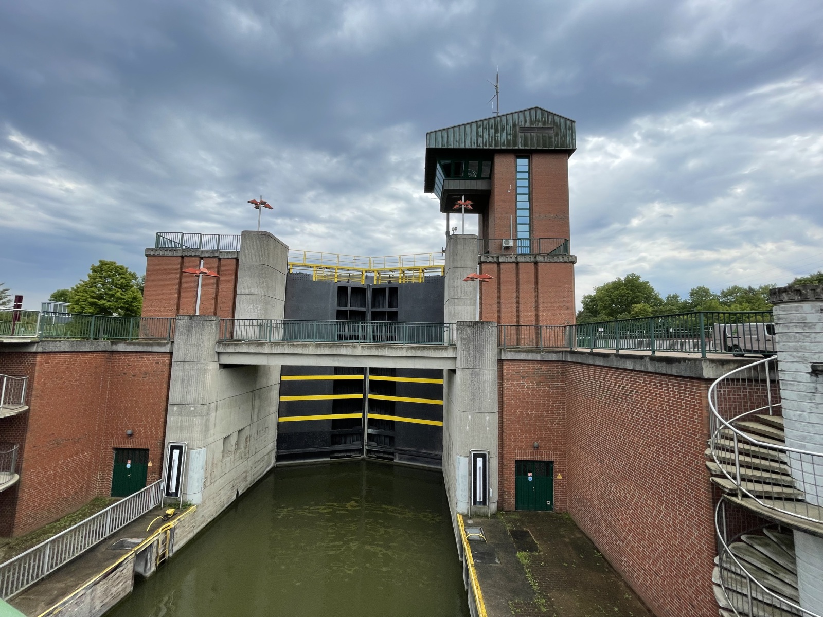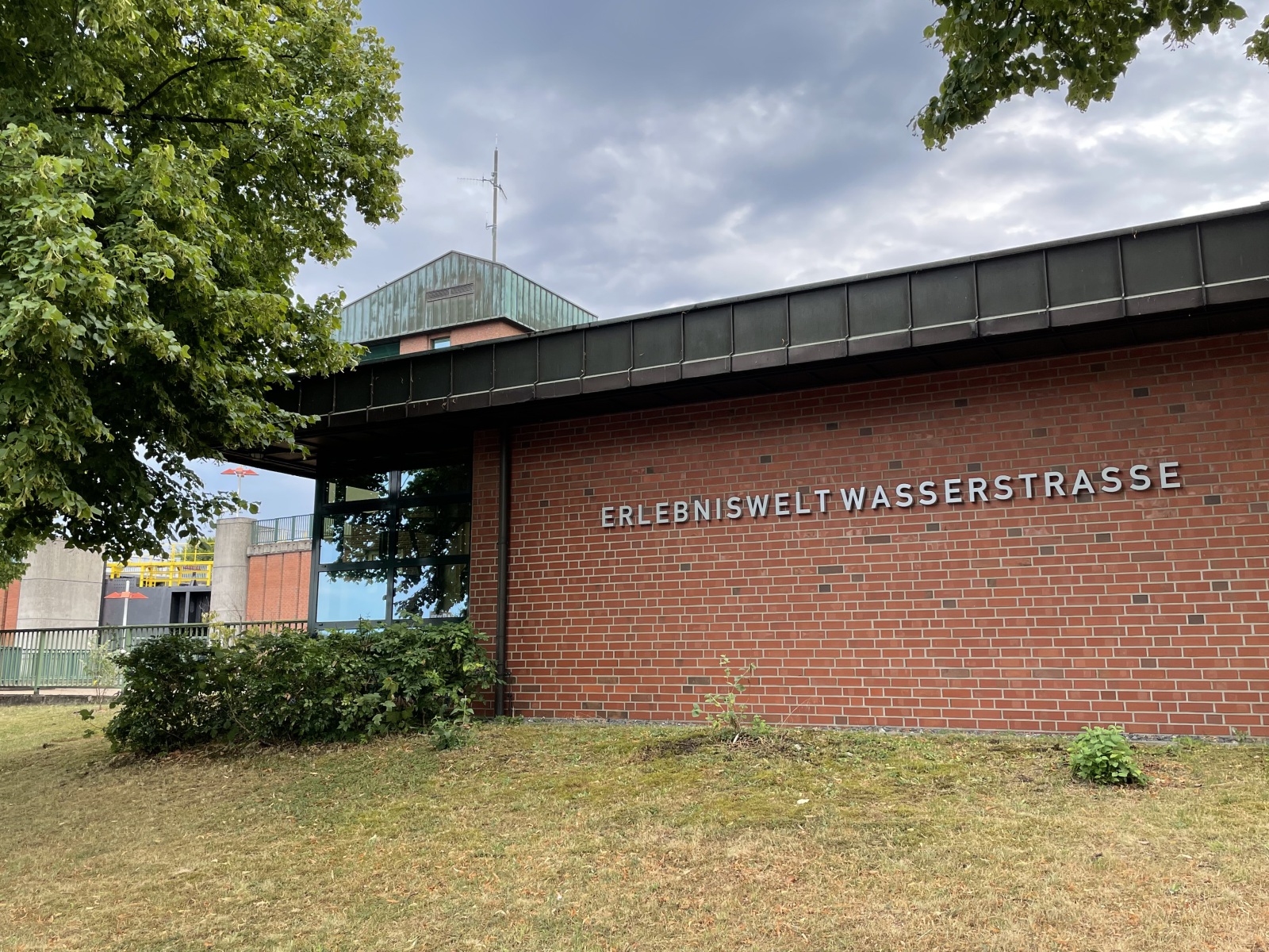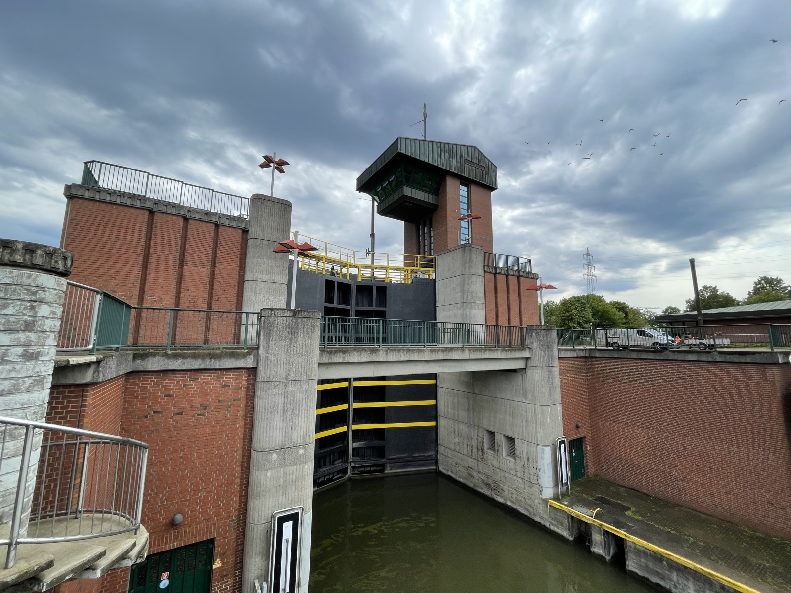 Wir gehen weiter und kommen zum neuen Hebewerk. Dieses ist allerdings heute auch schon wieder stillgelegt. Sein Trog hat eine Länge von ca. 90 Metern und eine Breite von 12 Metern. Dann gehen wir zur neuen Schleuse. Leider können wir diese nur von der Straße aus ansehen. Das modernes Ziegelsteingebäude sieht aus wie ein Flughafen Tower. Bei einer Länge von 190 Meter, einer Kammerbreite von 12 Meter und einer Wassertiefe von 4 Meter können jetzt auch große Schiffe wie110 Meter lange Motorgüterschiffe bzw. bis zu 185 Meter lange Schubverbände mit einem Gewicht von 2.300 Tonnen bzw. 3.600 Tonnen die Kanalstufe Henrichenburg /Waltrop passieren. Auch diese neue Schleuse wurde mit Sparbecken ausgestattet, um einen Teil der Wassermengen beim Leeren der Schleusenkammern aufzufangen, um es später wieder zurückzuleiten. Heute wird der gesamte Schiffsverkehr über die neue Schleuse abgewickelt.