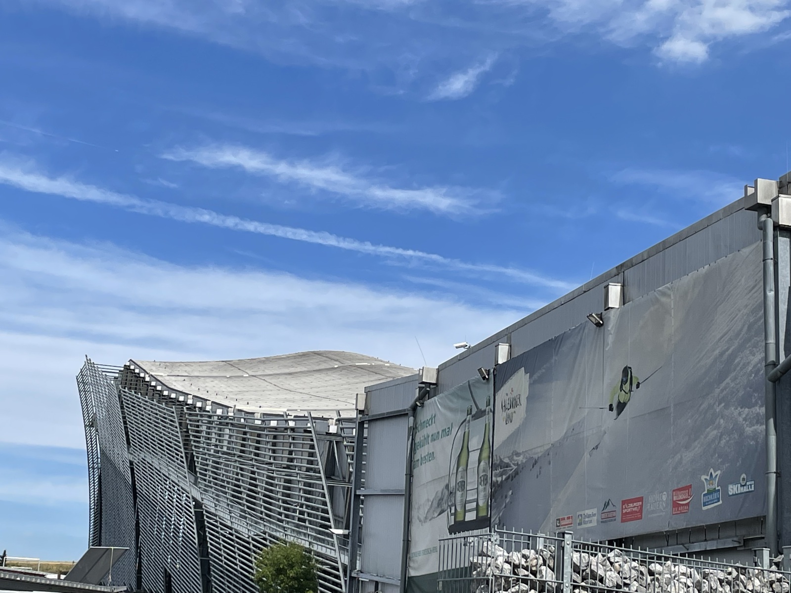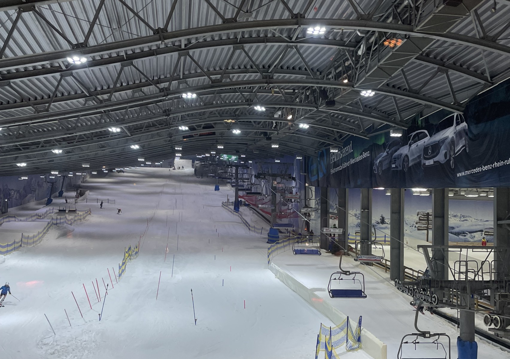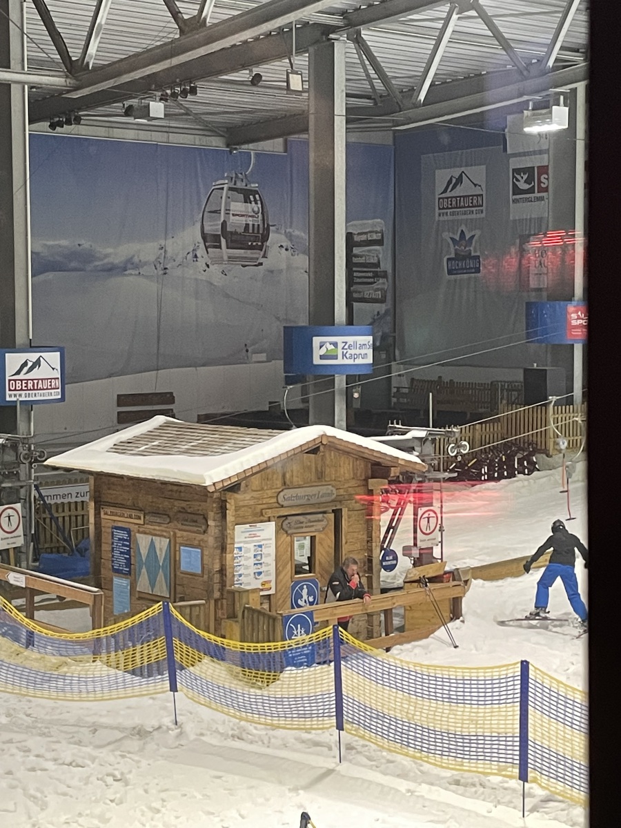 Auf dem Weg zu unseren Freunden ist uns an der Autobahnabfahrt ein ziemlich großes Gebäude aufgefallen. Wir haben danach gefragt und erfahren, dass es sich um die Ski Halle Neuss handeln und sie bieten uns an, uns die Halle mal zu zeigen. Das Angebot haben wir natürlich gleich angenommen. Der Alpenpark Neuss ist ein Aktiv-Freizeitpark am Rand der Stadt Neuss in Nordrhein-Westfalen. Diese im Jahr 2001 eröffnete Skihalle des Freizeitparks war die erste derartige Einrichtung in Deutschland. Sie bildet das Herzstück des Alpenpark Neuss. Zum Alpenpark gehören neben den Wintersportanlagen außerdem diverse Gastronomie, ein Hotel, ein Kletterpark, zwei Almgolfplätze und ein Fun Fußball Parcours. Wir gehen in die Halle, finden gemütlicher Hüttenatmosphäre vor und suchen uns einen Platz vor einem großem Fenster. Von hier aus haben wir einen guten Blick in die Skihalle und können beim Zusehen auch noch sitzen. Welches Angebot. Es ist ganz schön was los hier. Wir erfahren, dass der höchste Punkt der Skipiste in der Halle bei 110 Meter ist, eine Länge von 300 Meter und eine Breite von bis zu 60 Meter. Das Gefälle der Piste beträgt bis zu 28 %. Neben der Hauptpiste existiert in einem Anbau eine kleinere, 100 Meter lange und bis zu 40 Meter breite Nebenpiste für Anfänger und Kinder und zwei Rodelbahnen. Die Halle verfügt über zwei Schlepplifte und vier Laufbänder mit einer Gesamtkapazität von bis zu 5000 Personen pro Stunde. Unter der Hallendecke sind 12 Schneekanonen installiert, die nachts die Pisten mit Kunstschnee berieseln. Wer Lust hat kann sogar in der eigenen Skischule einen Ski- oder Snowboard-Kurs für Anfänger besuchen. Ich weiß gar nicht mehr genau wie lange wir zugesehen haben, aber irgendwann kam der Durst und sind wir nach draußen in den Biergarten um was zu trinken. Ich bin erstaunt darüber, wie viele Menschen hier das Sportangebot wahrnehmen und wie viele Familien sich hier vergnügen. Man erzählt uns, dass selbst Profis der Ski-Nationalmannschaften des Deutschen Skiverbandes die hervorragenden Bedingungen für ihr Training nutzen. Also hier gibt es 365 Tage aktiven Spaß für Jung und Alt, Familien und Gruppen und egal wie warm das Wetter ist: Am Niederrhein liegt immer Schnee.