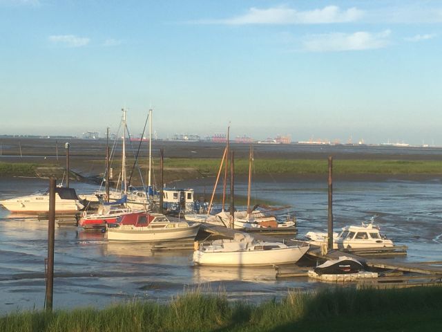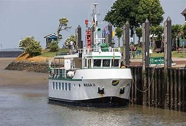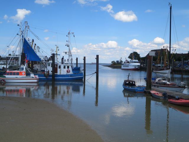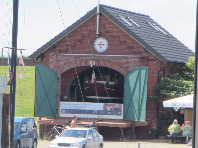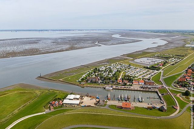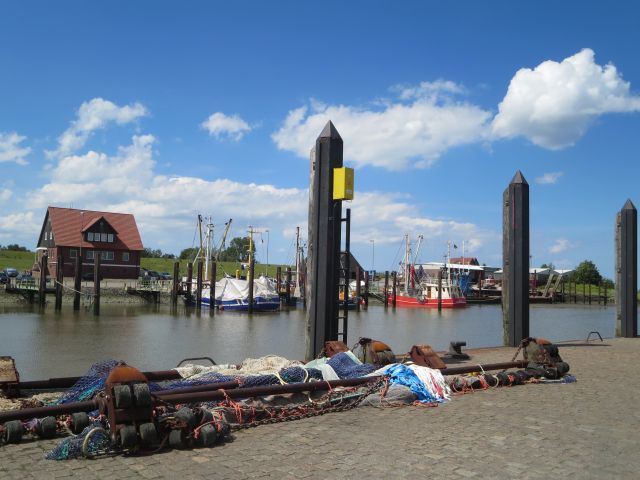 Wir gehen weiter zum Hafen. Es sieht schon irgendwie lustig aus, wenn die Krabbenkutter ohne Wasser im Watt stehen. Bei Flut fahren von hier die traditionellen Kutter zum Krabbenfang raus auf die Nordsee. Wenn sie nach erfolgreichem Fang wieder in den Sielhafen einlaufen, können die Krabben frisch vom Kutter gekauft werden. Diesen Genuss lässt man sich nicht entgehen. Hier steht auch die MS WEGA II. Mit diesem Schiff kann man Ausflüge in die faszinierende Welt des Wattenmeers unternehmen. Zum Beispiel in Richtung Containerterminal Bremerhaven, zum Leuchtturm Roter Sand oder zum Kormoranturm und den Seehundbänken. Wir wollen auch einen Ausflug machen, aber leider ist es dieses Wochenende nicht möglich. Na ja, ist ja nicht so schlimm. Wir sind ja nicht das letzte Mal hier. Gegenüber vom Hafen befindet sich die Rettungsstation vom DGzRS und von hier aus kann man die die ganze Ortschaft übersehen. Der Hafen ist sozusagen das Zentrum der Ortschaft. Alle wichtigen Dinge finden um den Hafen herum statt. Ein Postkasten befindet sich direkt am Hafenmarkt. Außerdem ein Fischladen, ein Supermarkt und nicht zu vergessen das Museum Nationalparkhaus Fedderwardensiel. Wir suchen uns ein schönes Plätzchen und gönnen uns ein Eis. Auf dem Rückweg zum Platz gehen wir noch mal zum Yachthafen, sehen uns die Segelboote an und werfen auch noch mal Blick rüber nach Bremerhaven. Wenn es schon etwas dunkel ist und in Bremerhaven die Lampen alle an sind, sieht es besonders schön aus.