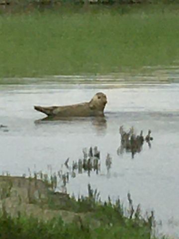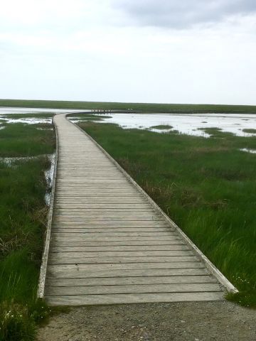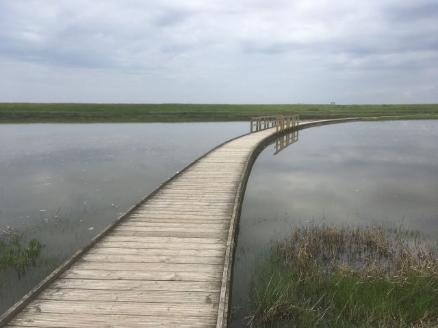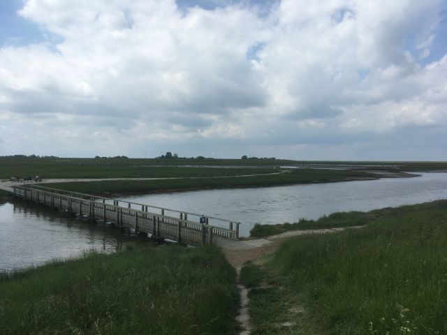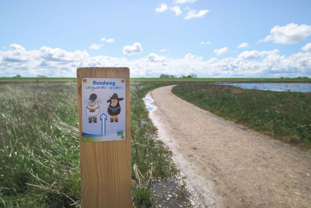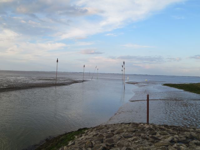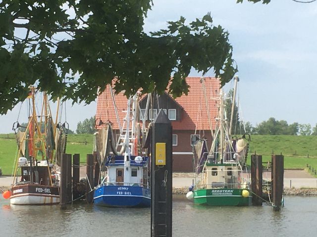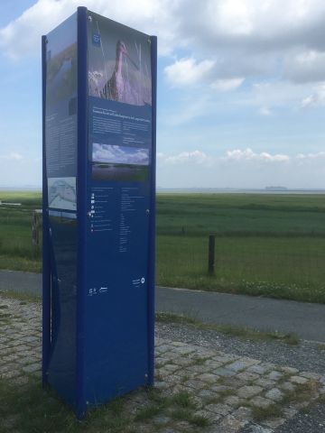Wir wollen uns natürlich auch zum Langwarder Groden. Ausgeschildert ist dieser Rundweg mit netten Schildern, auf den Fietje und Fiete abgebildet sind und uns den Weg weisen. Der Langwarder Groden liegt zwischen Fedderwardersiel und Langwarden. Wir fahren mit dem Fahrrad bis zur ersten Station und lesen uns erst einmal das große Hinweisschild durch. Ein ca.4 Kilometer langer Rundwanderweg und ein 2 Kilometer langer Naturentdeckungspfad bieten uns Naturerlebnisse der besonderen Art. Von mehreren Beobachtungsständen, Stegen und einer Brücke, die auf den Vordeich führt, lässt sich der ständige Wechsel zwischen Ebbe und Flut besonders gut überblicken. Auf zahlreichen Infotafeln werden wir mehr zu Natur und Landschaft erfahren. Interaktive Modelle laden zum Entdecken dieses interessanten Lebensraums ein. Na dann mal los. Ich muss sagen, es ist wirklich schön und so Natur belassen. Ein Bohlenweg führt direkt hinein in 70 Hektar Salzwiesenentwicklungsfläche und ermöglicht uns so faszinierende Einblicke in die Tier- und Pflanzenwelt des Wattenmeeres. Eine ca. 35 Meter lange Holzbrücke führt über das erweiterte Sieltief. Um uns herum flattern Schmetterlinge, schnattern Gänse und wir hören die Vögel singen. So ruhig ist es hier. Wir sehen sogar einen Seehund, der hier ganz entspannt in der Sonne liegt. Jetzt sind wir durstig und sehen, dass es hier gleich in der Nähe in Feldhausen eine Deichschäferei gibt, zu der auch ein Melkhus gehört. Da fahren wir erst einmal hin. Hier gibt es leckere regionale Milchprodukte wie Eis, Butjadinger Creme oder Quarkspeise mit Früchten. Wir suchen uns was aus und hinterlegen das Geld für Eis und Getränke in die bereitgestellte Kasse. Das war lecker. Auf dem Rückweg kommen wir am Sieltor vorbei und hier befindet sich ein großes Fischgeschäft der Butjadinger Fischereigenossenschaft, in dem wir uns fangfrischen Fisch fürs Abendbrot holen. Denn heute gibt es Fischplatte.