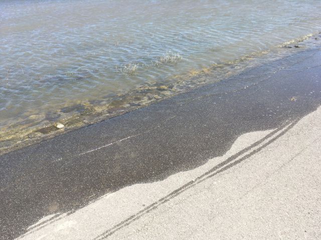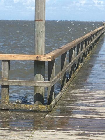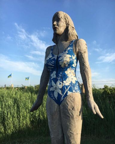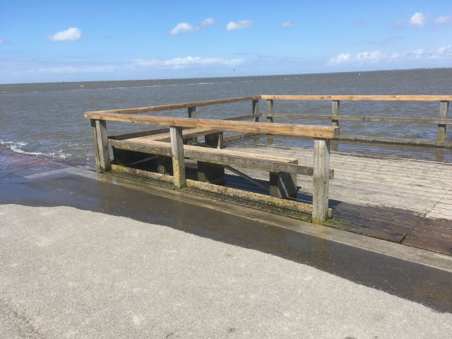 Da es recht windig ist und viele Kitesurfer auf dem Wasser sind, gehen wir noch mal zur Promenade. Hier ist im Wattenmeer eine Kitesurfzone ausgewiesen. Das Wasser ist so stark in Bewegung, das sogar die Wellen das Wasser auf die Promenade peitschen. Wir müssen richtig aufpassen, damit wir uns keine nassen Füße holen. Wir gehen bis zum Steg und sehen rechts eine lebensgroße Frauenfigur im Badeanzug aus Eiche. Das ist die Die Badende. Sie gehört zu den anderen Skulpturen die hier an der Kunst-Promenade stehen.