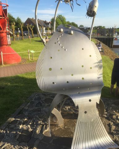 Es gibt natürlich auch noch viele andere Sehenswürdigkeiten in Fedderwardersiel, die man sich hier ansehen kann. Am Hafen sieht man die grüne Glockentonne und am Deich steht eine alte Hafenbahn. Wer sich über die Besonderheiten seiner Urlaubsregion informieren will, für den gibt es in hier das Nationalpark-Haus Museum Fedderwardersiel mit vielen spannenden Ausstellungen und Aktionen rund ums Watt und zur Geschichte Butjadingens. Auch der Rettungsschuppen und das ehemalige Rettungsboot Wilhelmine Wiese muss man sich mal ansehen. Dann ist da das Alte Hafenmeisterhaus. Es war, wie der Name schon sagt, der Sitz des Hafenmeisters. Fedderwardersiel war damals noch ein bedeutender Handelshafen, denn die Außen Weser verlief noch auf der Butjadinger Seite. Der Dachboden des Hauses wurde als Getreidespeicher genutzt. Das Korn wurde über eine Dachgaube hinein und hinaus transportiert. Auch sehr interessant ist das Sieltor. Besonders ist der große Stuhl in Form einer Scholle. Und nicht zu vergessen, überall Schafe. Sind ja auch sehr nützlich und irgendwie niedlich.
